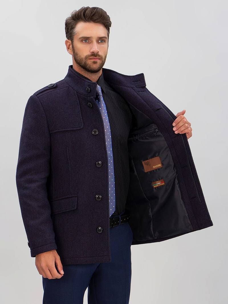 Пальто мужское утепленное прямого силуэта, воротник стойка, погоны, центральная супатная застёжка. Боковые карманы с клапаном. Рукав втачной двухшовный. Спинка с отрезной кокеткой, средним швом и одной шлицей. Длина изделия по спинке для роста 176 - 78см. На подкладке два внутренних кармана на молнии. Ткань верха: 100% шерсть. Подкладка: 50% вискоза, 50% полиэстер. Утеплитель: Термоплюс 160гр.