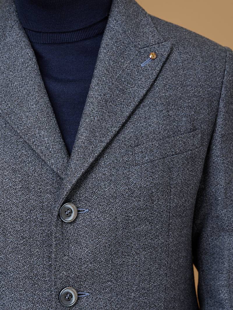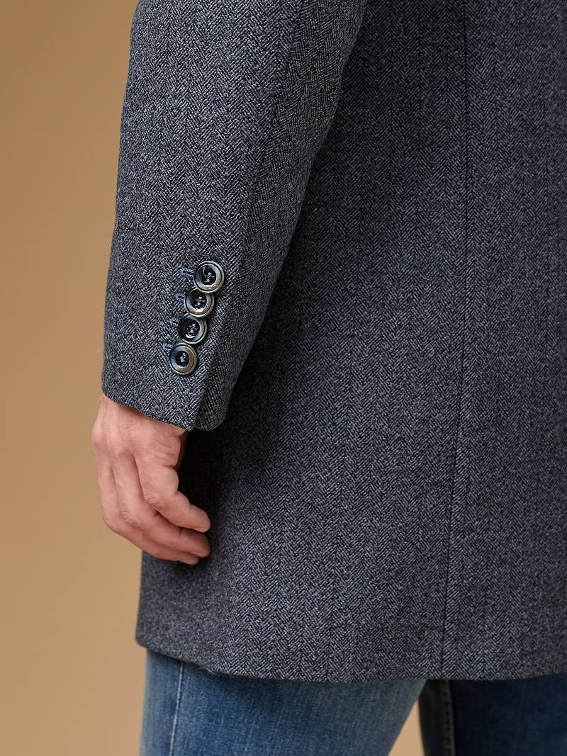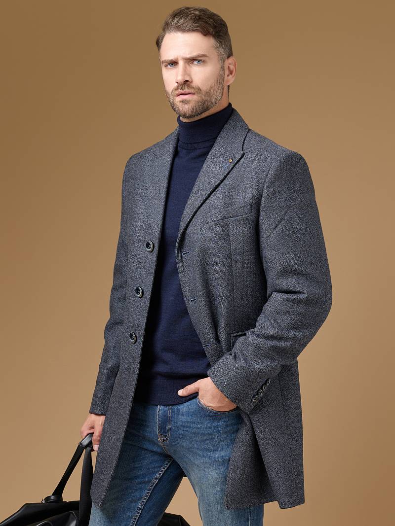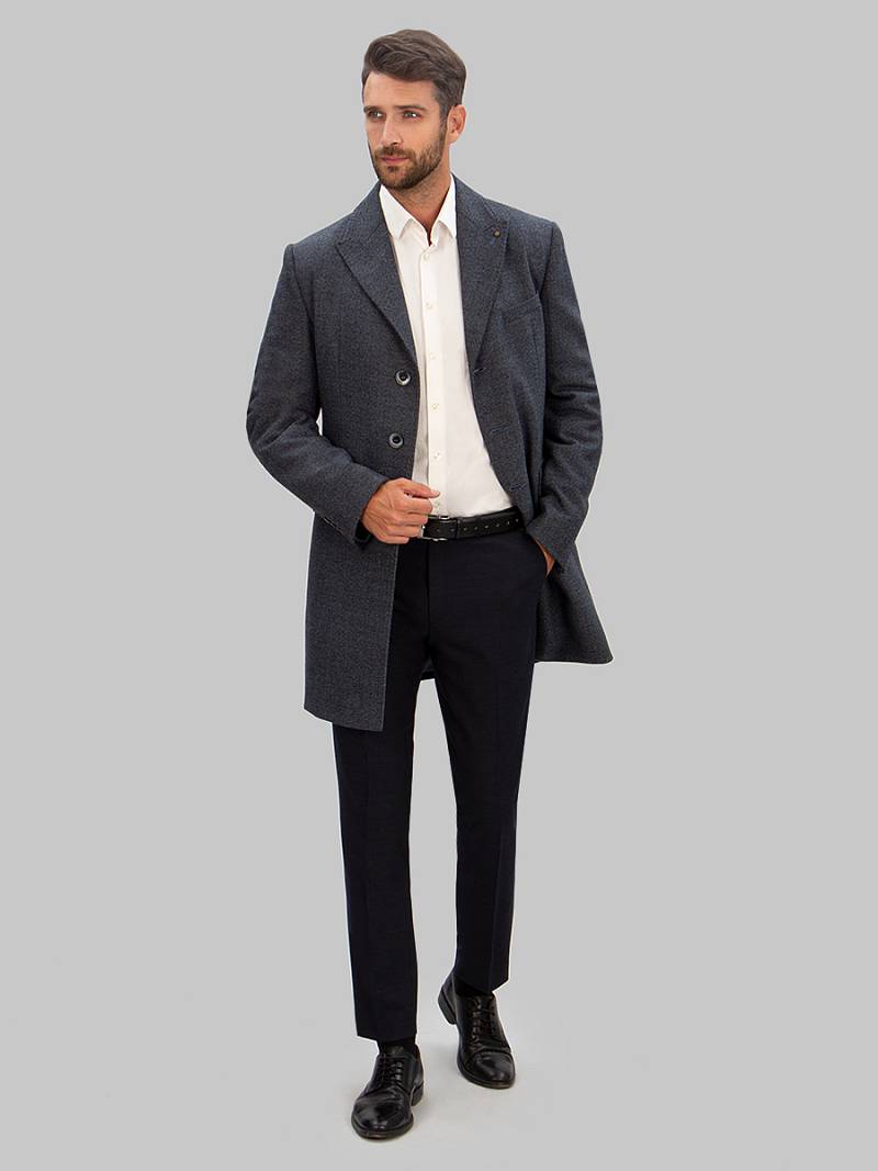 Пальто с центральной застежкой на 3 пуговицы, лацкан "ласточкин хвост", На полочках - боковые карманы с клапанами, нагрудный карман на левой полочке, Рукав втачной с локтевым швом, по низу рукавов шлица с пуговицами, Спинка со средним швом и шлицей. На подкладке два внутренних кармана на молниях. Фасонная петля на лацкане. Утеплитель 160гр.