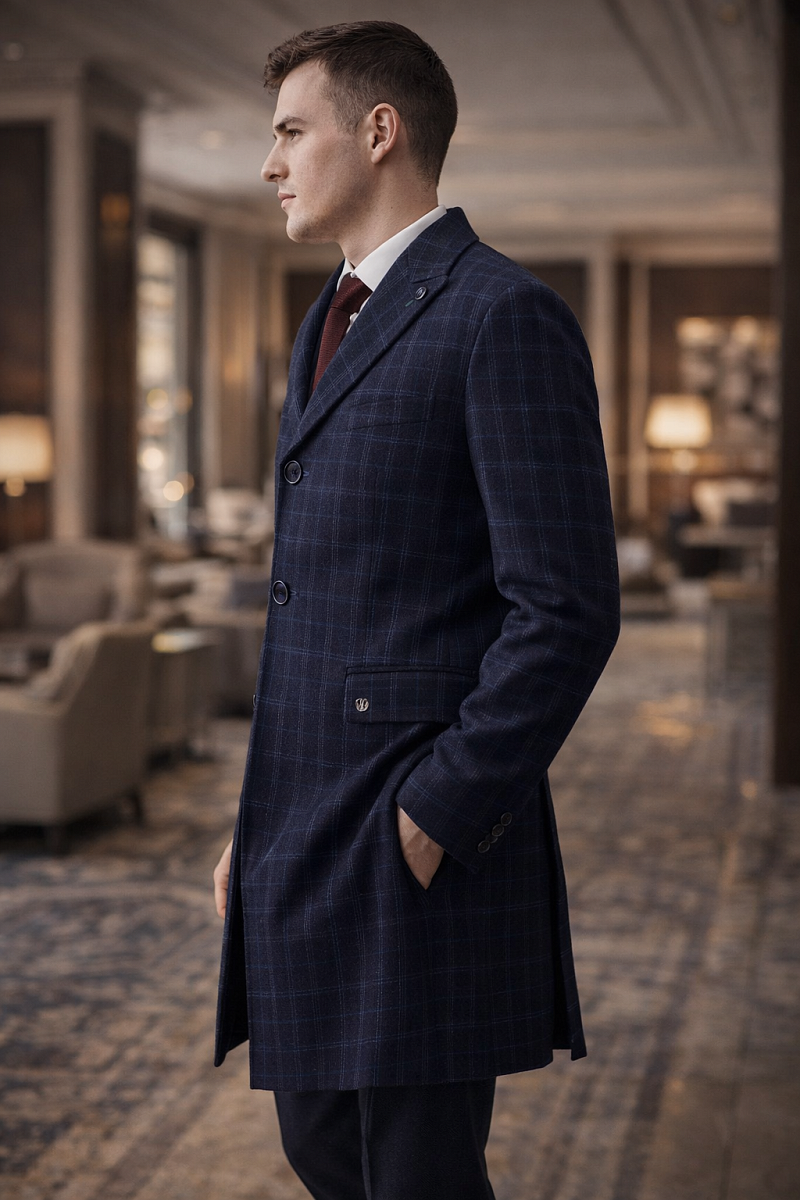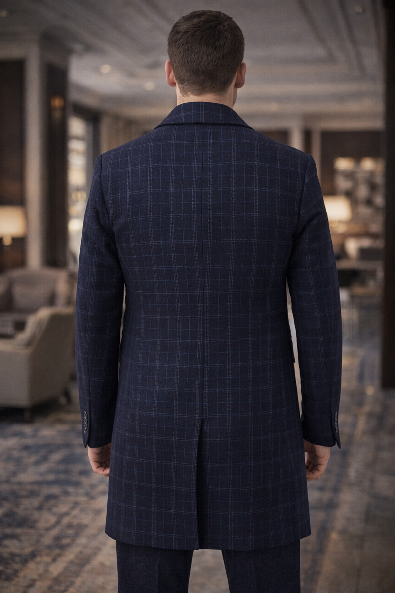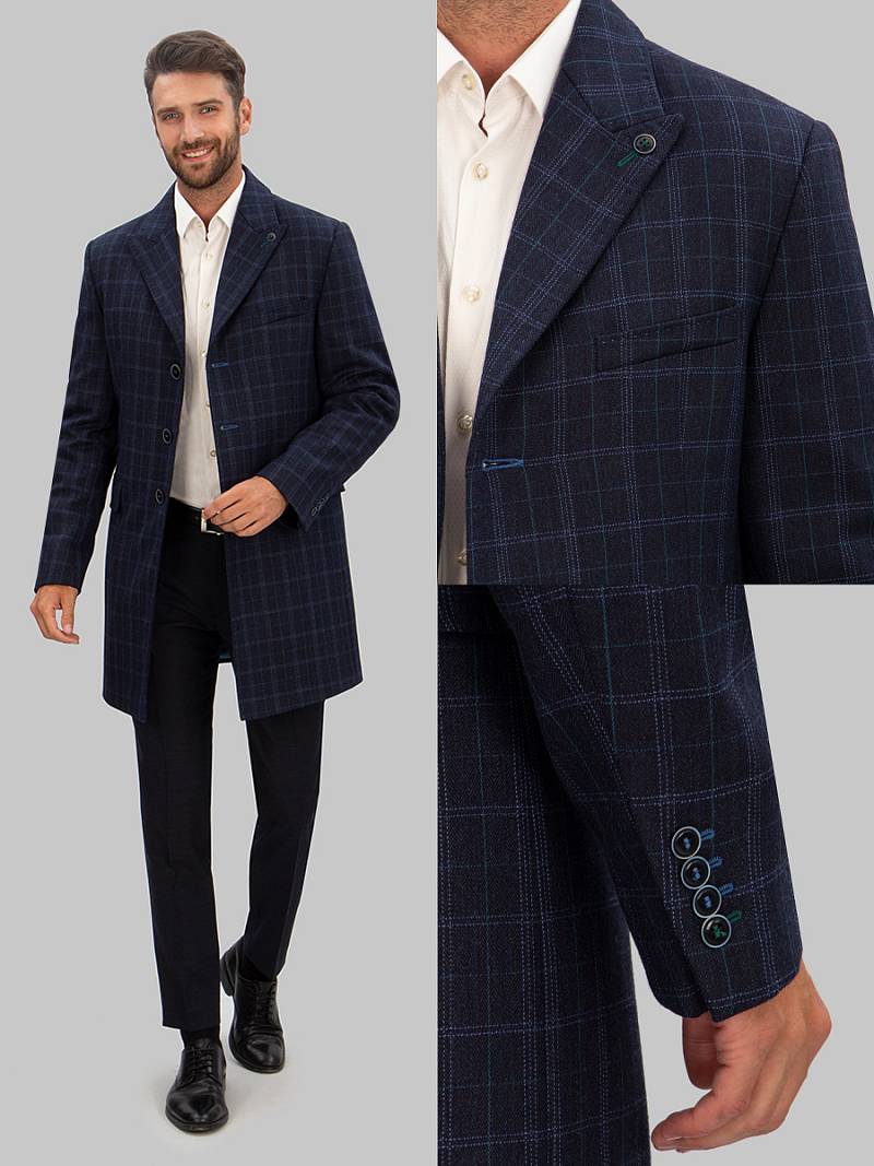 Пальто с центральной застежкой на 3 пуговицы, лацкан "ласточкин хвост", На полочках - боковые карманы с клапанами, нагрудный карман на левой полочке, Рукав втачной с локтевым швом, по низу рукавов шлица с пуговицами, Спинка со средним швом и шлицей. На подкладке два внутренних кармана на молниях. Фасонная петля на лацкане. Утеплитель 160гр.