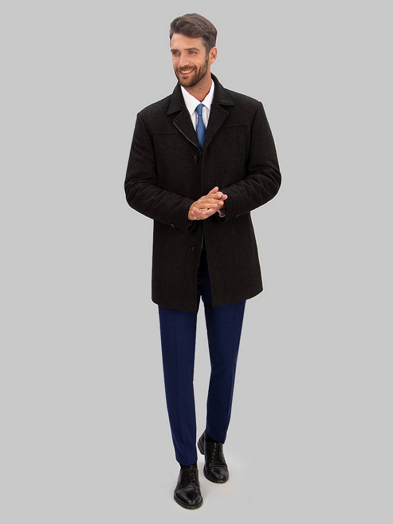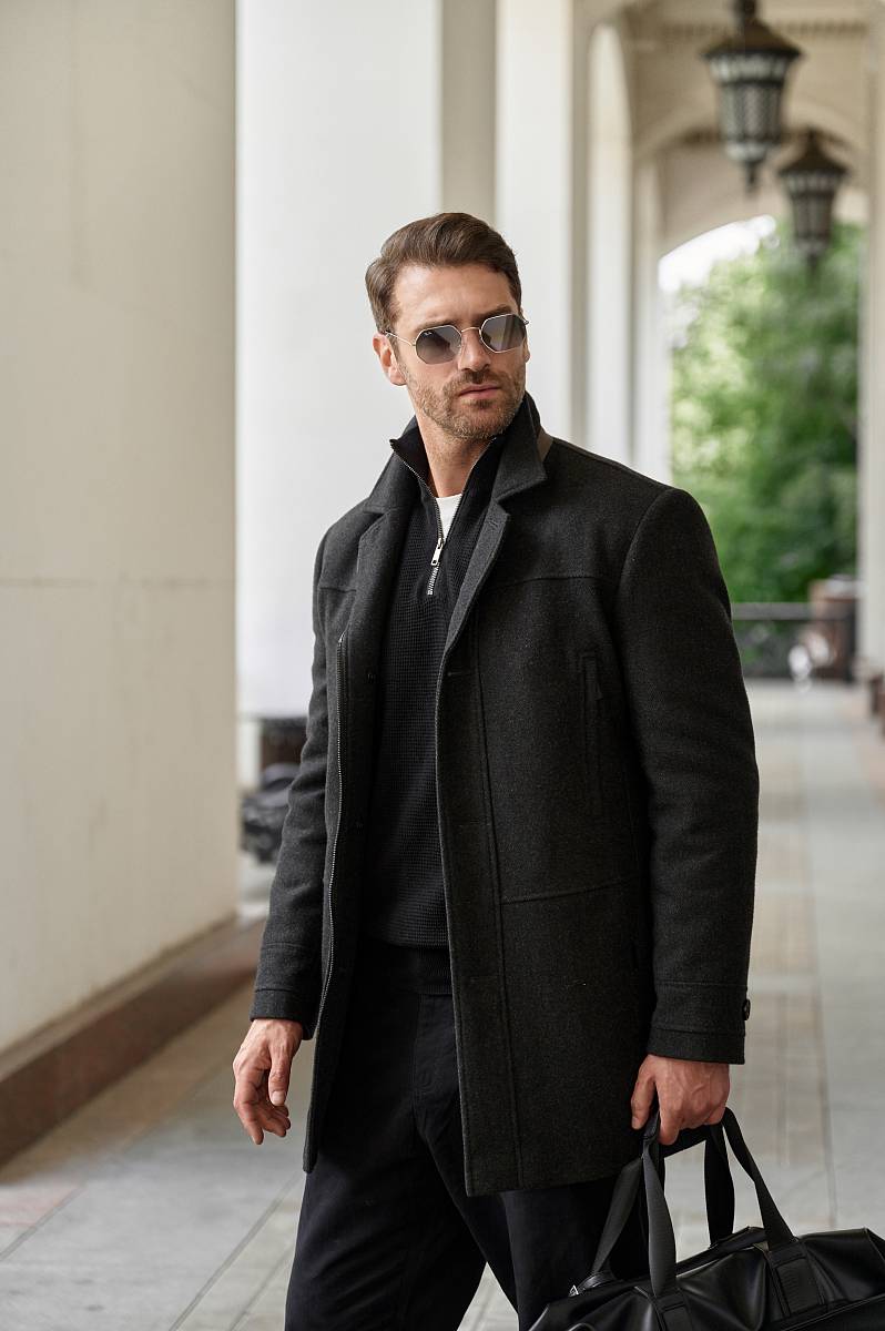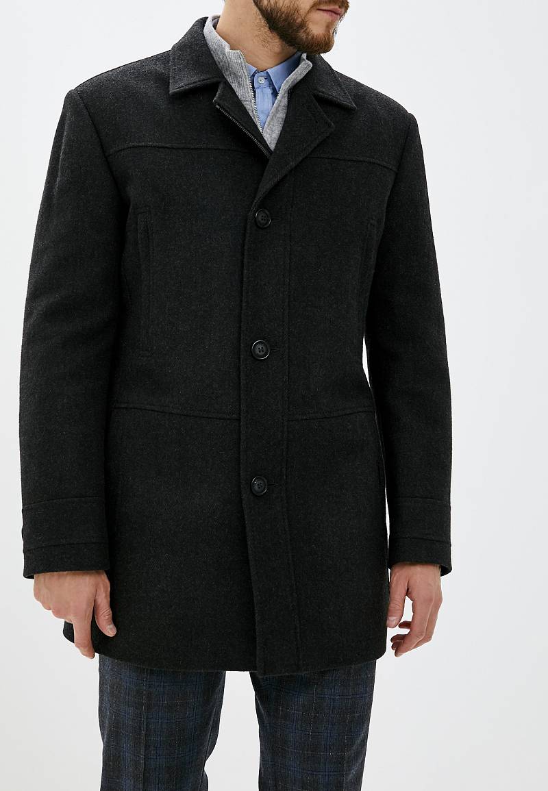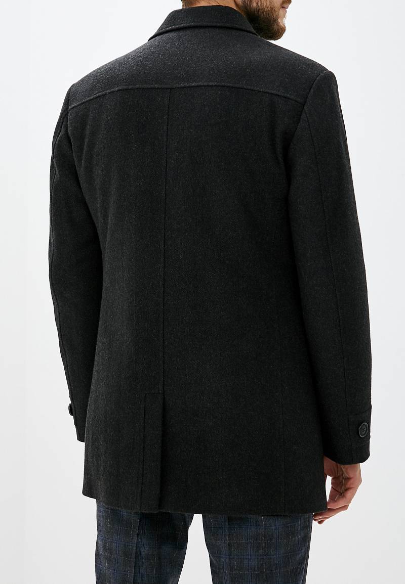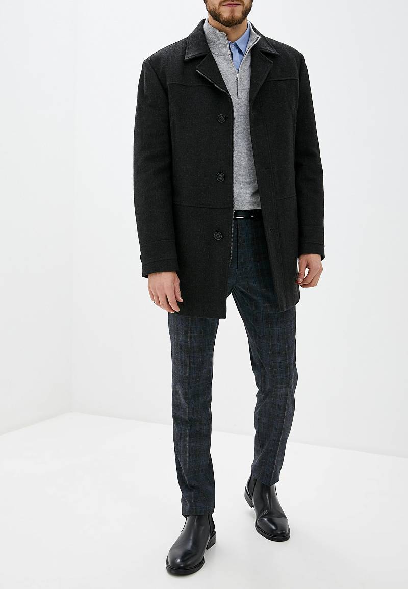 Пальто мужское утепленное с центральной застежкой на молнию и на 3 пуговицы. Полочки - резные состоят из трех частей: кокеток, средней части и нижней части. Спинка с кокетками и бочками. На средней полочке - верхние прорезные карманы на молнию. На нижней части полочек - боковые прорезные карманы с листочками. Спинка со средним швом и шлицей и рельефными швами. Рукава втачные, по низу передней части рукавов - притачная деталь-пата. В швах притачивания подбортов - отделочный кант.
