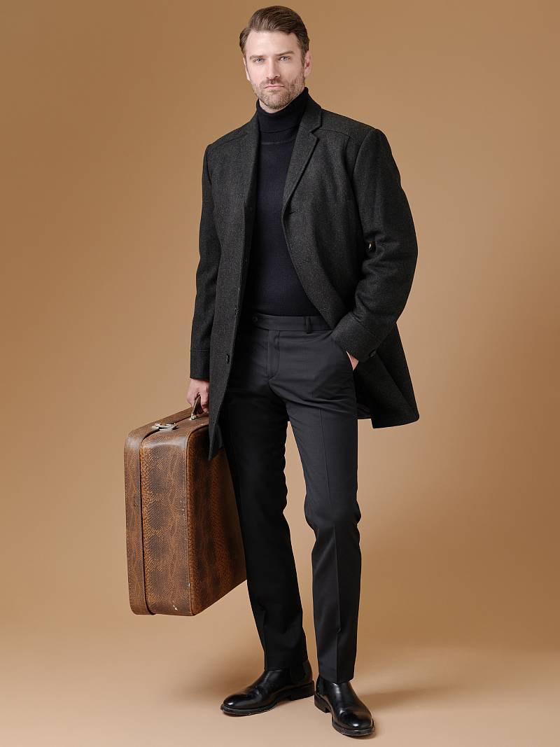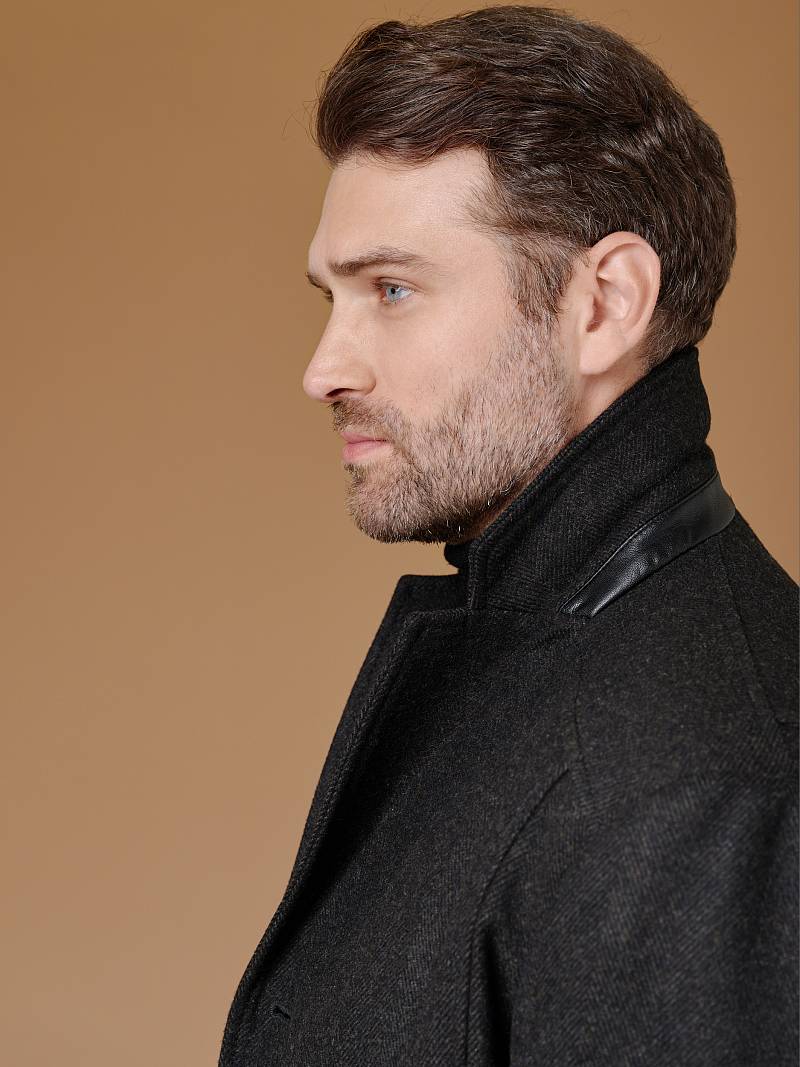 Пальто мужское утепленное с английским воротником. Полочки с кокетками без плечевых швов. В рельефных швах полочек - верхние прорезные карманы на молнию, нижние боковые прорезные карманы с листочками - наклонные. Спинка со средним швом и шлицей и рельефными швами. Рукава втачные, по низу передней части рукавов - манжеты с пуговицами. В швах притачивания подбортов - нагрудные внутренние карманы на молниях..