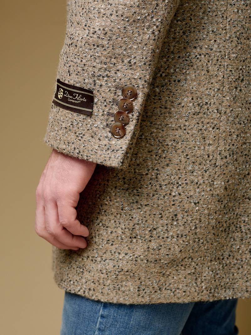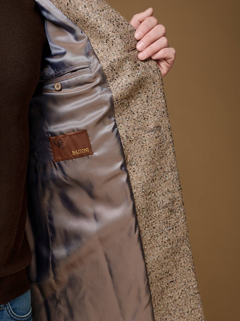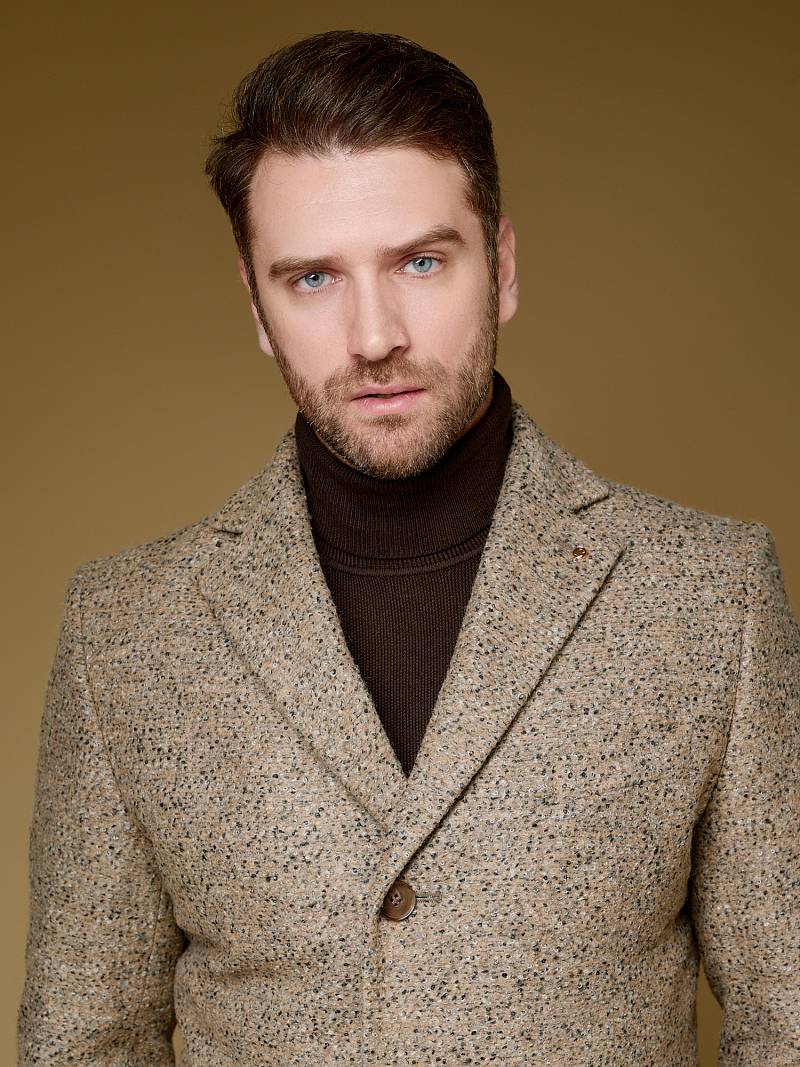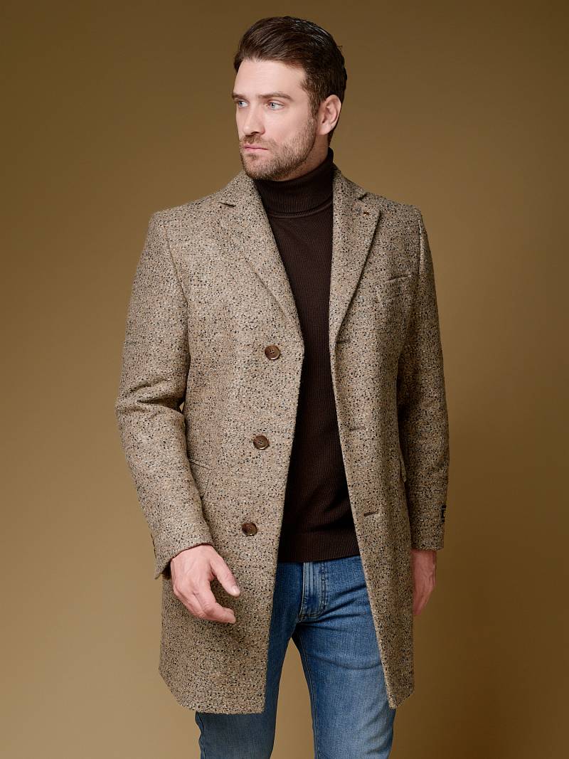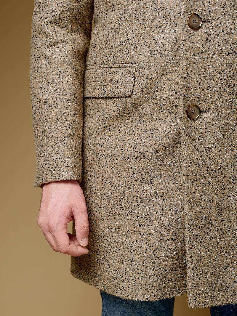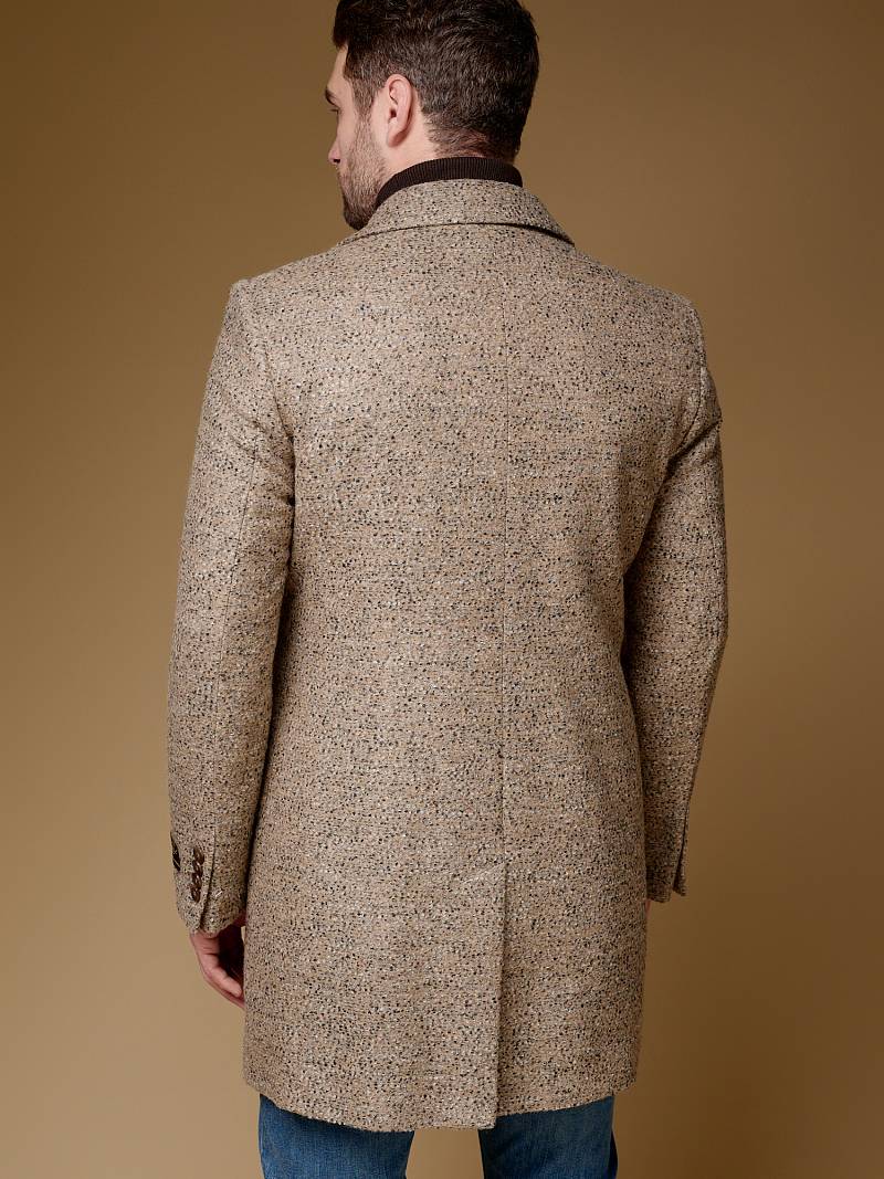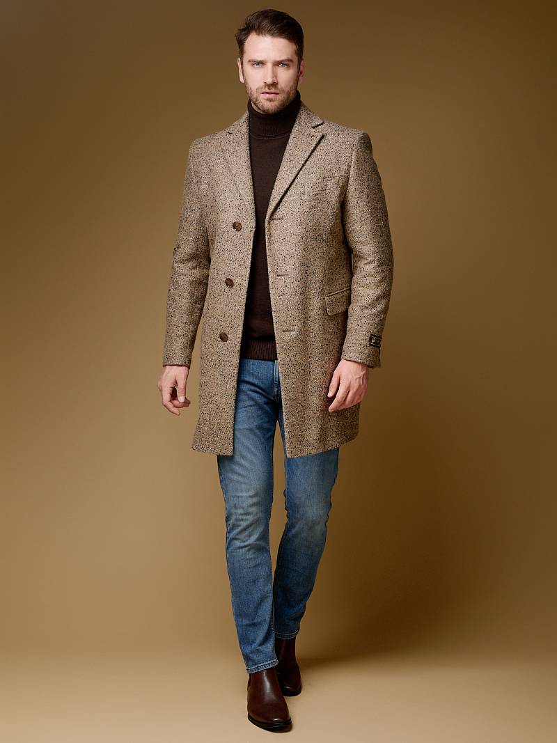 Классическое утепленное пальто (ПОЛУПРИЛЕГАЮЩИЙ СИЛУЭТ). Центральная застежка на 3 пуговицы, на полочке расположены два боковых кармана с клапанами и одной нагрудной листочкой. Рукав втачной, двухшовный, со шлицей и четырьмя декоративными пуговицами. По спинке расположена одна шлица. Пальто на подкладке с двумя внутренними карманами. Утеплитель: спинка-полочка-100г, рукава-60г.