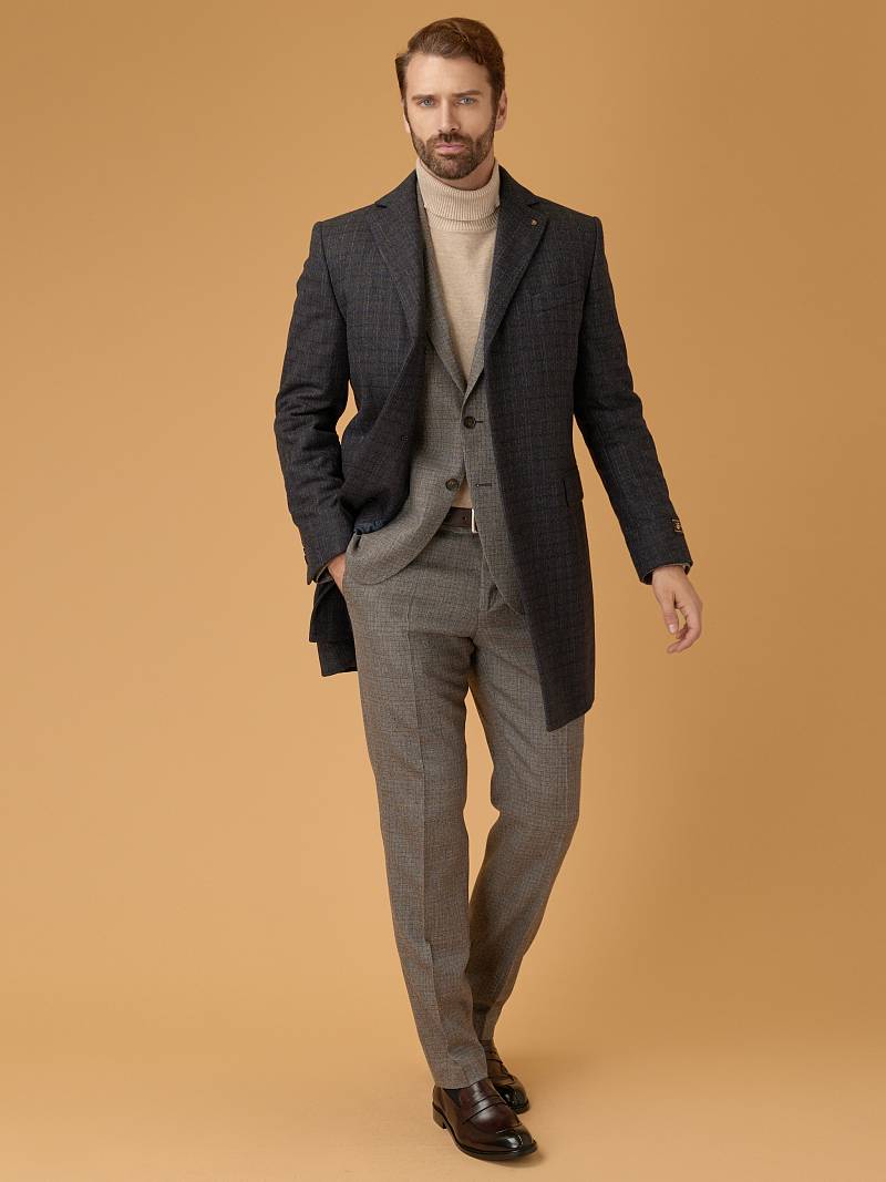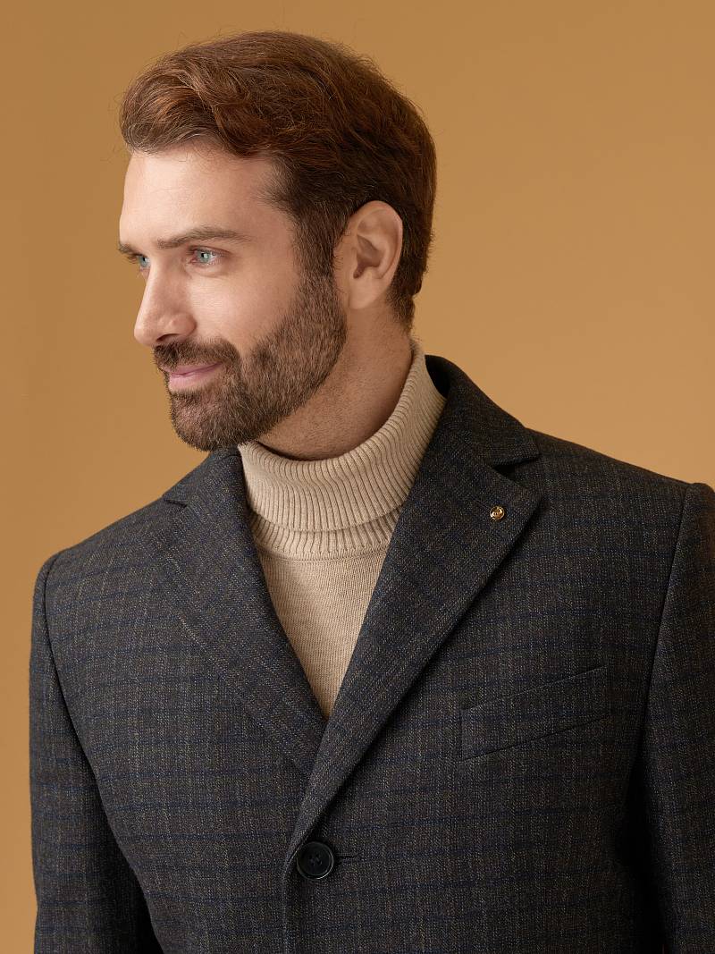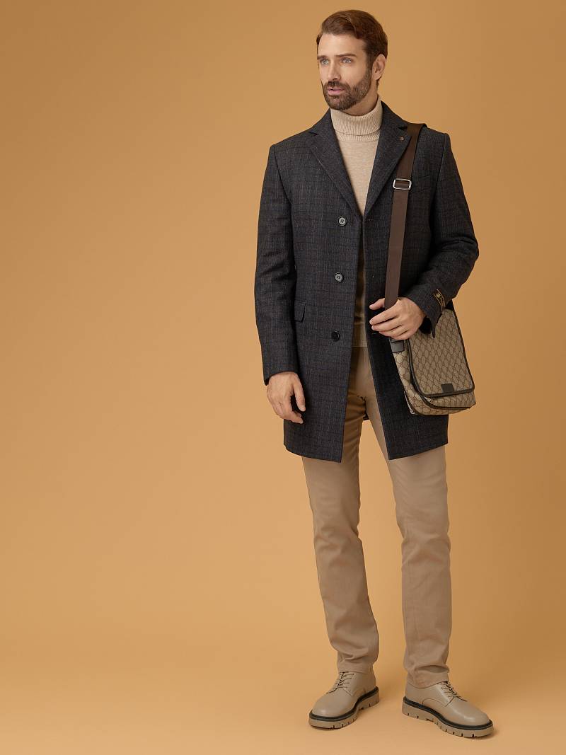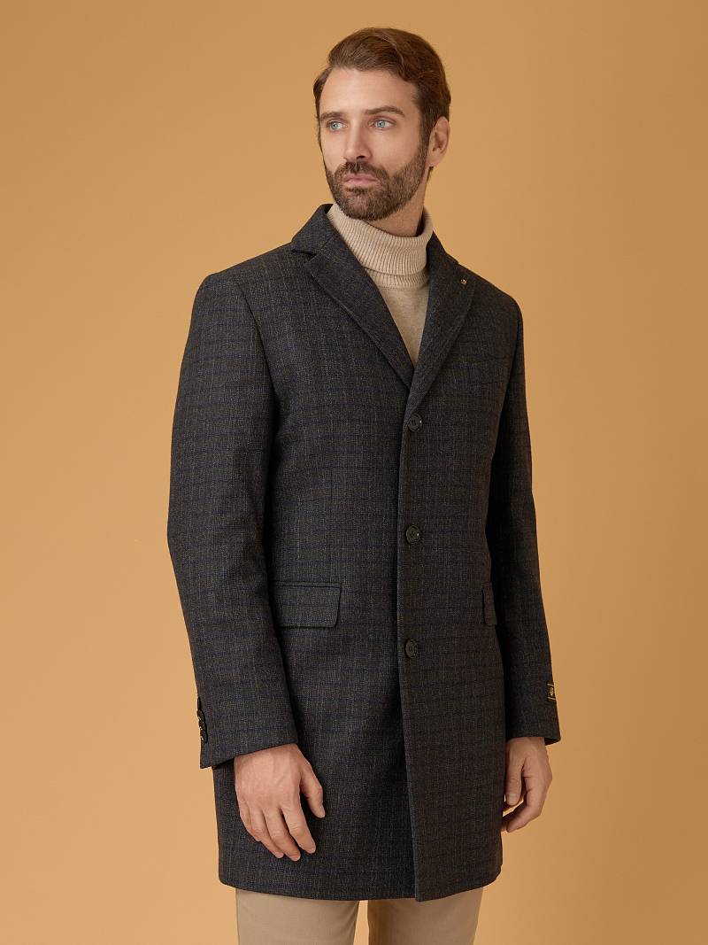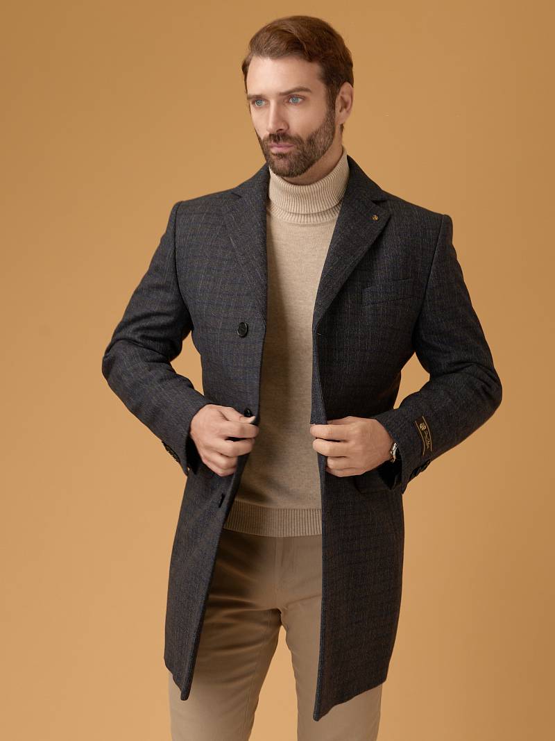 Классическое утепленное пальто (ПОЛУПРИЛЕГАЮЩИЙ СИЛУЭТ). Центральная застежка на 3 пуговицы, на полочке расположены два боковых кармана с клапанами и одной нагрудной листочкой. Рукав втачной, двухшовный, со шлицей и четырьмя декоративными пуговицами. По спинке расположена одна шлица. Пальто на подкладке с двумя внутренними карманами. Утеплитель: спинка-полочка-100г, рукава-60г.