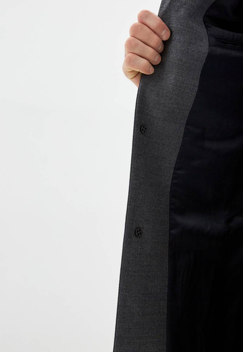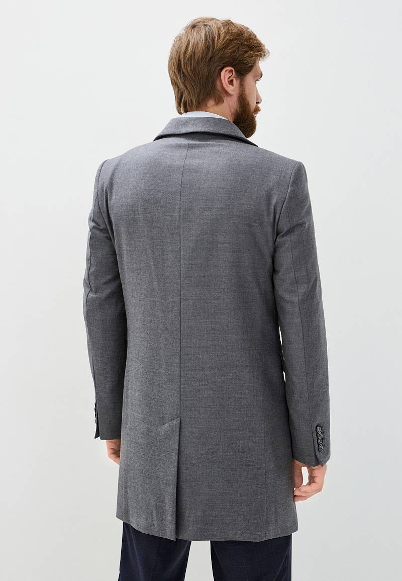 Пальто утепленное полуприлегающего силуэта на 3 пуговицы. Воротник - английский широкий с лацканами. На лацкане - декоративная петля с значком. На передних половинках пальто - один верхний нагрудный карман и два нижних кармана с клапанами. По спинке - в среднем шве - шлица. Рукава втачные, по низу рукавов - шлица на пуговицах. Длина изделия по спинке для размера 50/176 - 95см.