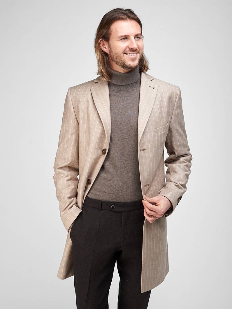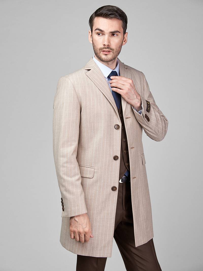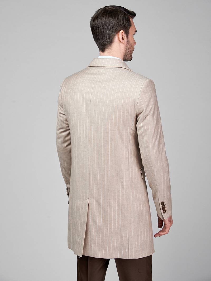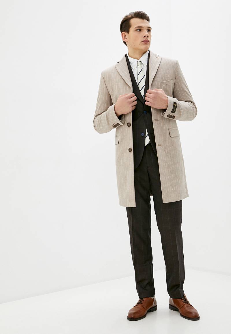 Пальто утепленное полуприлегающего силуэта на 3 пуговицы. Воротник - английский широкий с лацканами. На лацкане - декоративная петля с значком. На передних половинках пальто - один верхний нагрудный карман и два нижних кармана с клапанами. По спинке - в среднем шве - шлица. Рукава втачные, по низу рукавов - шлица на пуговицах. Длина изделия по спинке для размера 50/176 - 95см.