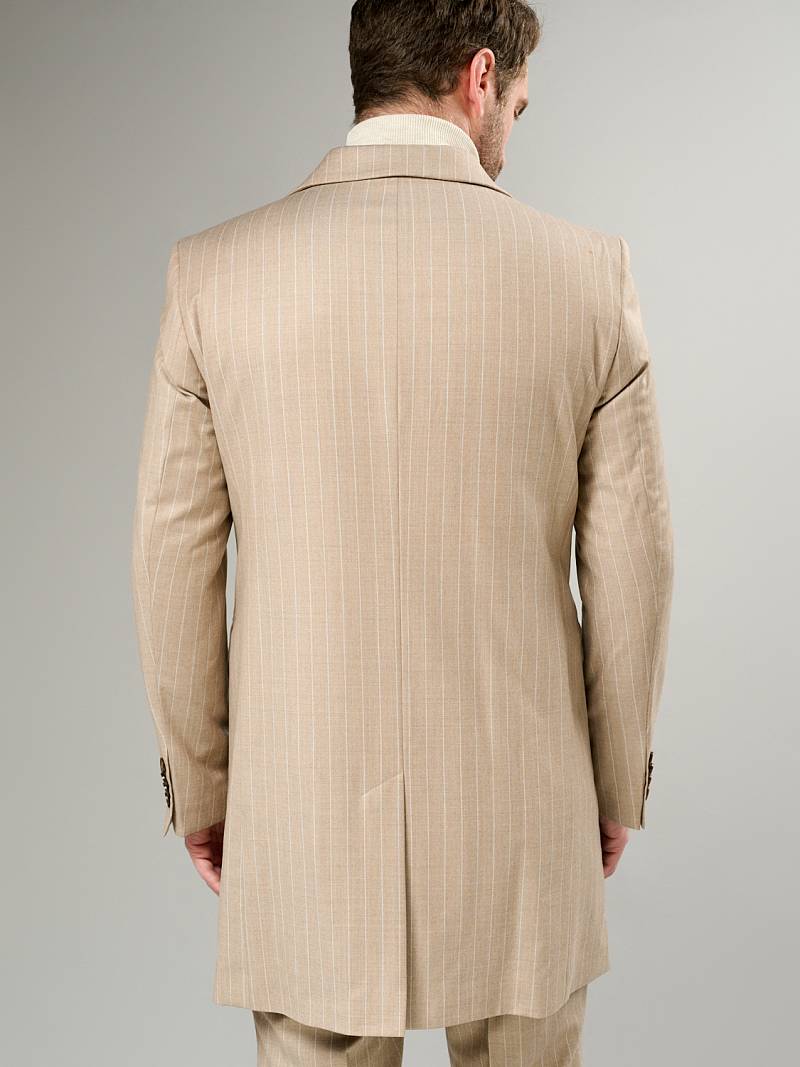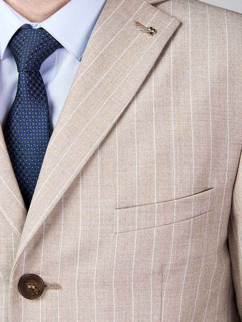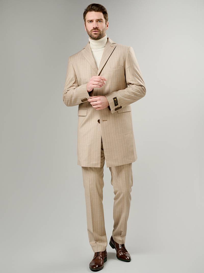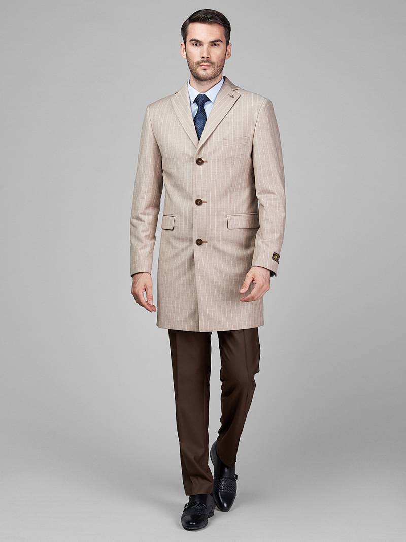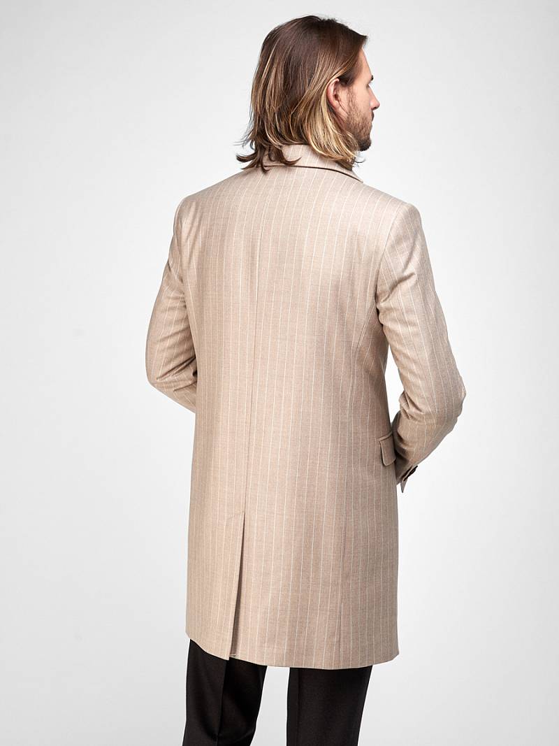 Пальто утепленное полуприлегающего силуэта на 3 пуговицы. Воротник - английский широкий с лацканами. На лацкане - декоративная петля с значком. На передних половинках пальто - один верхний нагрудный карман и два нижних кармана с клапанами. По спинке - в среднем шве - шлица. Рукава втачные, по низу рукавов - шлица на пуговицах. Длина изделия по спинке для размера 50/176 - 95см.