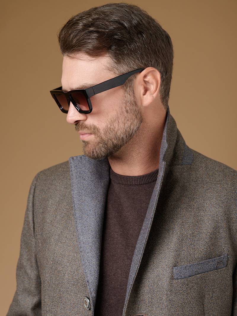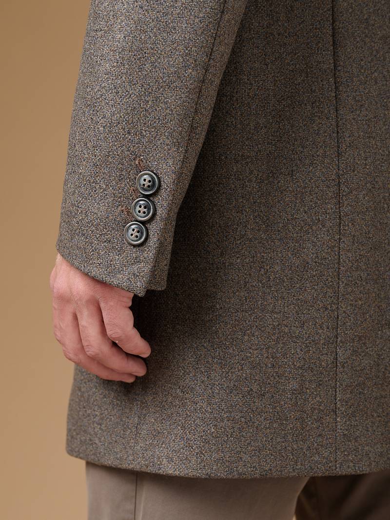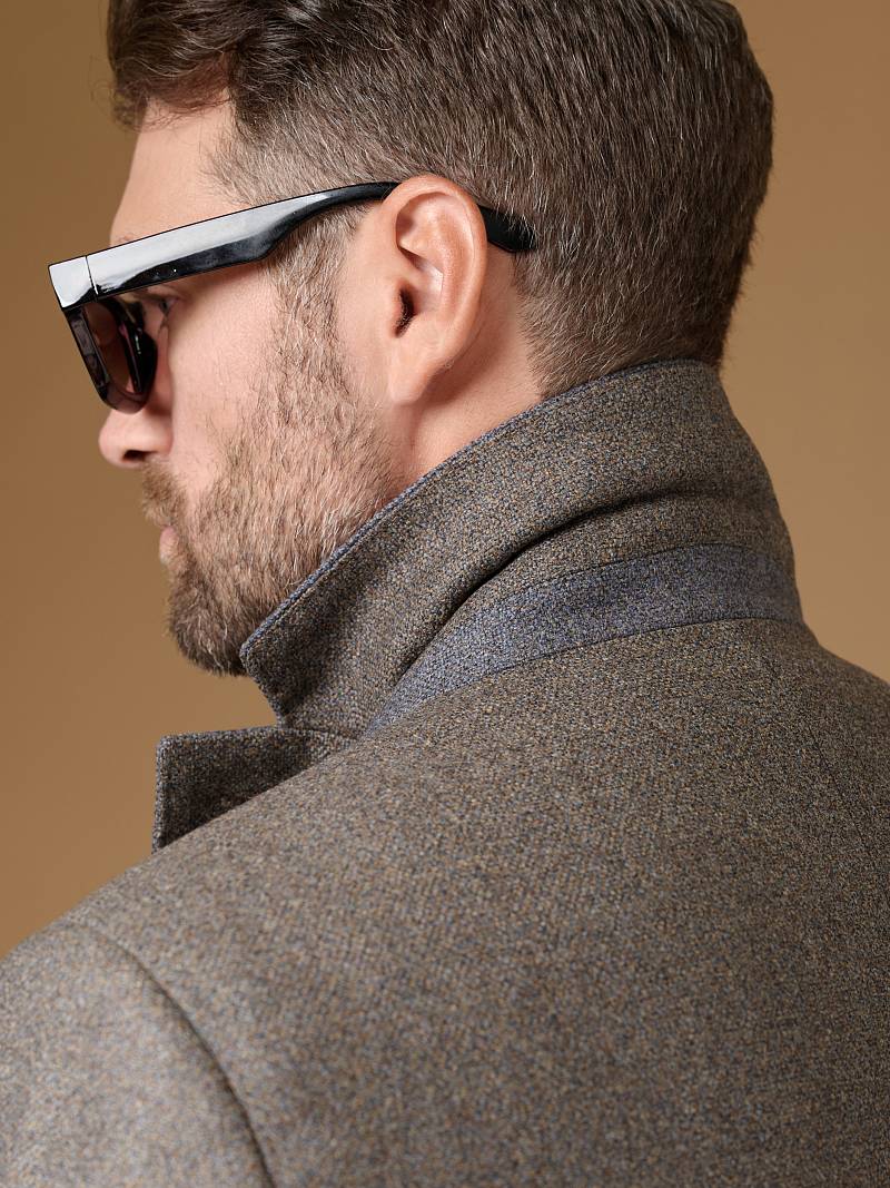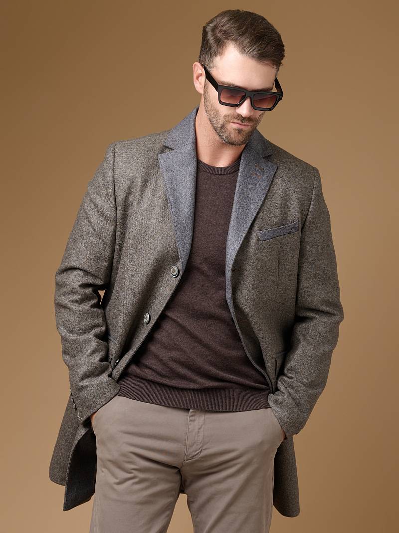 Пальто мужское с лацканами, застежка на 3 пуговицы, фасонная петля на лацкане. На полочках - верхний нагрудный карман с листочкой и два нижних боковых кармана с клапанами. Спинка со шлицей в среднем шве. Длина изделия по спинке для роста 176 - 88см. Ткань верха: 100%шерсть. Подкладка: 50%вискоза 50%полиэстер. Утеплитель: термоплюс 60гр