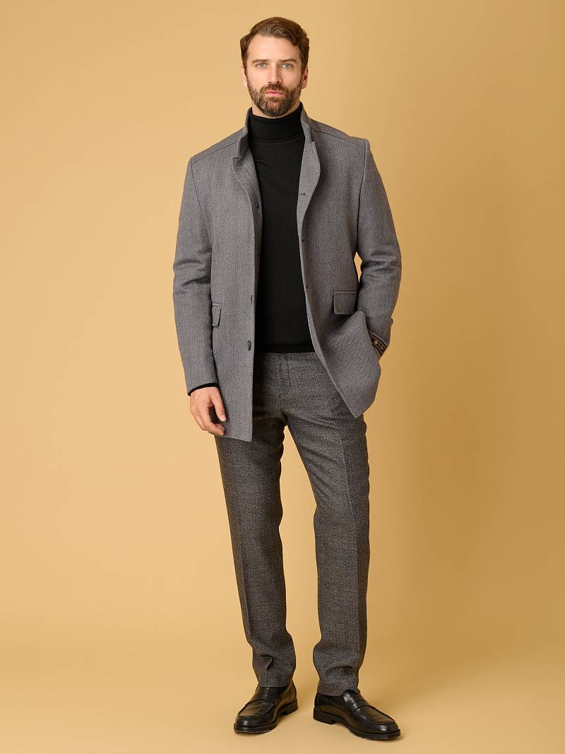 Мужское утепленное пальто (ПОЛУПРИЛЕГАЮЩИЙ СИЛУЭТ). Дизайнеры марки BAZIONI создали классическое пальто из осенне-зимней коллекции, вдохновившись главным принципам марки — стиль и качество, неподверженные времени. Благодаря выверенным лекалам и кропотливой сборке деталей силуэт вещи получился четким, а посадка комфортной. Для создания модели  использовали 100% шерстяную ткань высокого качества которую дополнительно утеплили, по этому пальто получилось легким и теплым одновременно. Однобортное пальто с воротником-стойкой дополнено  боковыми карманами с клапанами и двумя  карманами в боковых швах. По воротнику и рукавам использовали отделку из кожи. Пальто обработано шелковой подкладкой с двумя внутренними карманами. Дизайнеры марки BAZIONI тщательно подходят к выбору материалов. Пуговицы подбираются и красятся индивидуально под каждую ткань, а прикладные материалы используют только от передовых производителей. Утеплитель: спинка-полочка-100г, рукава-60г.       Пальто мужское, классическое, под джины, повседневный, молодежный, casual, для работы в офисе, модный, для мужа, сына, брата, на праздник.