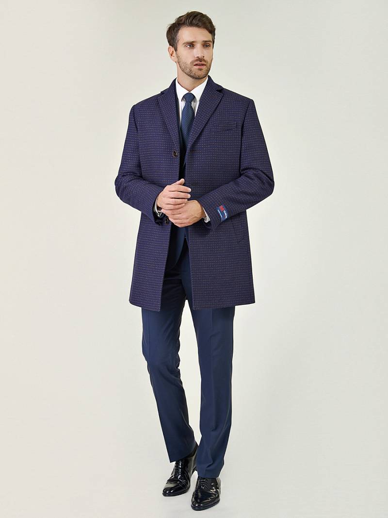 Пальто мужское утепленное с застежкой на 3 пуговицы, воротник английский с лацканами, нагрудный карман и два нижних наклонных боковых кармана с листочками. На подкладке один внутренний карман на пуговице.