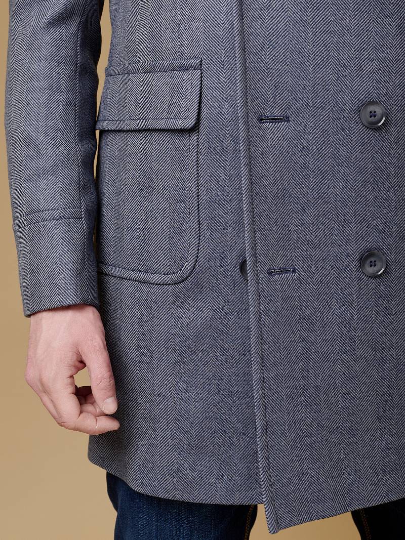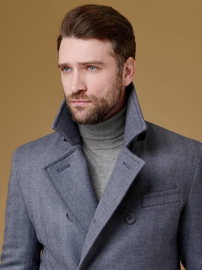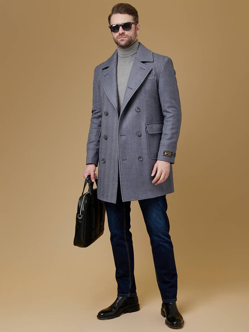 Classic Fit (ПОЛУПРИЛЕГАЮЩИЙ СИЛУЭТ). Классическое двубортное утепленное пальто с застежкой на пуговицы, с нагрудным карманом листочкой и двумя боковыми накладными карманами с клапанами. Рукав втачной, двухшовный, внизу рукава притачной манжет с декоративной пуговицей. По спинке расположена одна шлица. Отделочная сторочка проходит по краю борта, воротнику, лацкану, боковым карманам и среднему шву спинки. На подкладке расположены два внутренних кармана. Утеплитель-Термоплюс 100гр.
