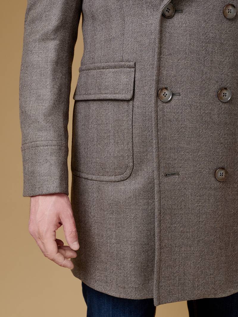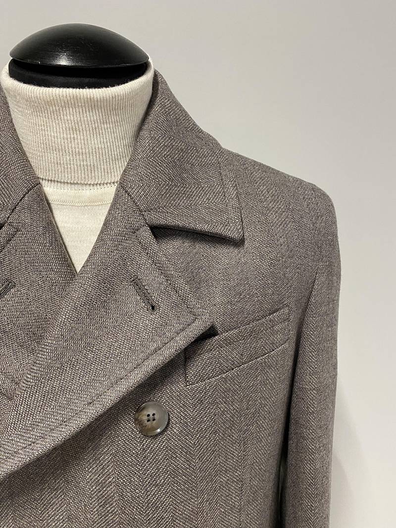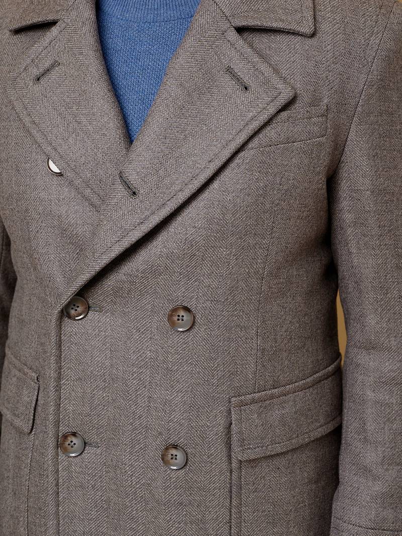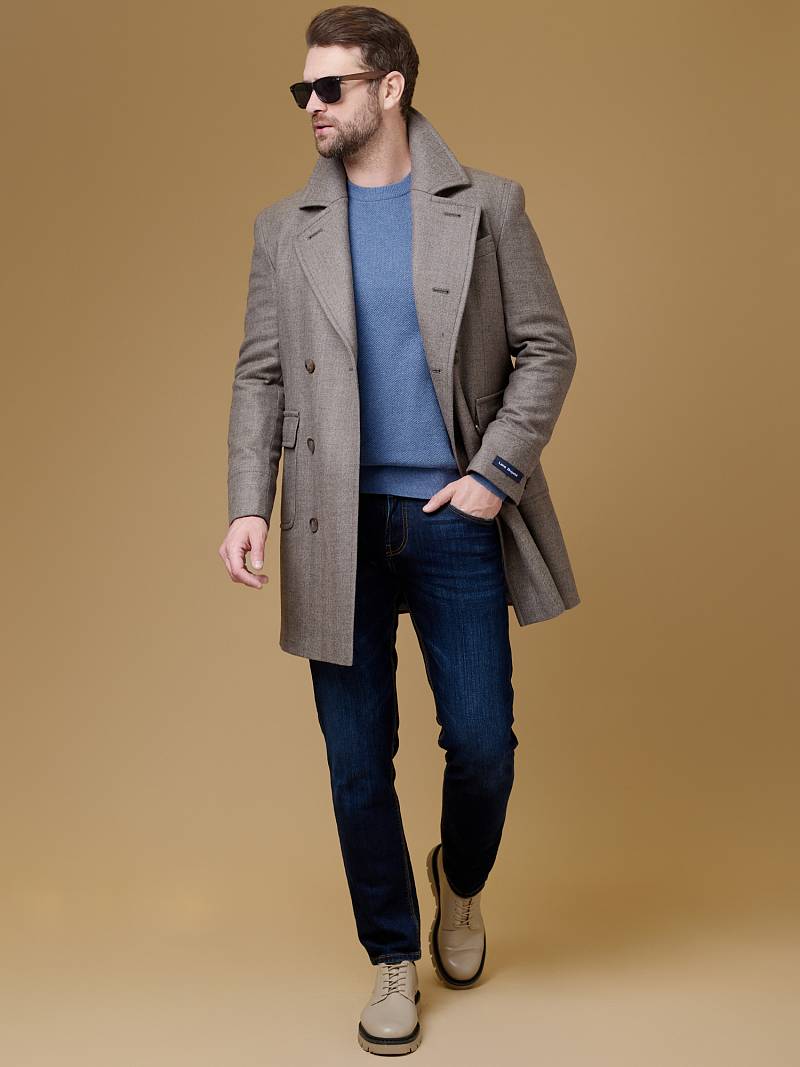 Classic Fit (ПОЛУПРИЛЕГАЮЩИЙ СИЛУЭТ). Классическое двубортное утепленное пальто с застежкой на пуговицы, с нагрудным карманом листочкой и двумя боковыми накладными карманами с клапанами. Рукав втачной, двухшовный, внизу рукава притачной манжет с декоративной пуговицей. По спинке расположена одна шлица. Отделочная сторочка проходит по краю борта, воротнику, лацкану, боковым карманам и среднему шву спинки. На подкладке расположены два внутренних кармана. Утеплитель-Термоплюс 100гр.