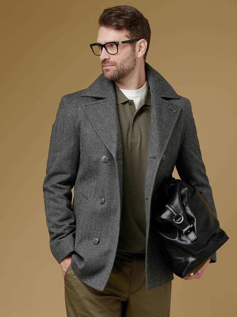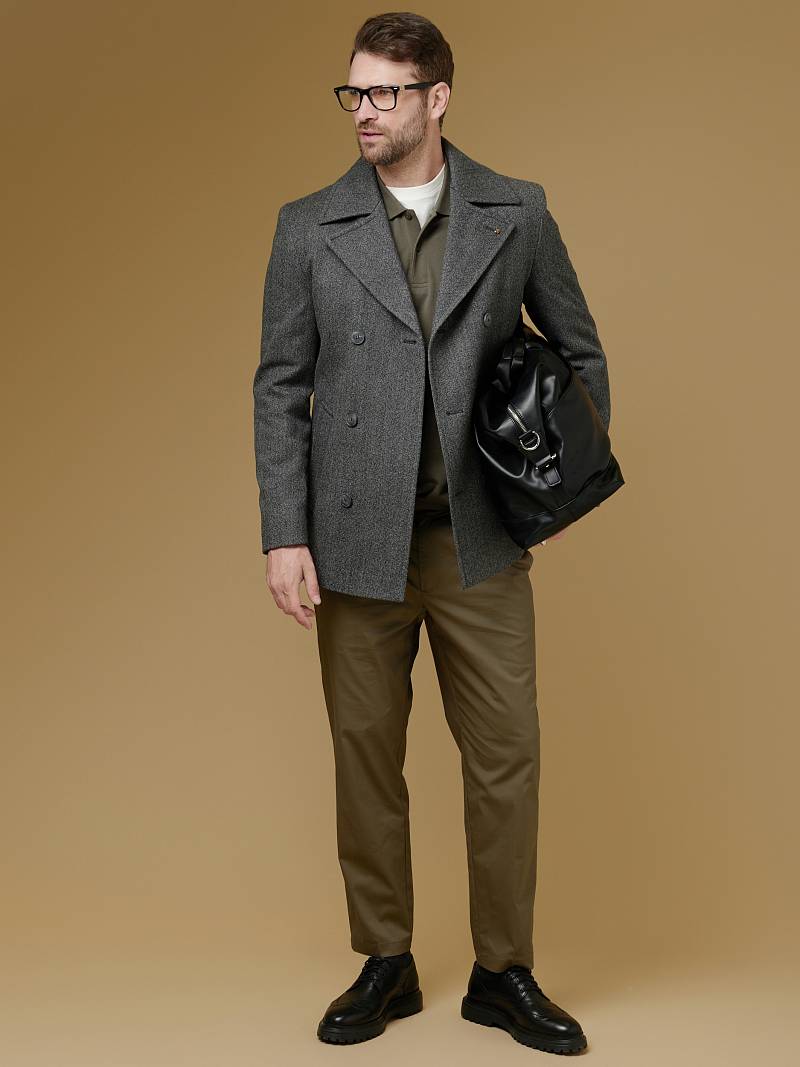 Slim Fit (ПРИТАЛЕННЫЙ СИЛУЭТ). Бушлат двубортный утепленный с застежкой на пуговицы, с двумя наклонными боковыми карманами "листочка". По спинке расположена одна шлица. Внутри на подкладке расположены два внутренних кармана. Отделочная сторочка проходит по краю борта, воротнику и лацкану. Термоплюс 100 гр.