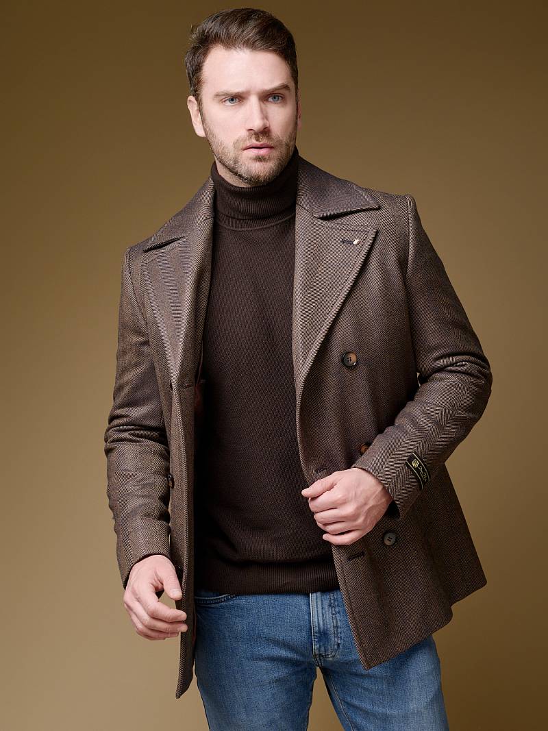 Slim Fit (ПРИТАЛЕННЫЙ СИЛУЭТ). Бушлат двубортный утепленный с застежкой на пуговицы, с двумя наклонными боковыми карманами "листочка". По спинке расположена одна шлица. Внутри на подкладке расположены два внутренних кармана. Отделочная сторочка проходит по краю борта, воротнику и лацкану. Термоплюс 100 гр.