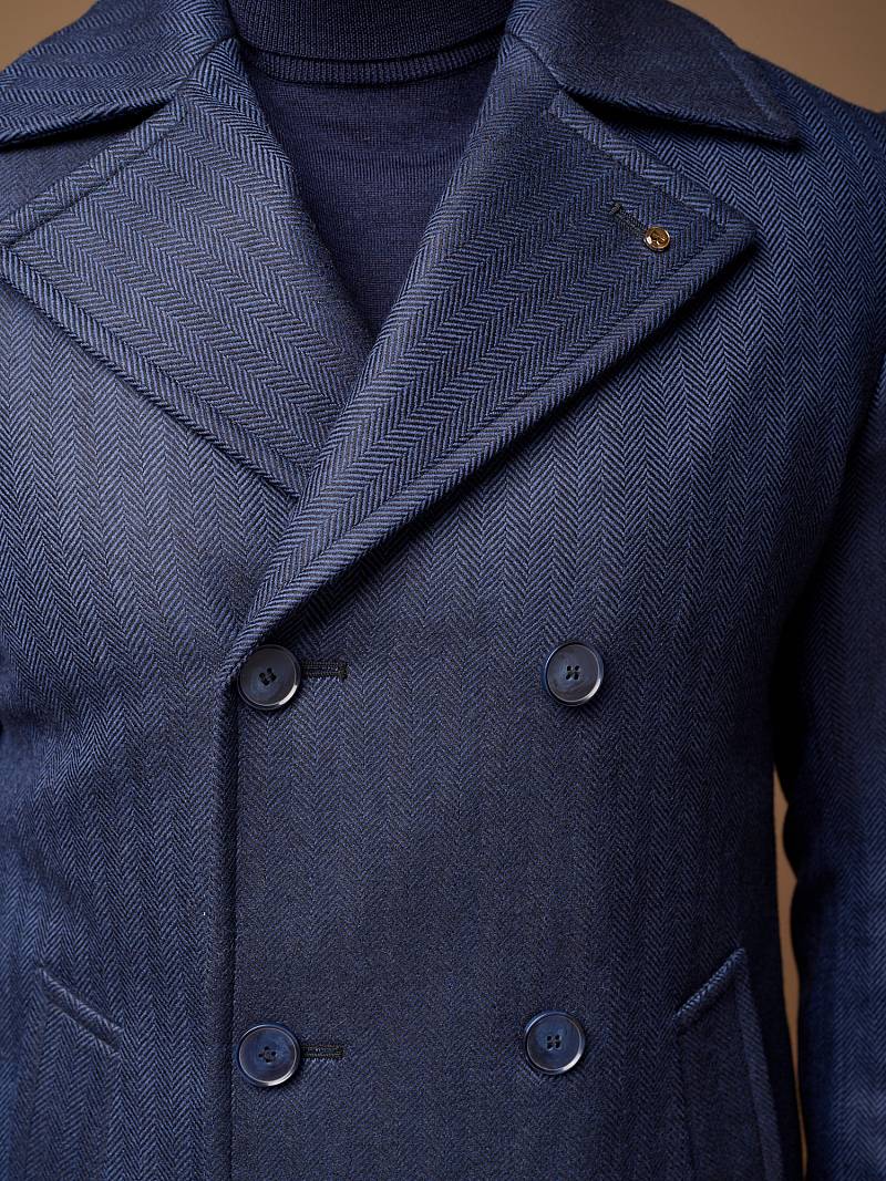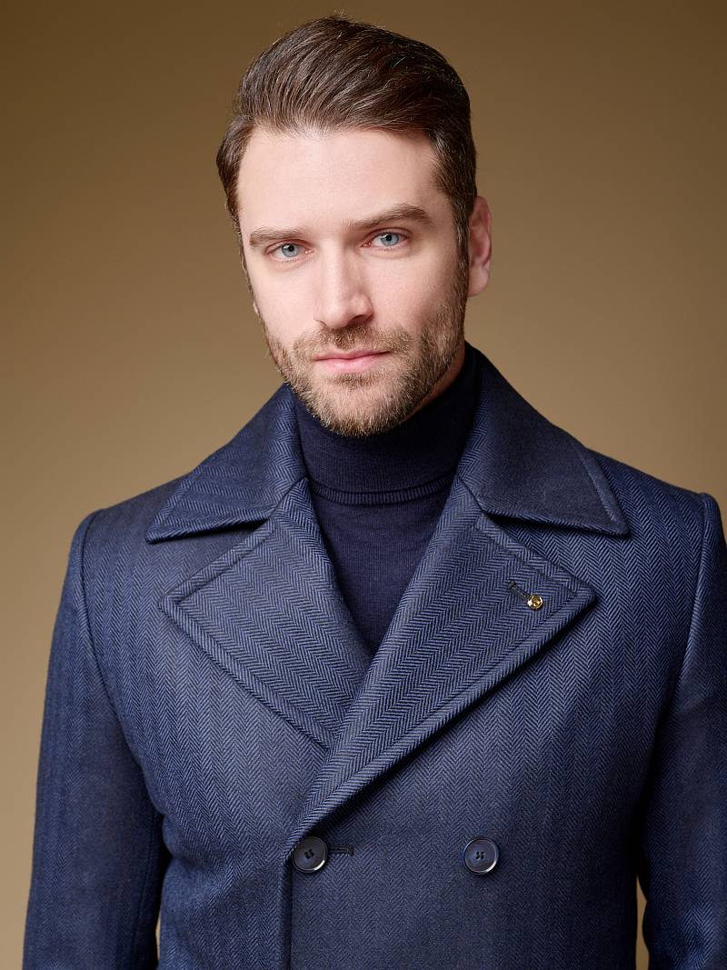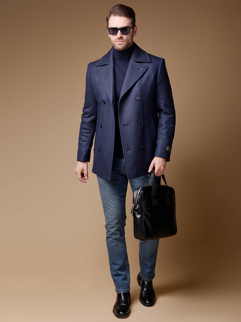Slim Fit (ПРИТАЛЕННЫЙ СИЛУЭТ). Бушлат двубортный утепленный с застежкой на пуговицы, с двумя наклонными боковыми карманами "листочка". По спинке расположена одна шлица. Внутри на подкладке расположены два внутренних кармана. Отделочная сторочка проходит по краю борта, воротнику и лацкану. Термоплюс 100 гр.