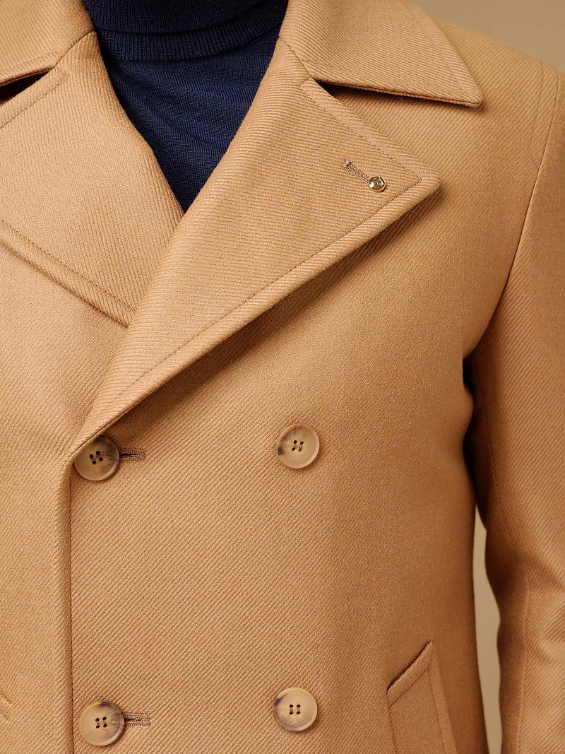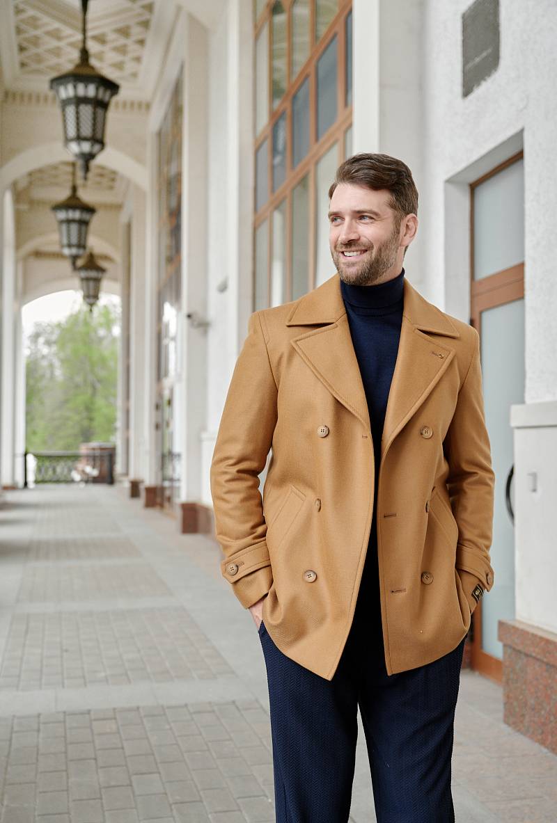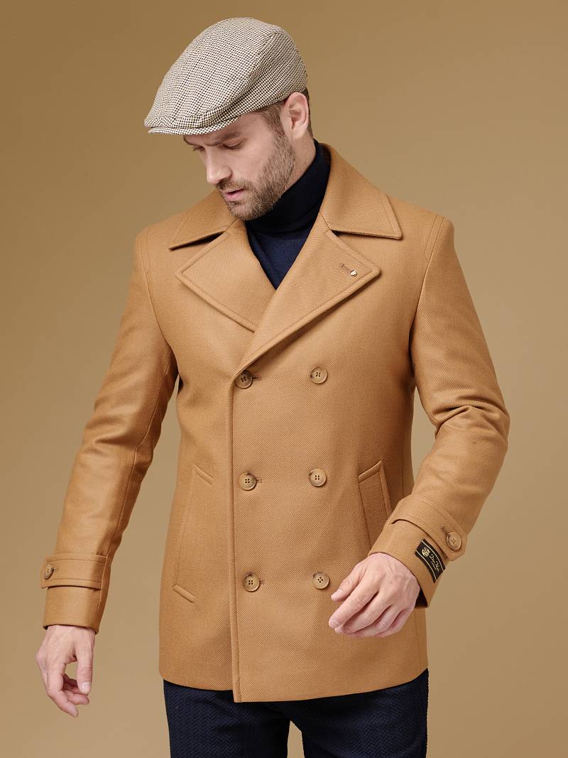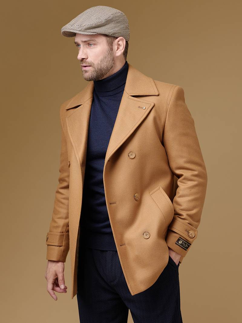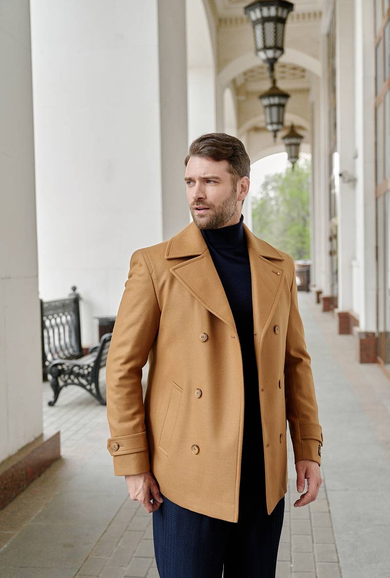 Slim Fit (ПРИТАЛЕННЫЙ СИЛУЭТ). Бушлат двубортный утепленный с застежкой на пуговицы, с двумя наклонными боковыми карманами "листочка". По спинке расположена одна шлица. По низу рукава расположена пата с пуговицей. Внутри на подкладке расположены два внутренних кармана. Отделочная сторочка проходит по краю борта, воротнику и лацкану. Термоплюс 100 гр.