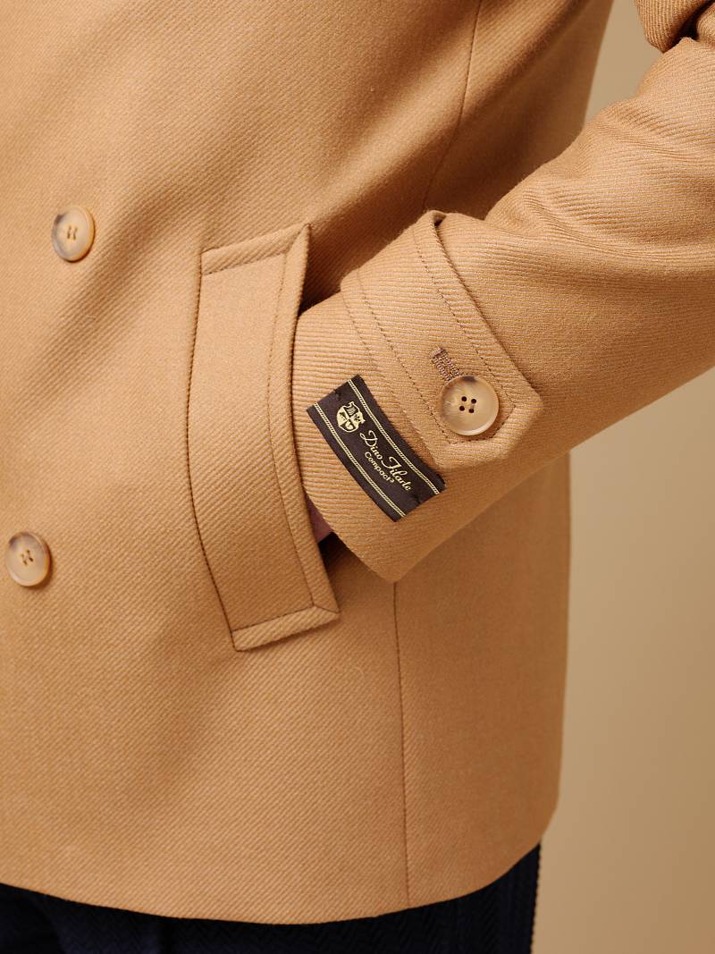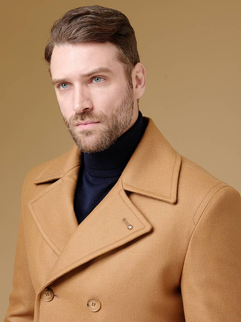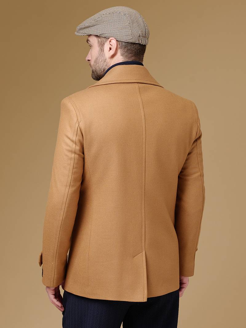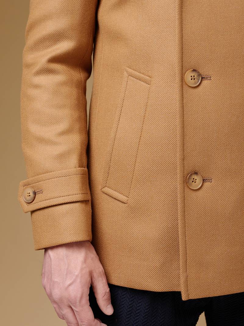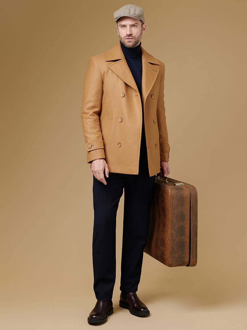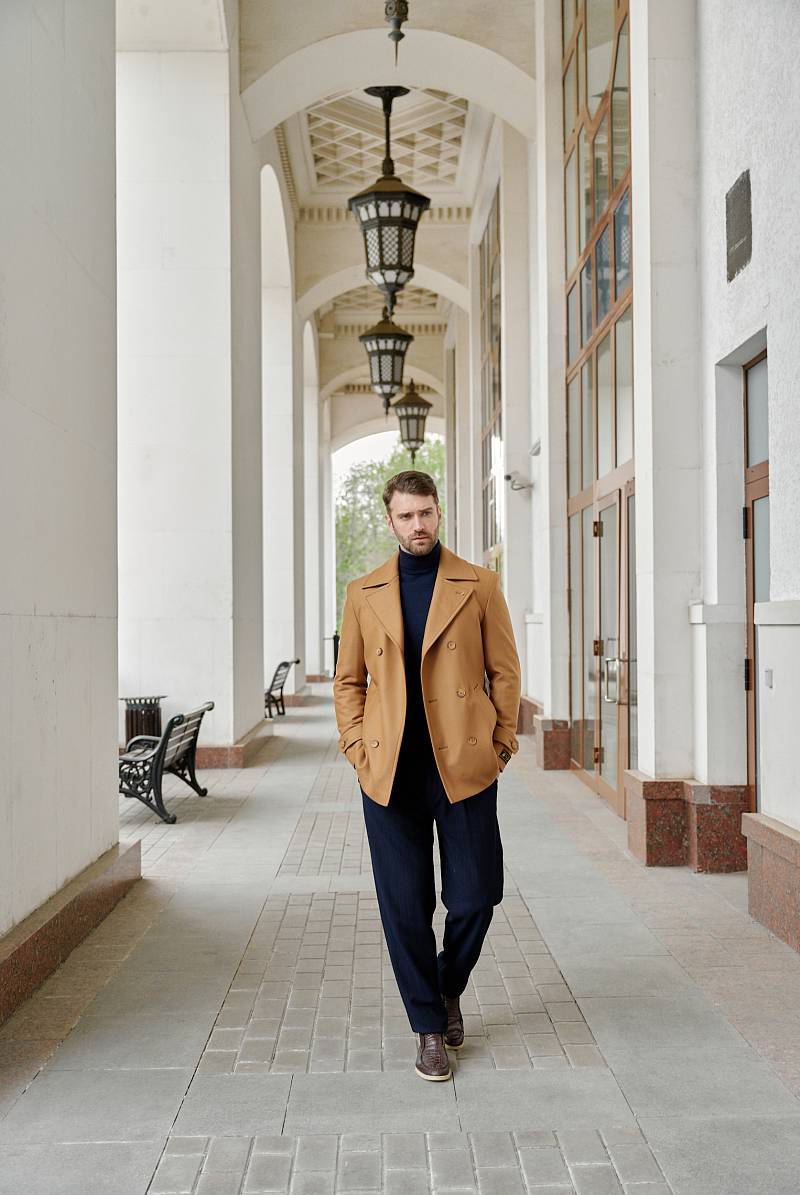 Slim Fit (ПРИТАЛЕННЫЙ СИЛУЭТ). Бушлат двубортный утепленный с застежкой на пуговицы, с двумя наклонными боковыми карманами "листочка". По спинке расположена одна шлица. По низу рукава расположена пата с пуговицей. Внутри на подкладке расположены два внутренних кармана. Отделочная сторочка проходит по краю борта, воротнику и лацкану. Термоплюс 100 гр.