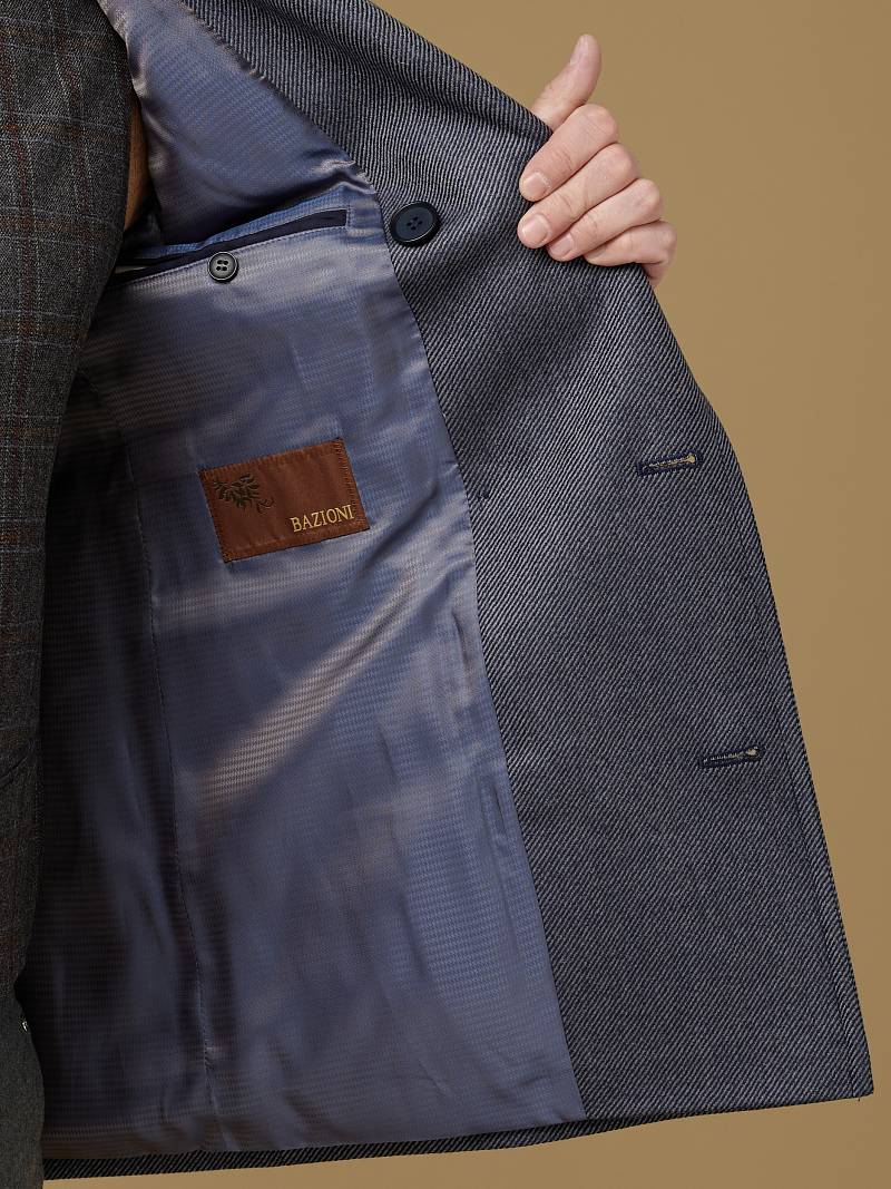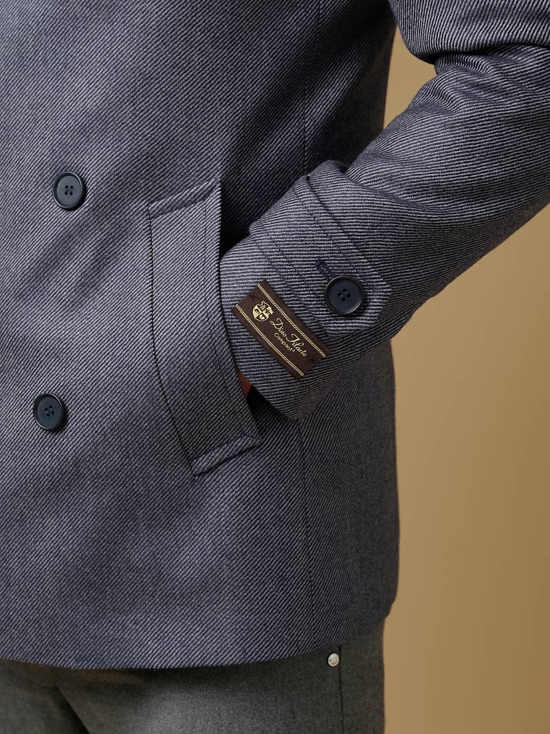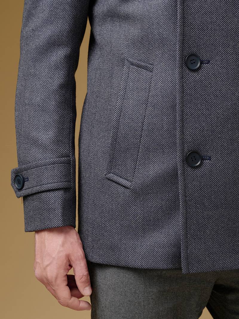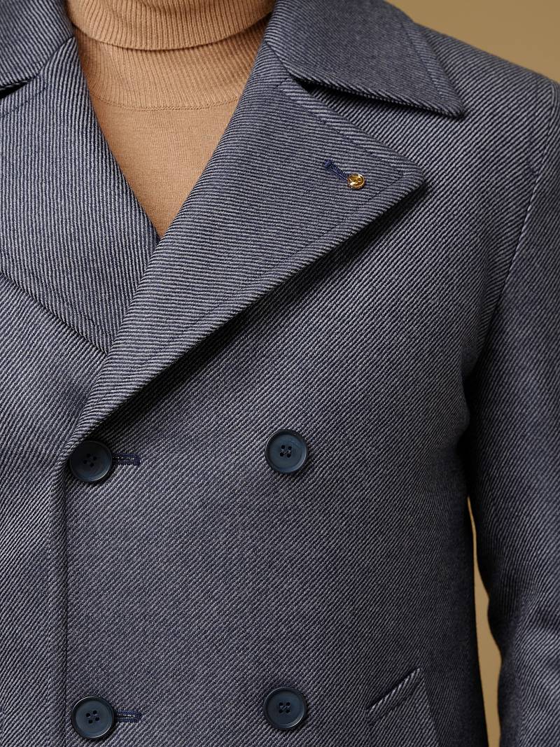 Slim Fit (ПРИТАЛЕННЫЙ СИЛУЭТ). Бушлат двубортный утепленный с застежкой на пуговицы, с двумя наклонными боковыми карманами "листочка". По спинке расположена одна шлица. По низу рукава расположена пата с пуговицей. Внутри на подкладке расположены два внутренних кармана. Отделочная сторочка проходит по краю борта, воротнику и лацкану. Термоплюс 100 гр.