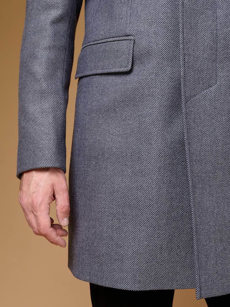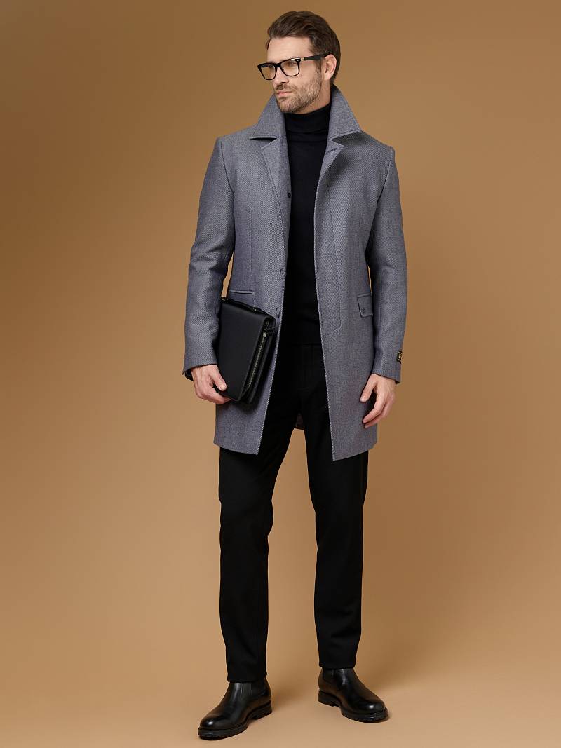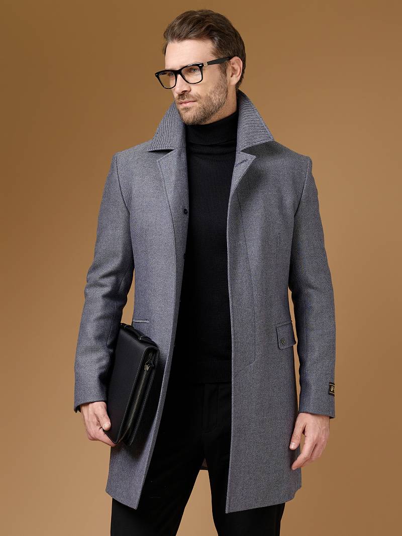 Классическое утепленное пальто (ПРИЛЕГАЮЩИЙ СИЛУЭТ). Мастера марки BAZIONI сшили прямое однобортное пальто для осенне-зимней коллекции. Модель с отложным воротником и супатной застежкой беспроигрышный вариант, который одинаково хорошо сочетается, как с формальным костюмом, так и с вещами в стиле casual. Пальто комфортно садится по фигуре, высокая шлица не дает изделию сковывать шаг при ходьбе, а мягкая линия плеч не утяжеляет силуэт. Для пошива пальто использовали шерсть исключительного качества. Чтобы в таком изделии было комфортнее морозным днем, его дополнительно утеплили, при этом изделие получилось легким и теплым одновременно. Пальто обработано шелковой подкладкой с двумя внутренними карманами. Дизайнеры марки BAZIONI тщательно подходят к выбору материалов. Пуговицы подбираются и красятся индивидуально под каждую ткань, а прикладные материалы используют только от передовых производителей. Утеплитель: спинка-полочка-100г, рукава-60г. Пальто мужское, классическое, под джины, повседневный, молодежны