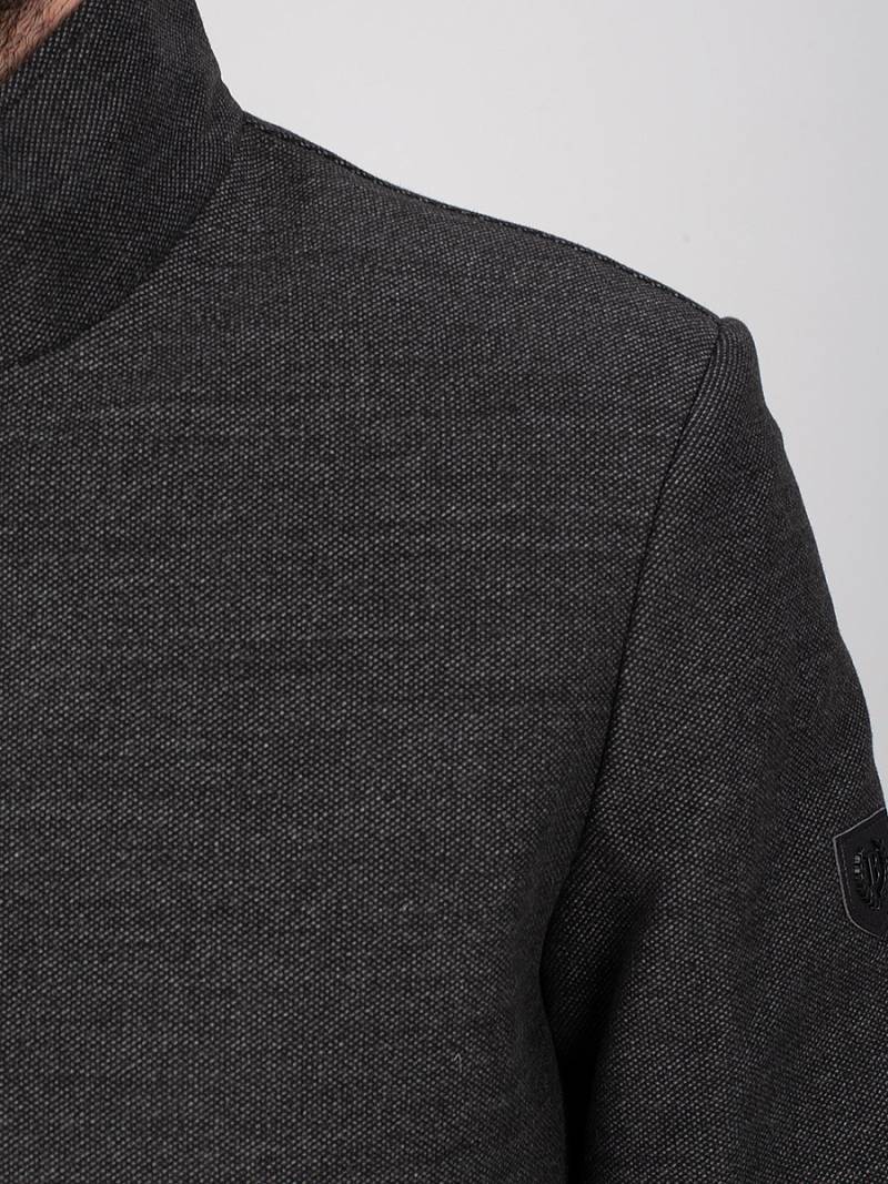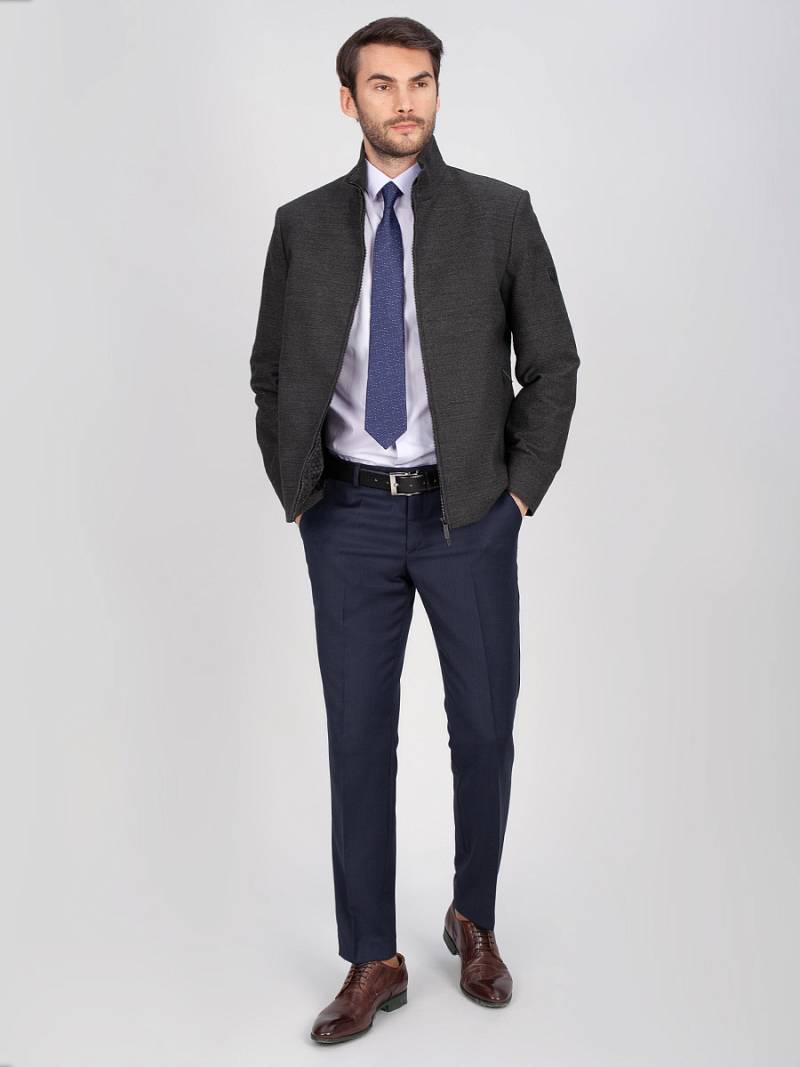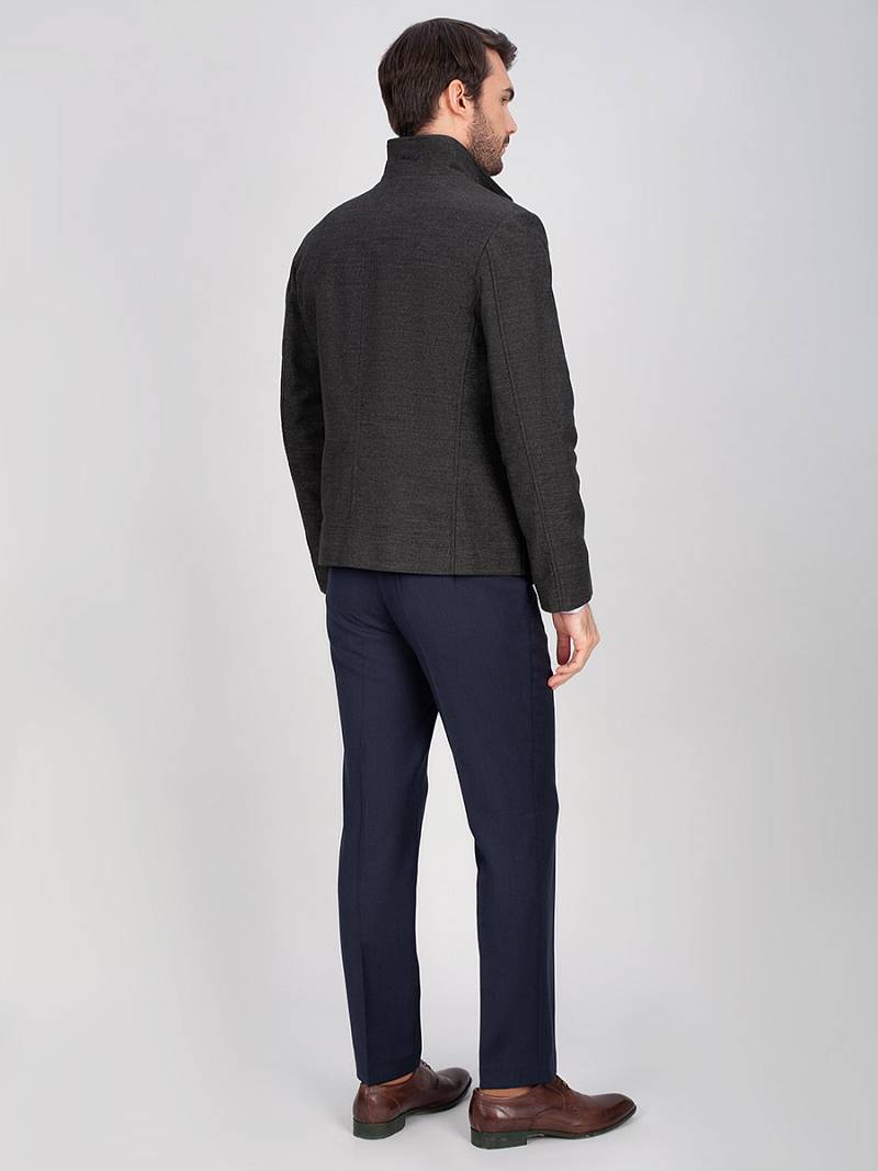 Укороченное мужское пальто с центральной застежкой на молнию. С отрезными боковыми частями, воротник-стойка, рукав втачной, в нижней части с отрезной деталью имитирующей манжет, боковой карман-прорезной "в рамку" с молнией. Спинка со средним швом. По низу изделия отрезная деталь имитирующая пояс.
