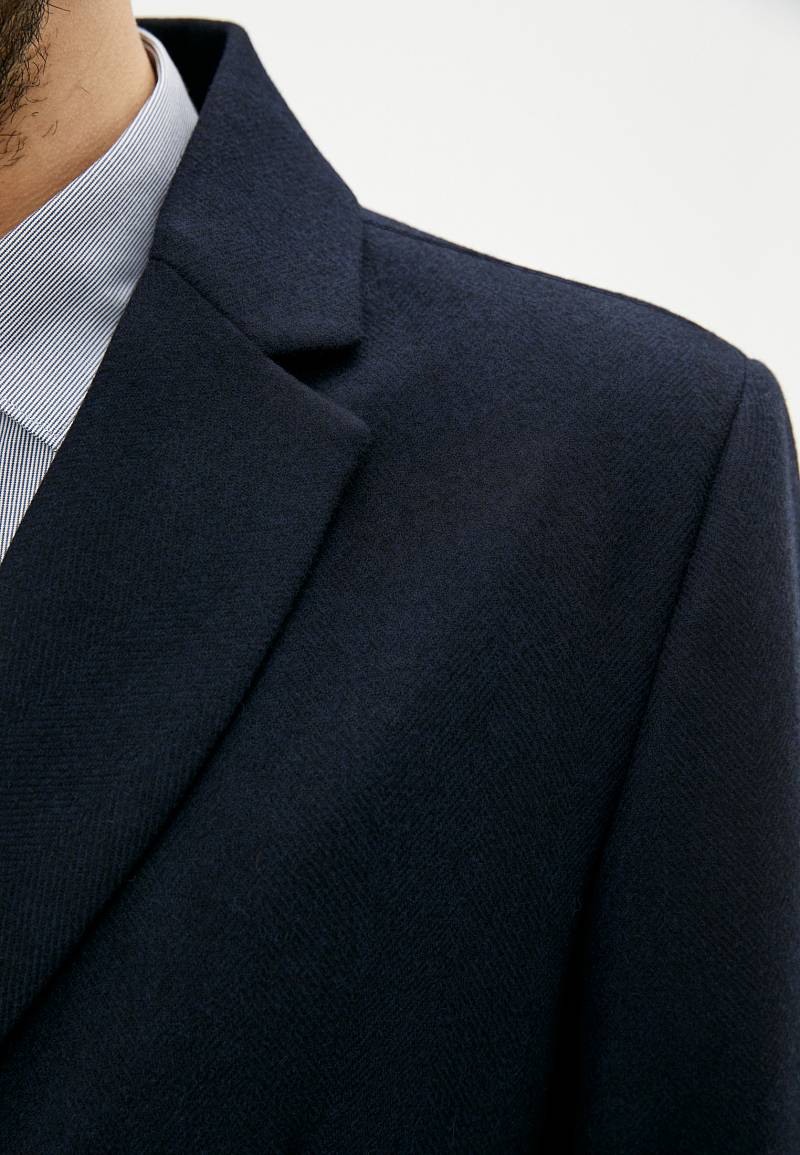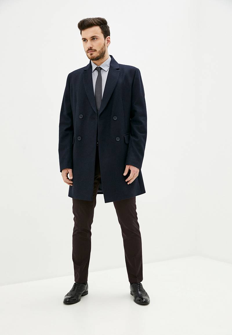 Пальто с двубортной застежкой на пуговицы, рукав втачной со шлицей, боковые карманы прорезные "в рамку" с клапанами, по среднему шву спинки шлица.