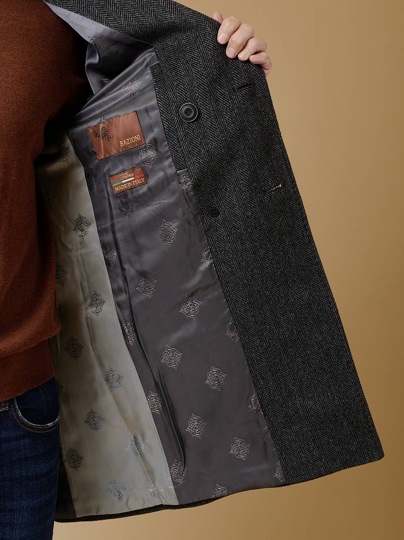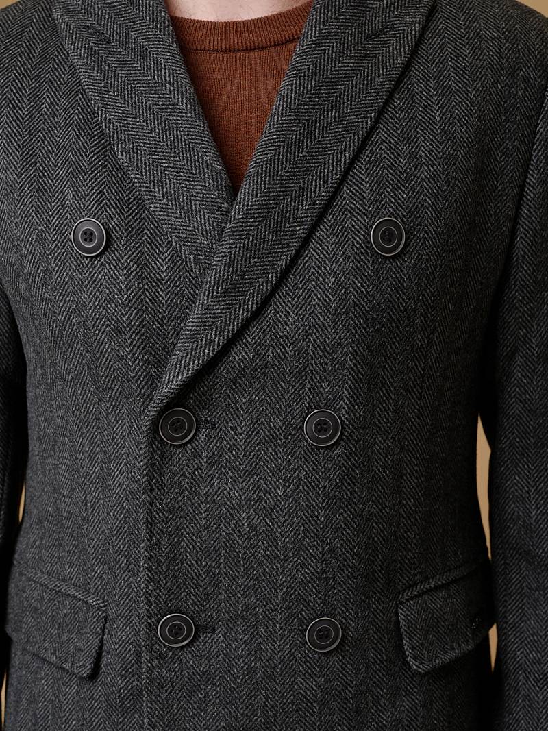 Двубортное пальто, воротник с лацканом "ласточкин хвост", карман с клапаном. По спинке шлица.