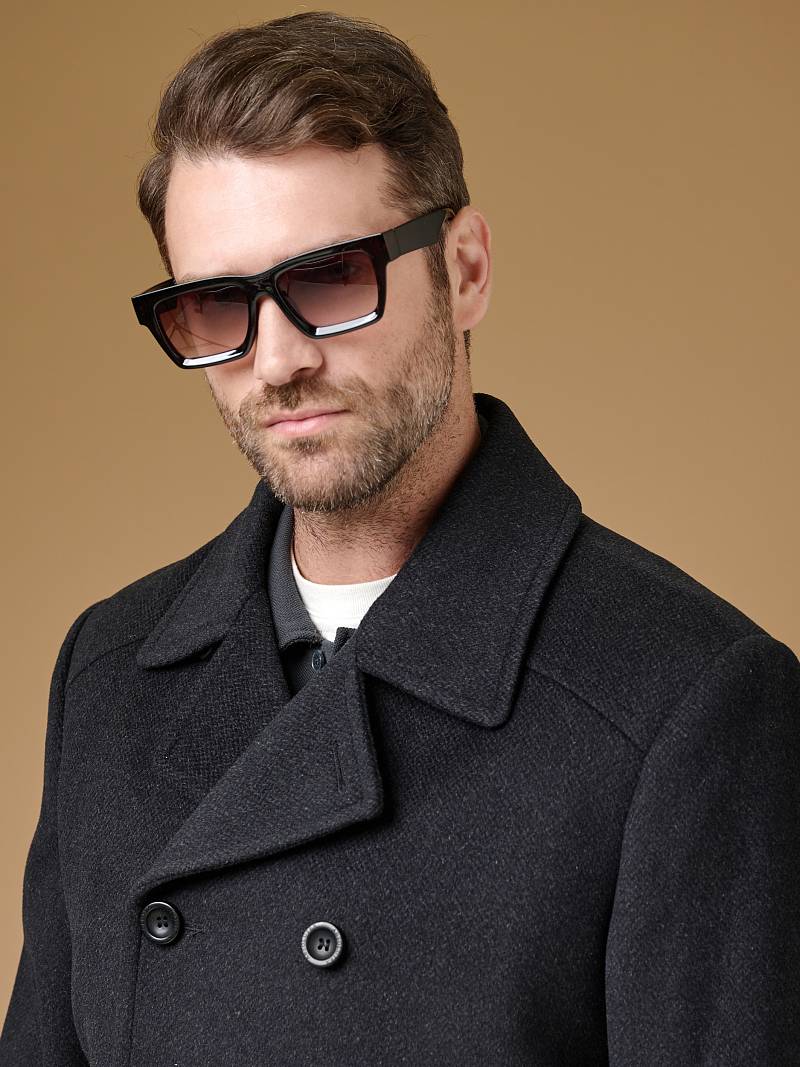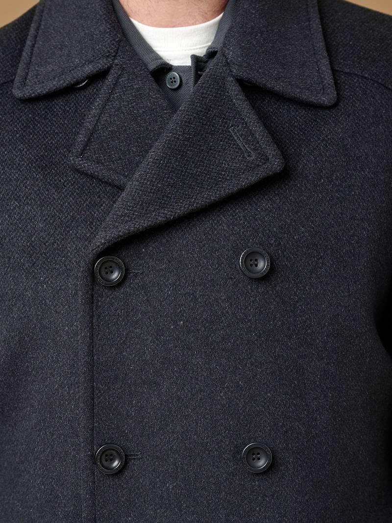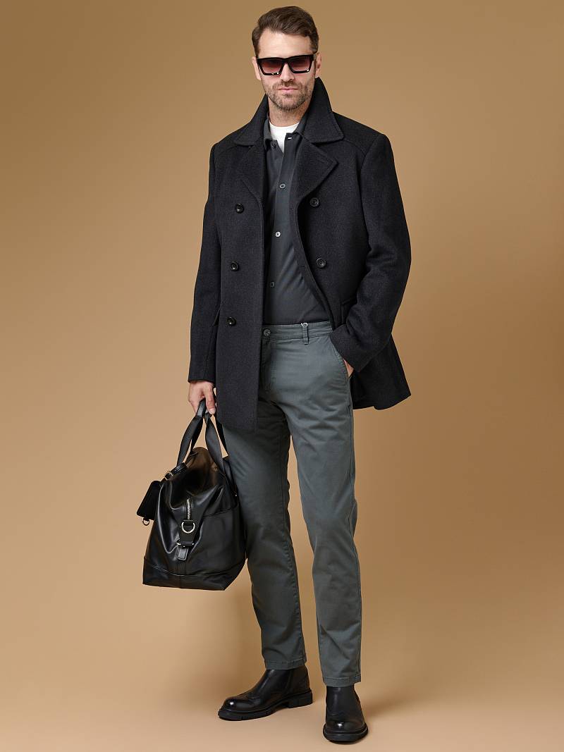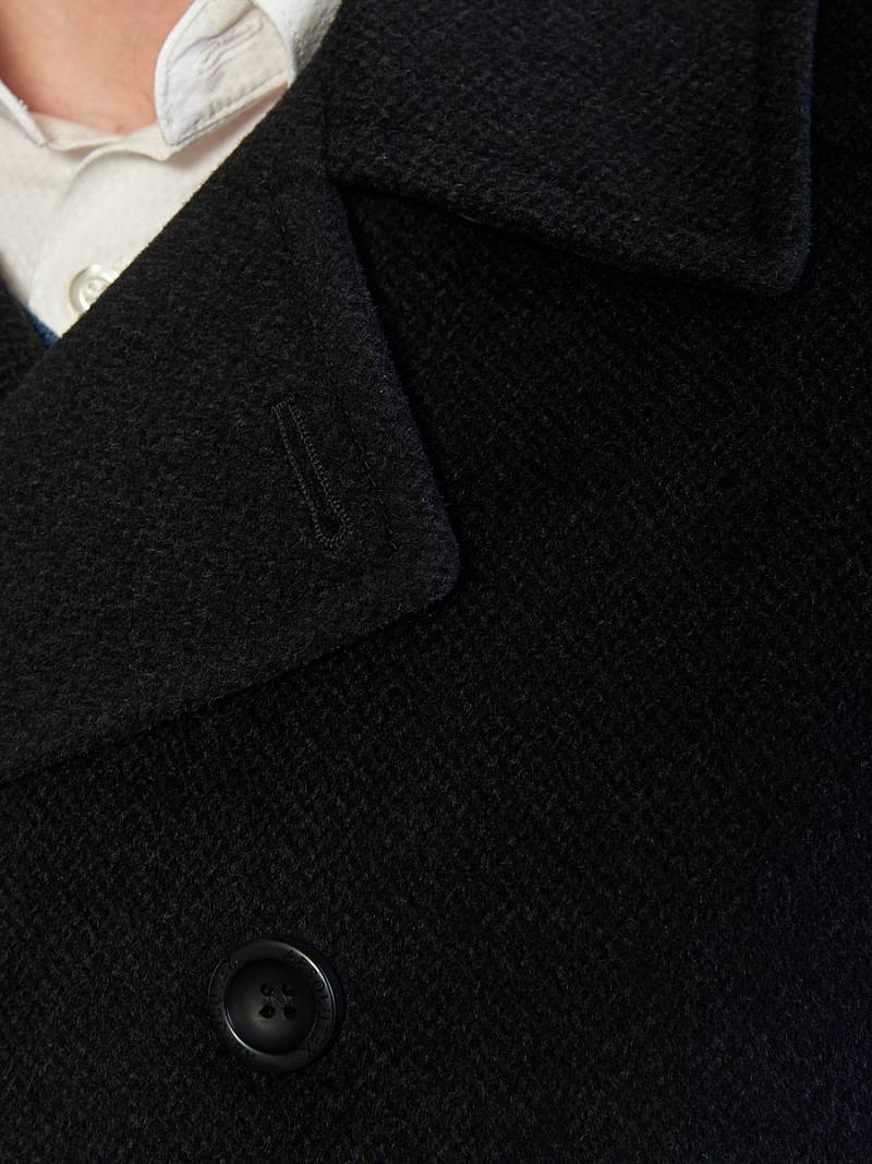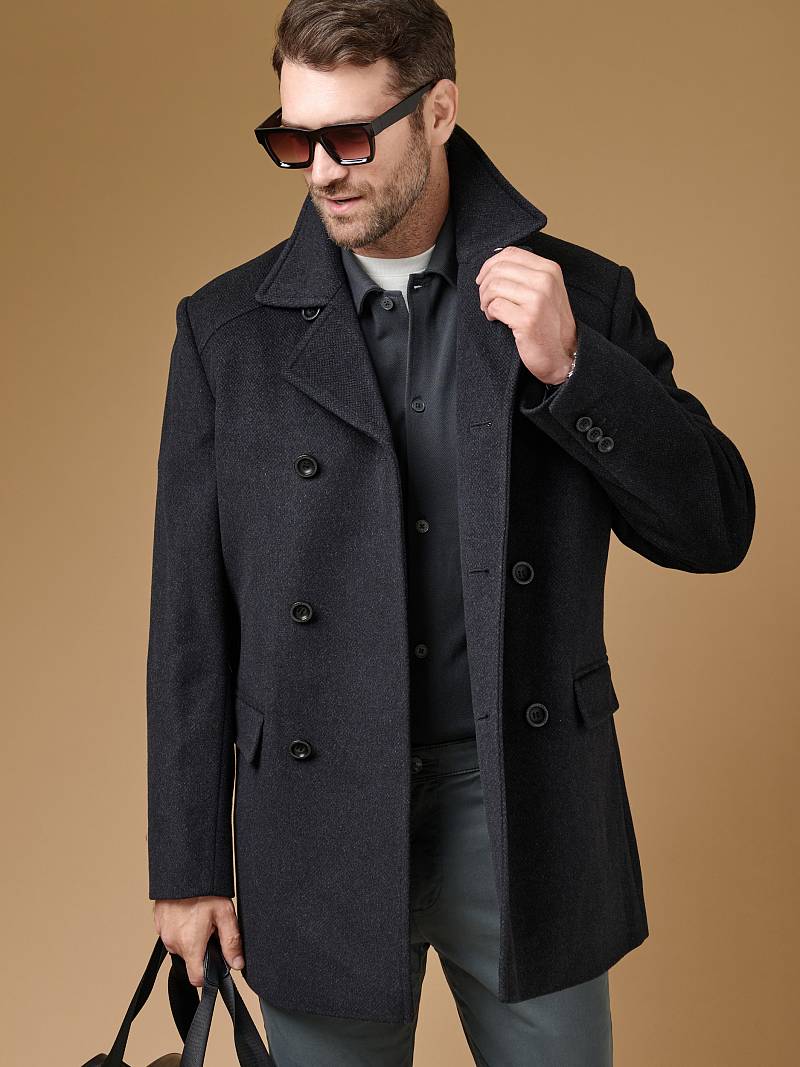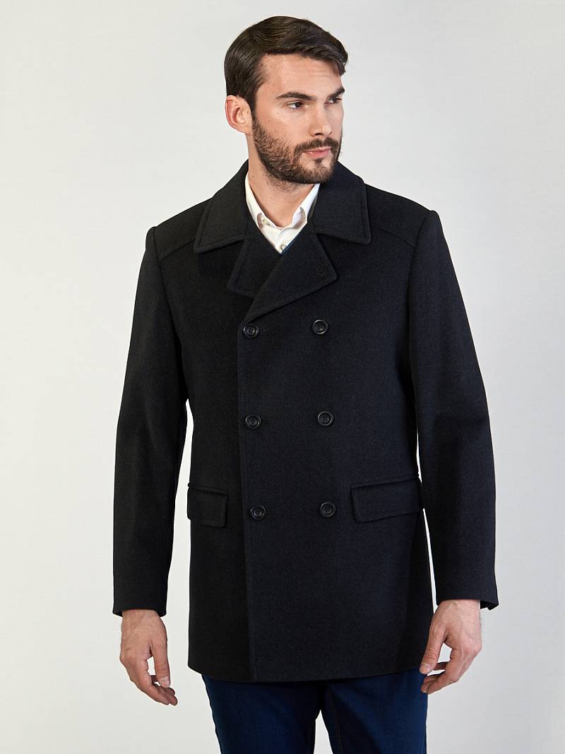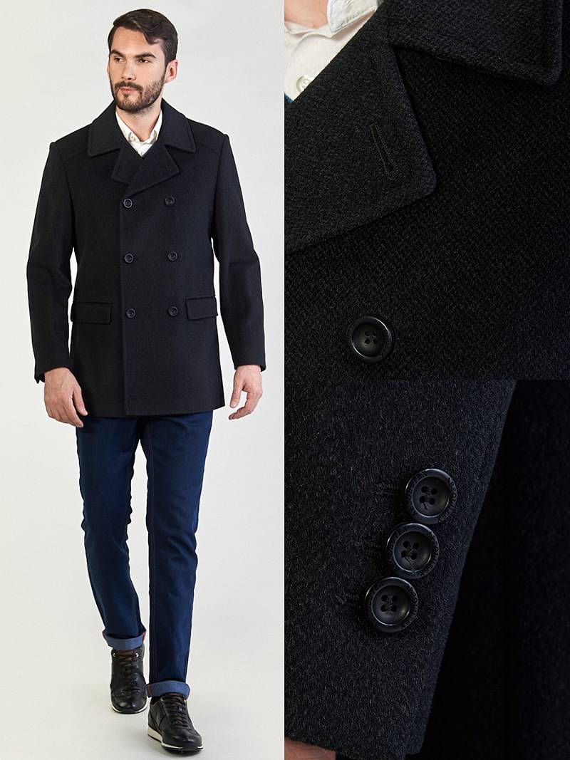 Пальто-бушлат мужское. двубортная застежка, боковые карманы "в рамку" с клапаном, воротник отложной, лацкан, шлица рукава и на спинке, кокетка спинки. Длина изделия по спинке для роста 176 - 84см. Ткань верха: 100% шерсть. Подкладка: 50% вискоза, 50% полиэстер. Без утеплителя.