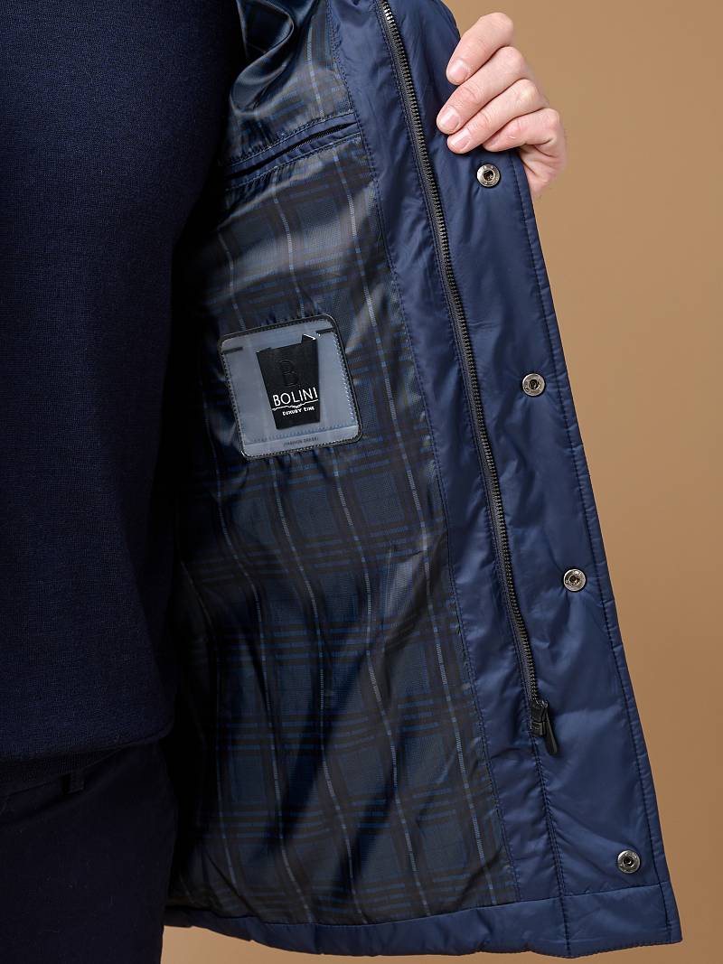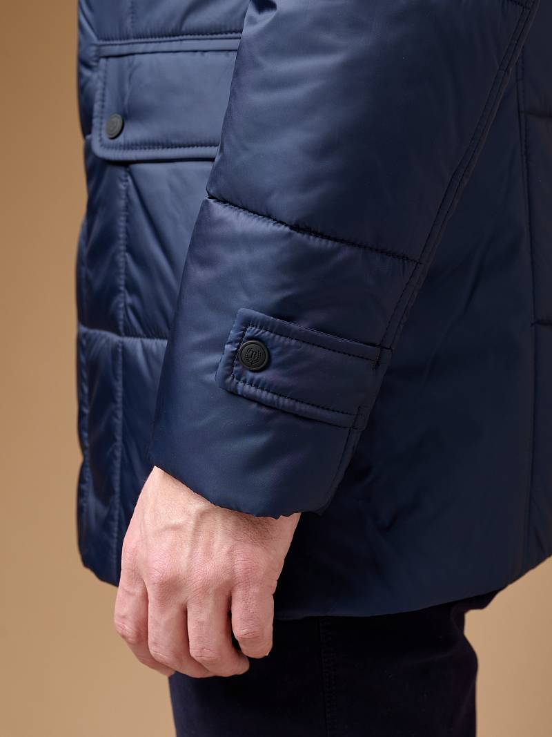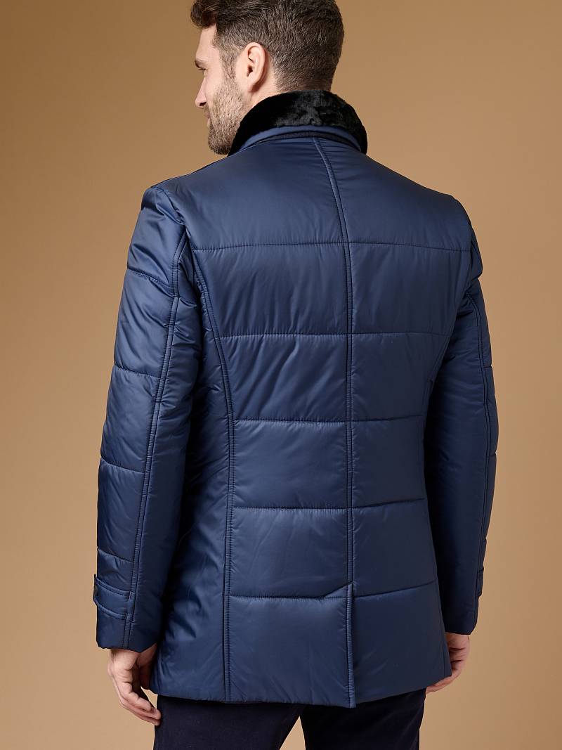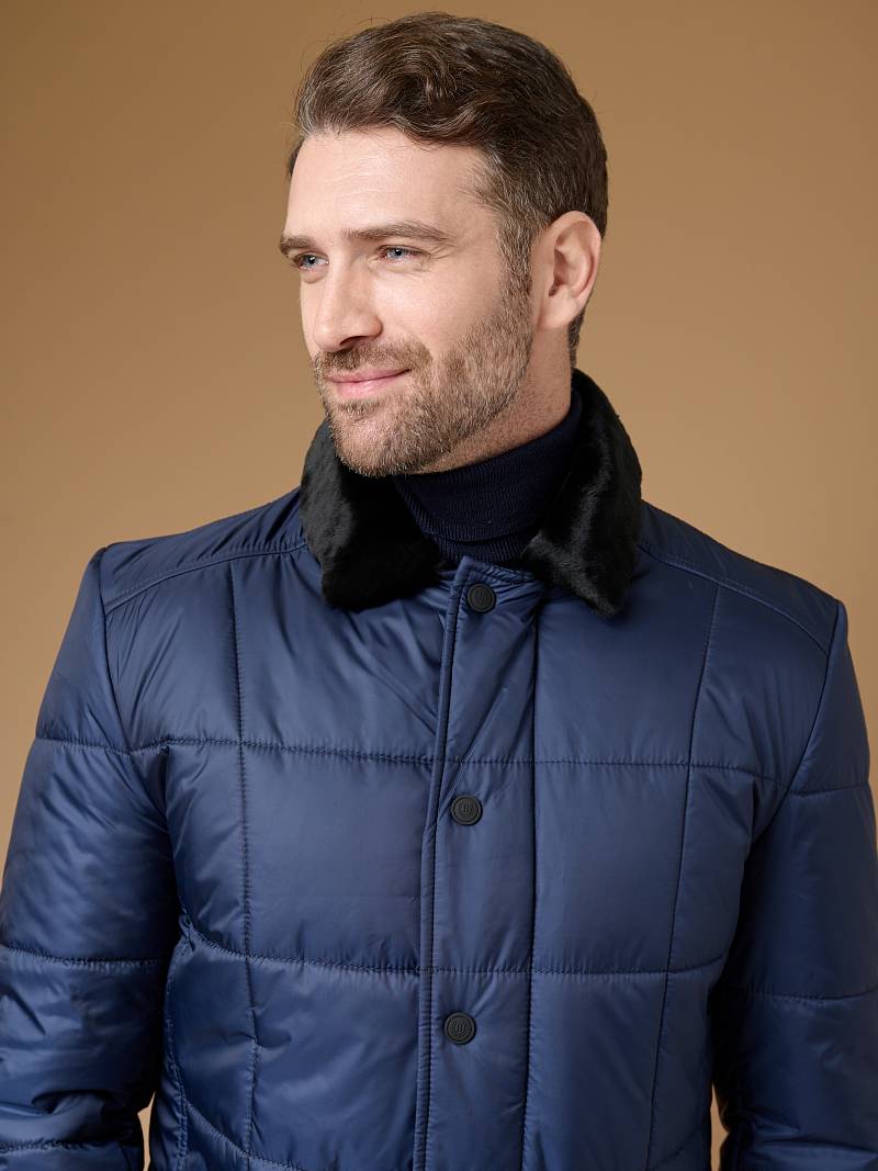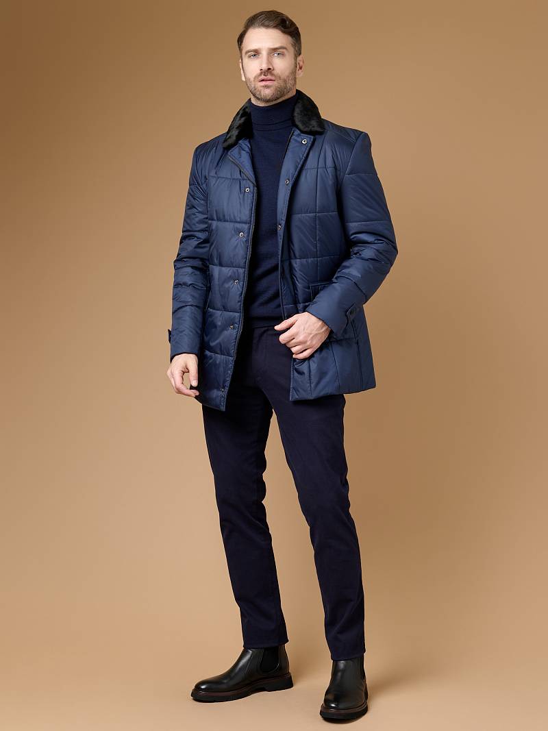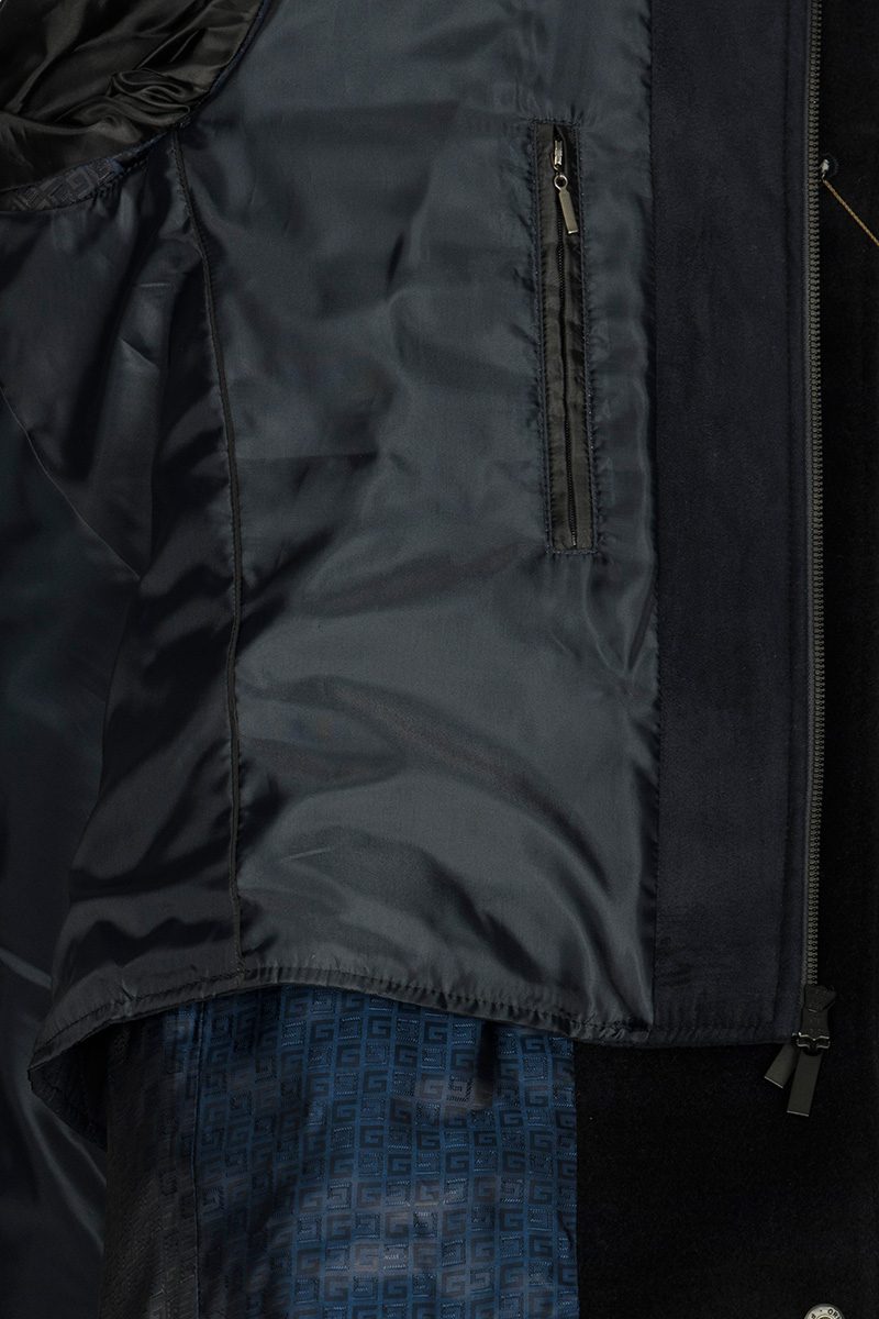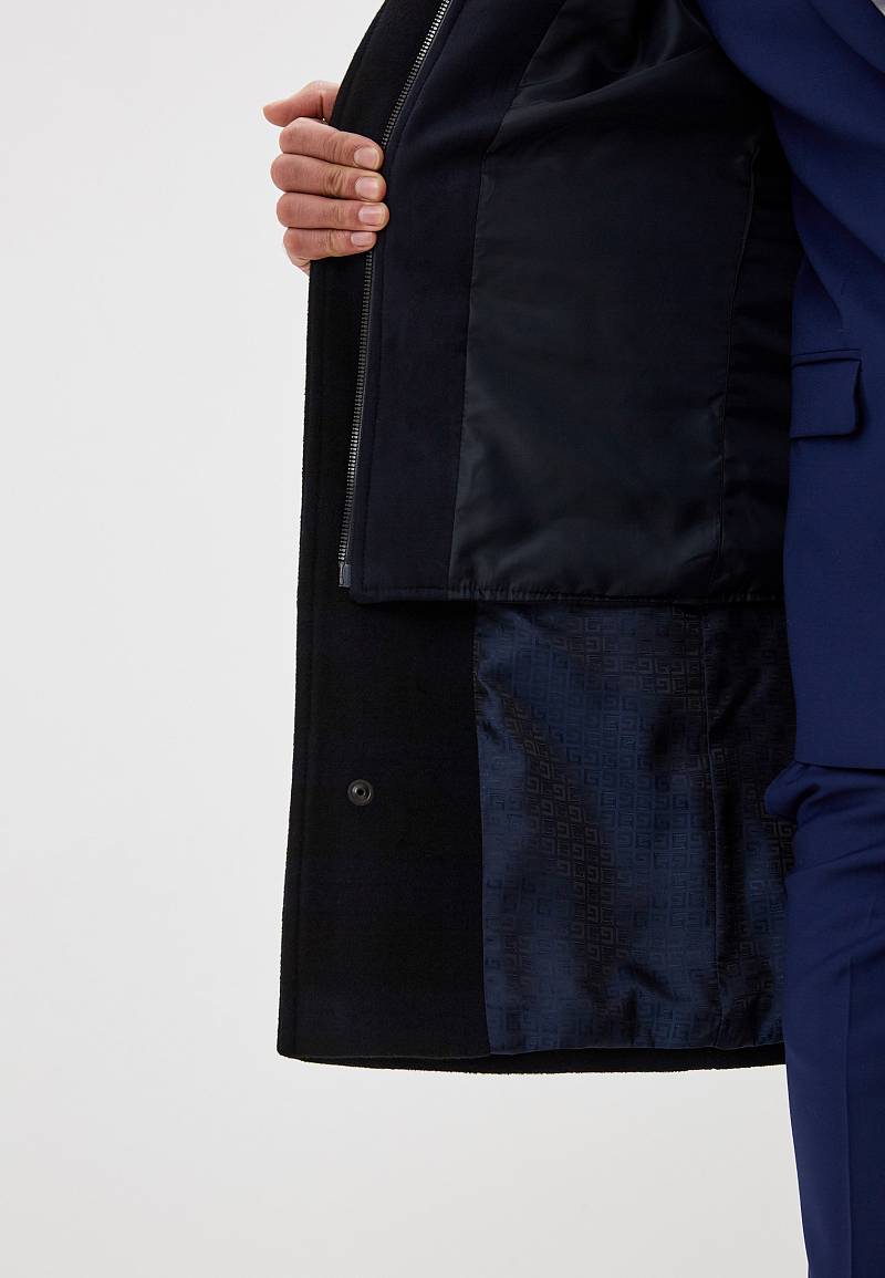 Пальто мужское с лацканами со съемным утепленным стеганым жилетом. Застежка пальто -на 3 пуговицы и нижнюю потайную кнопку. На полочках - наклонные верхние и нижние прорезные карманы с листочками. Спинка со средним швом и щлицей. Рукава втачные - с локтевым швом и внизу шлица на пуговицах. Съемный жилет с воротником стойка, выполнен из простеганной ткани с утеплителем на подкладке, застежка -на молнии. Пристегивается жилет к пальто - молниями в подборте и пуговицами, расположенными в пройме, по рельефным швам и в горловине воротника. На подкладке изделия расположен прорезной карман в рамку.