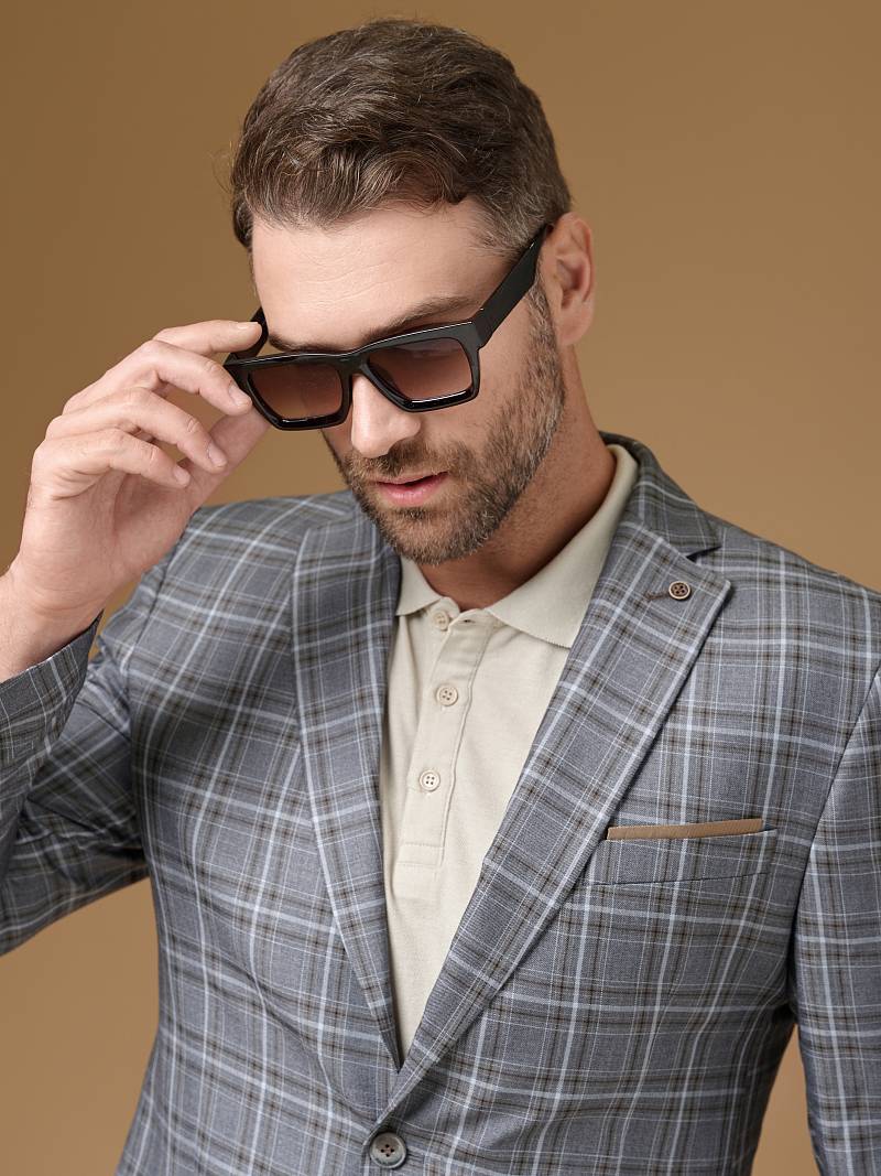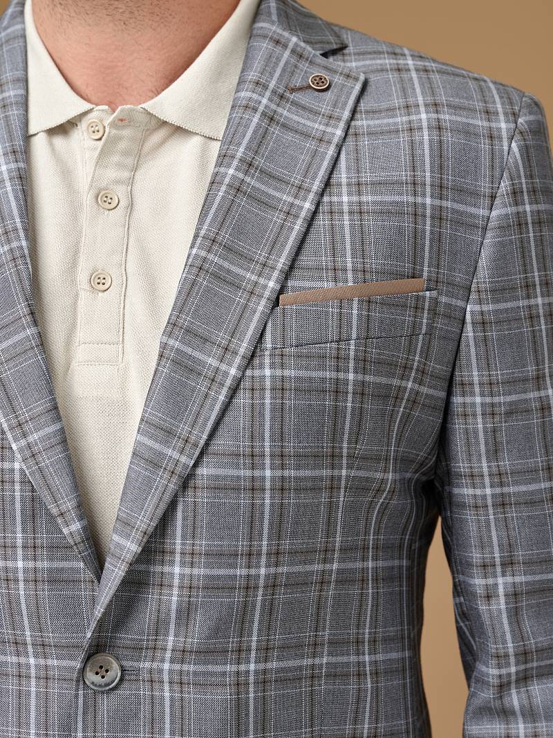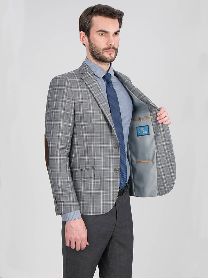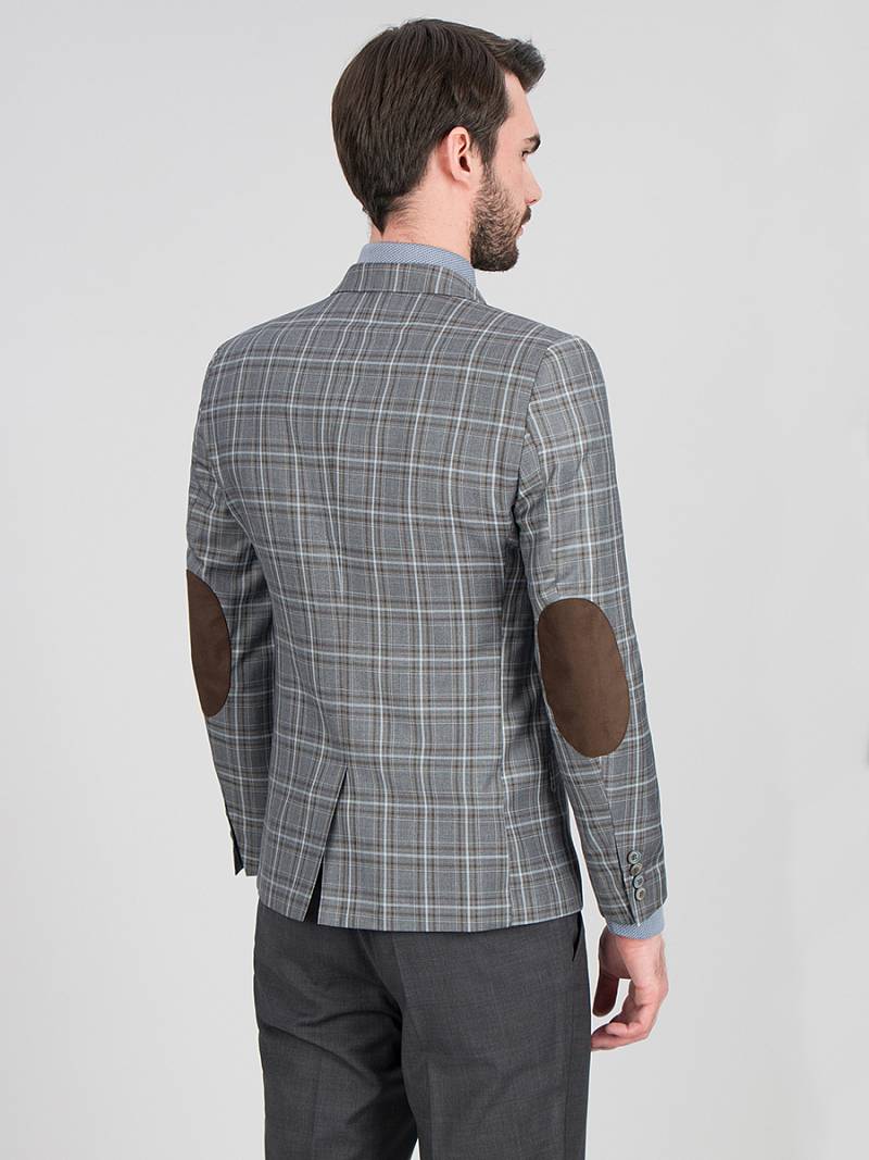 Slim fit, Классический пиджак на две пуговицы, одна шлица, рукава с налокотниками из отделочной ткани. Контрастные петли, декоративная пуговица на лацкане, нагрудный платок.