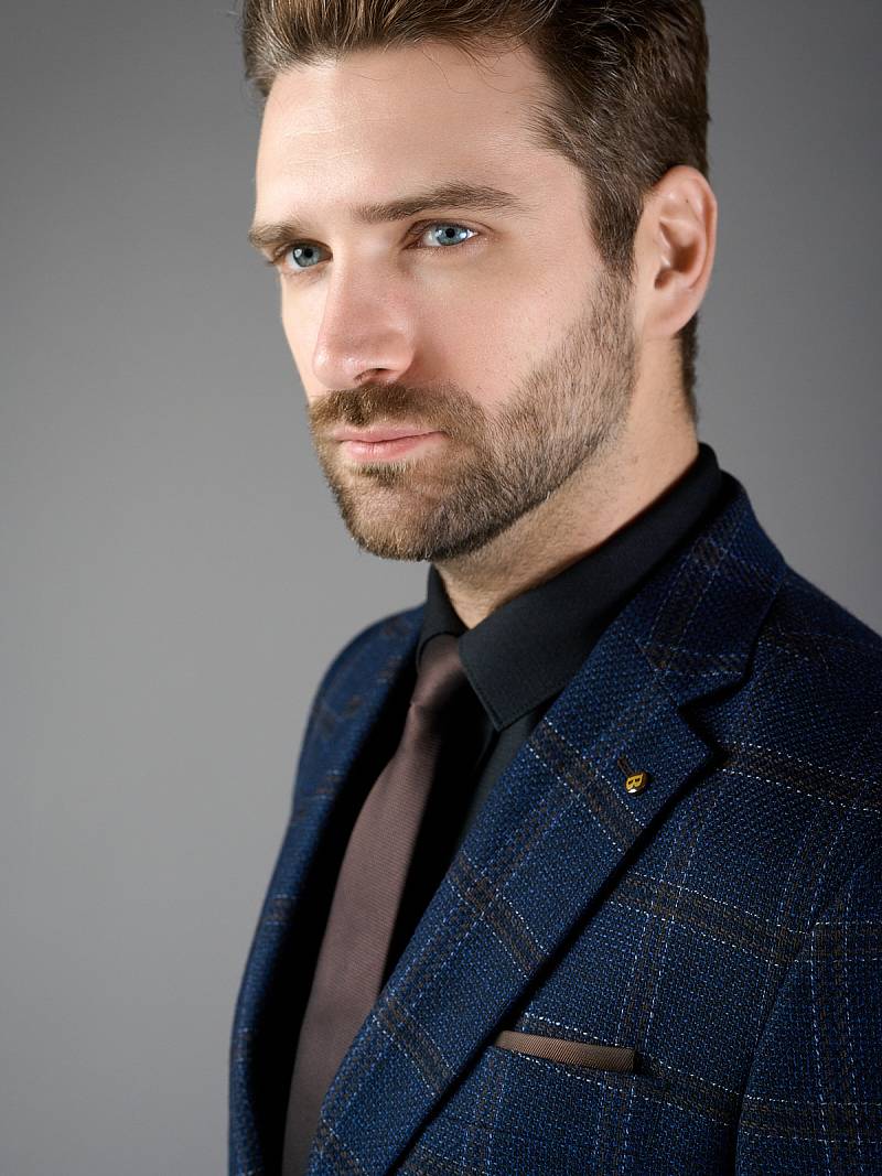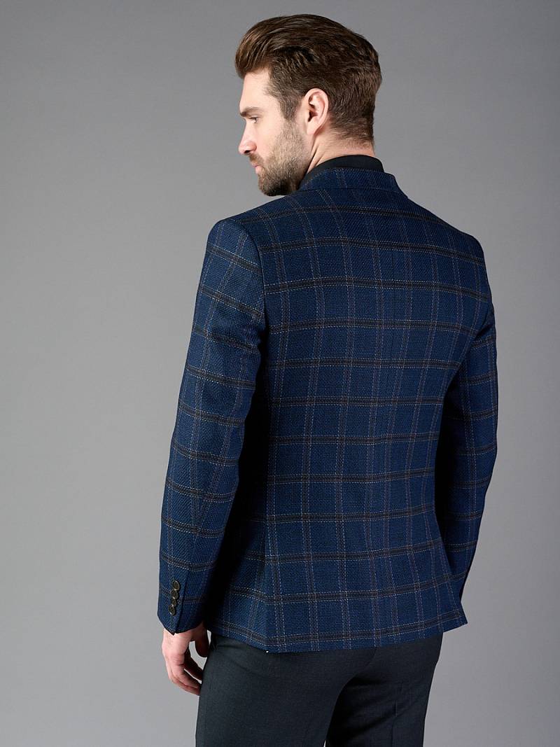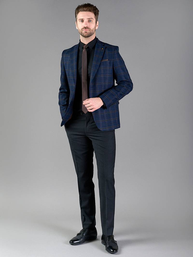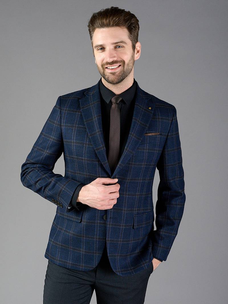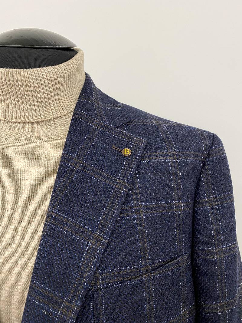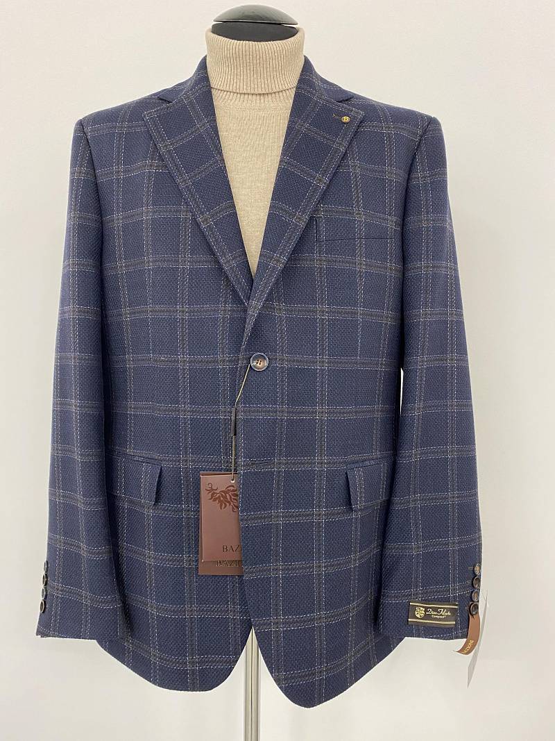 Classic fit (ПОЛУПРИЛЕГАЮЩИЙ СИЛУЭТ). Классическая однобортная модель на две пуговицы из шерстяной ткани темно-синего цвета в клетку марки BAZIONI подойдет для любого случая в жизни. Пиджак с широкими лацканами и мягкой линией плеч отлично сядет по фигуре, а расположенные по спинке две шлицы обеспечат дополнительный комфорт и свободу движения. Для придания образу торжественности подкладку нагрудного кармана можно использовать как платок-паше. Лацканы украсили небольшим значком в виде эмблемы бренда. Обработан пиджак шелковой подкладкой с двумя внутренними карманами. Дизайнеры марки BAZIONI  тщательно подходят к выбору материалов. Пуговицы подбираются и красятся индивидуально под каждую ткань, а прикладные материалы используют только от передовых производителей.    Пиджак мужской, классический, под джины, повседневный, молодежный, casual, для работы в офисе, модный, для мужа, сына, брата, на праздник.