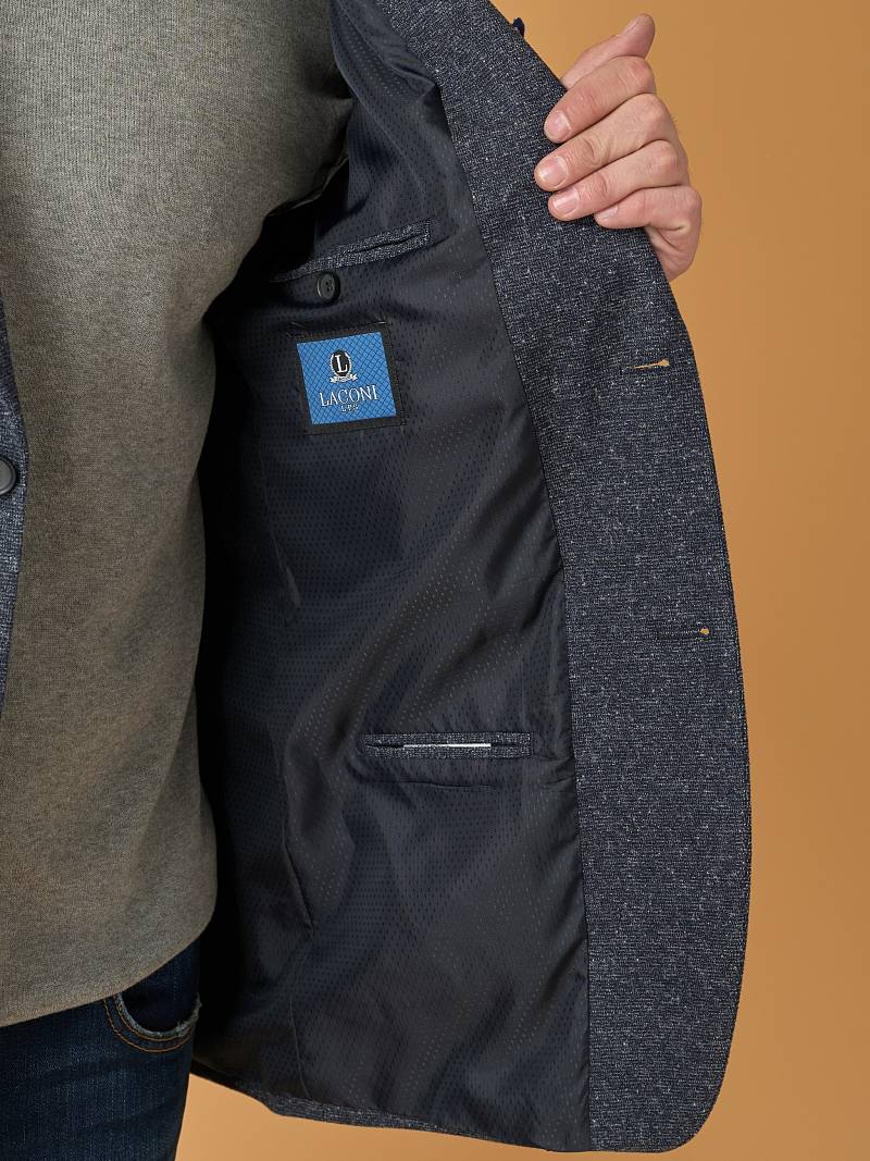 Classic fit (ПОЛУПРИЛЕГАЮЩИЙ СИЛУЭТ). Модный пиджак в стиле CASUAL выполнен из фактурной, плотной ткани. Модель с накладными карманами гармонично впишется в любой образ, его можно носить свободно под джинсы или с классическими брюкими. Пиджак с широкими лацканами и мягкой линией плеч отлично сядет по фигуре, а расположенные по спинке две шлицы обеспечат дополнительный комфорт и свободу движения. Для придания образу торжественности подкладку нагрудного кармана можно использовать как платок-паше. Обработан пиджак подкладкой с двумя внутренними карманами. Шлица на втачных рукавах украшена четырьмя декоративными пуговицами. Дизайнеры марки LACONI тщательно подходят к выбору материалов. Пуговицы подбираются и красятся индивидуально под каждую ткань, а прикладные материалы используют только от передовых производителей.