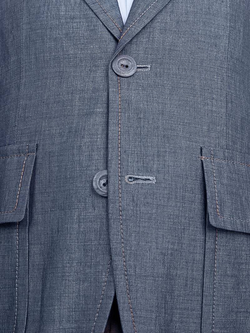 Пиджак на двух пуговицах, острый лацкан, накладные карманы с клапаном.