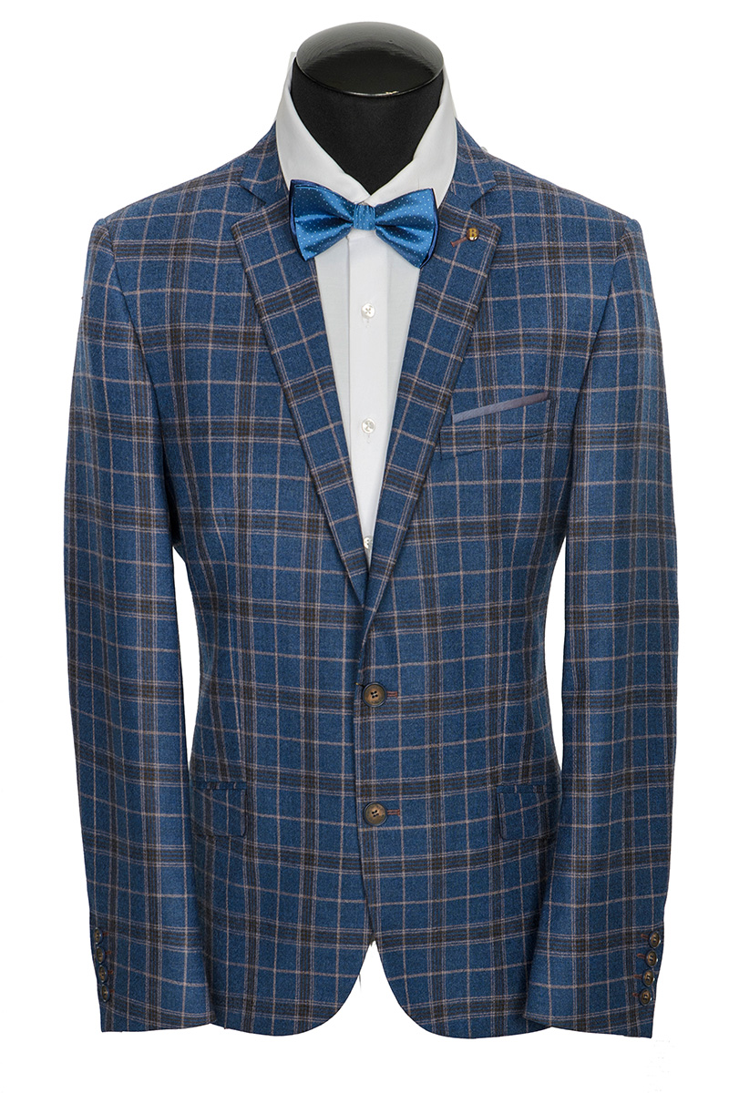 Slim fit, две пуговицы, одна шлица. Нагрудный платок из отделочной ткани. контрастные петли. декоративная пуговица на лацкане.