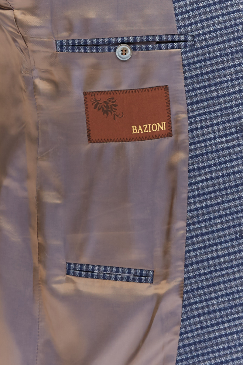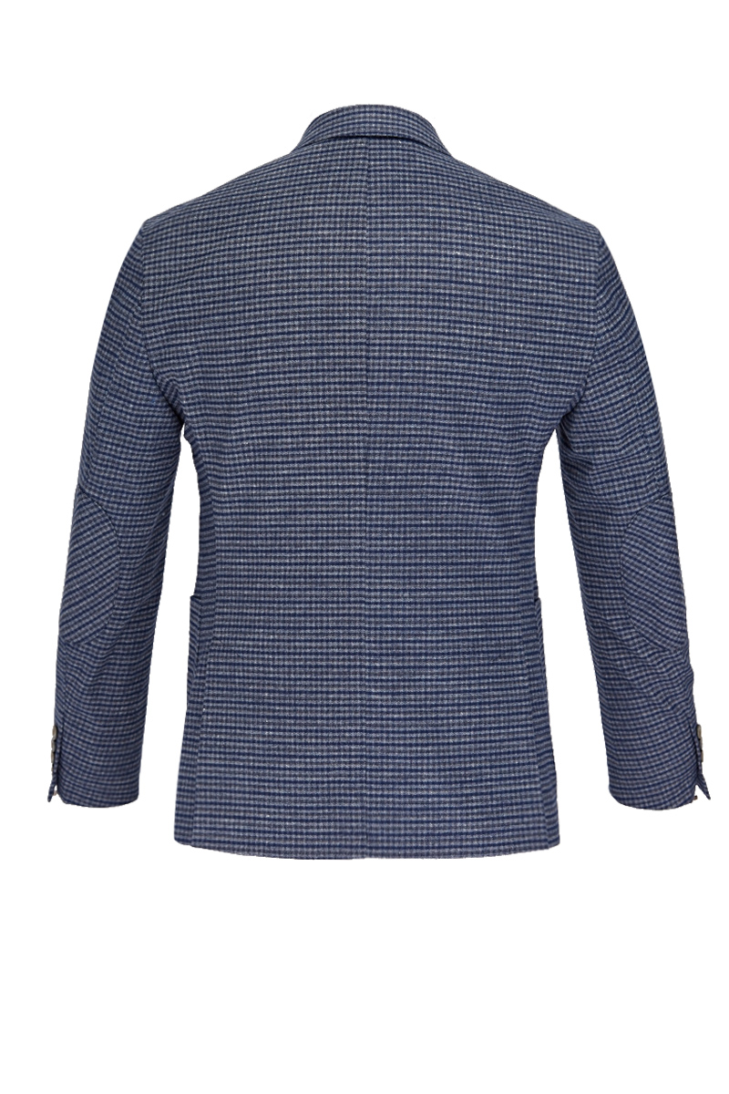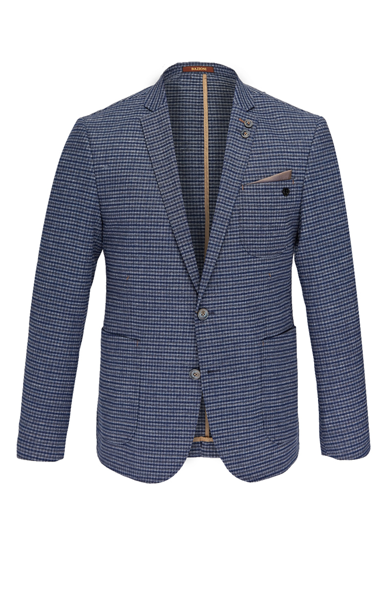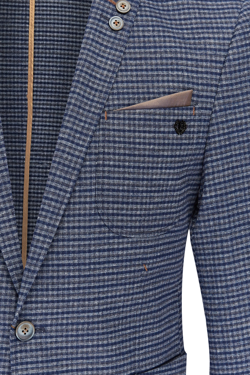 Ultra slim fit, две пуговицы, одна шлица, спинка без подкладки, накладные карманы. Закрепки отделочные - в углах накладных карманов. Декоративный платок в нагрудном кармане. Налокотники на рукавах. Две фасонные петли с пуговицами на лацкане.