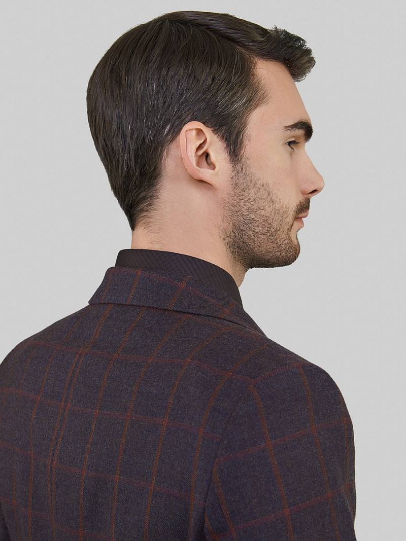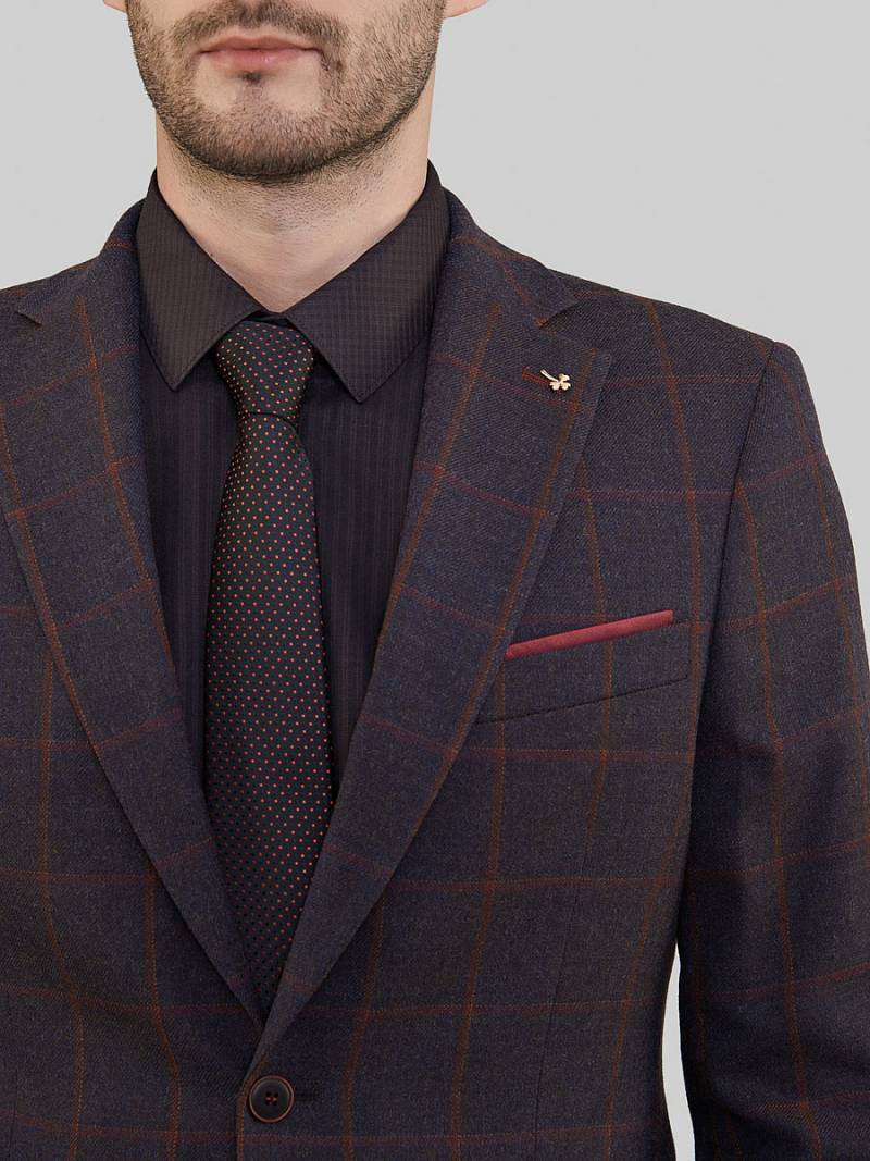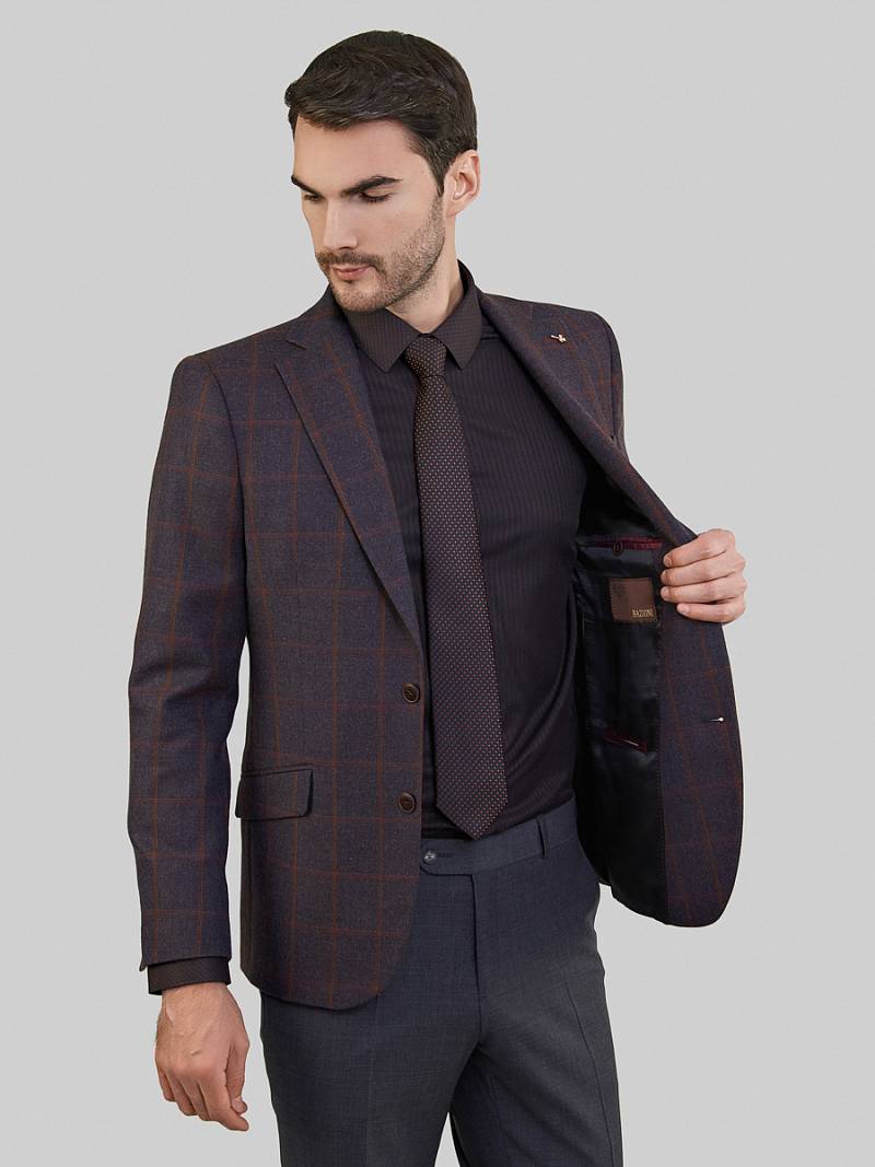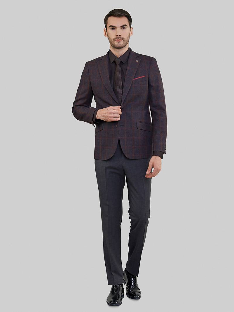 Slim fit. Классический мужской пиджак на две пуговицы, спинка без подкладки, с боковыми и нагрудным карманами, по спинке две шлицы.