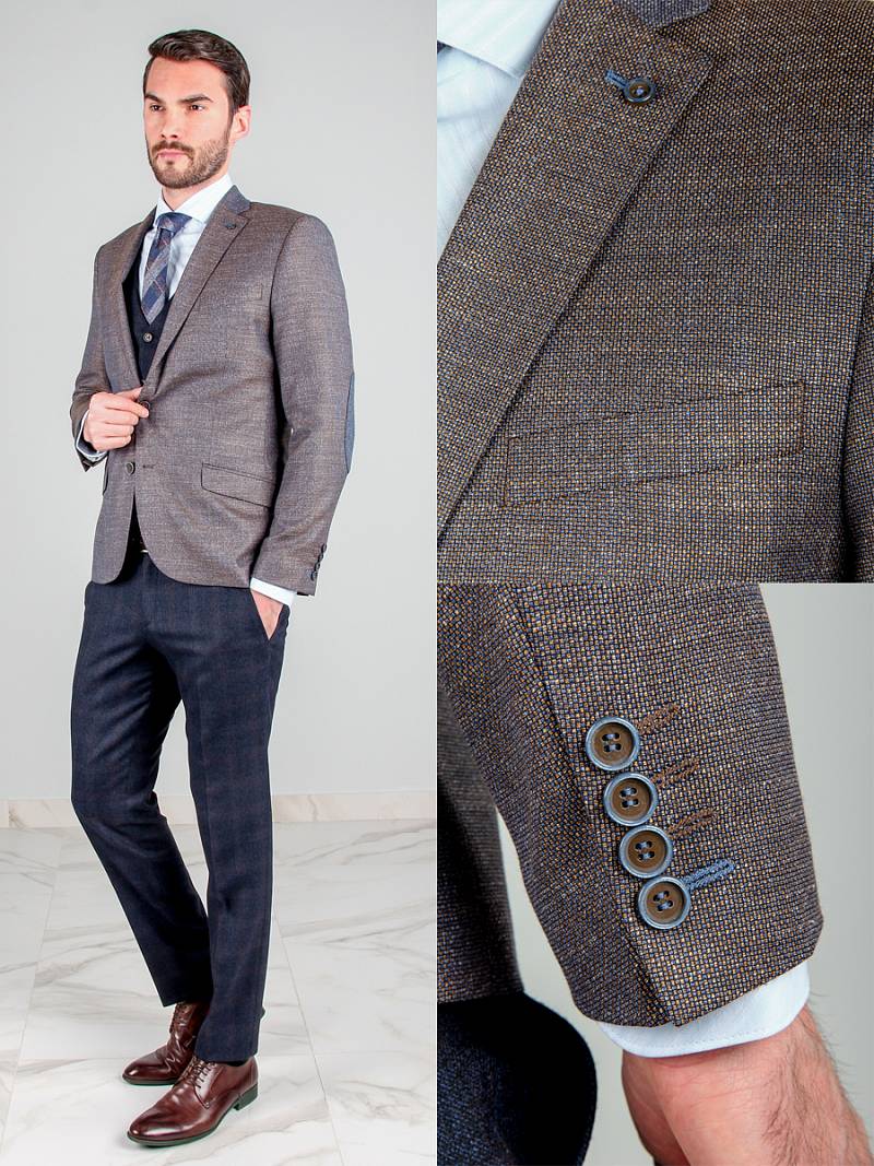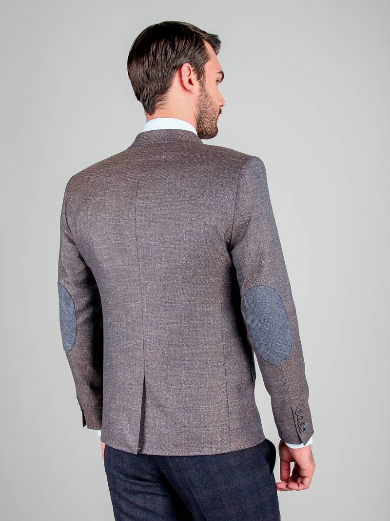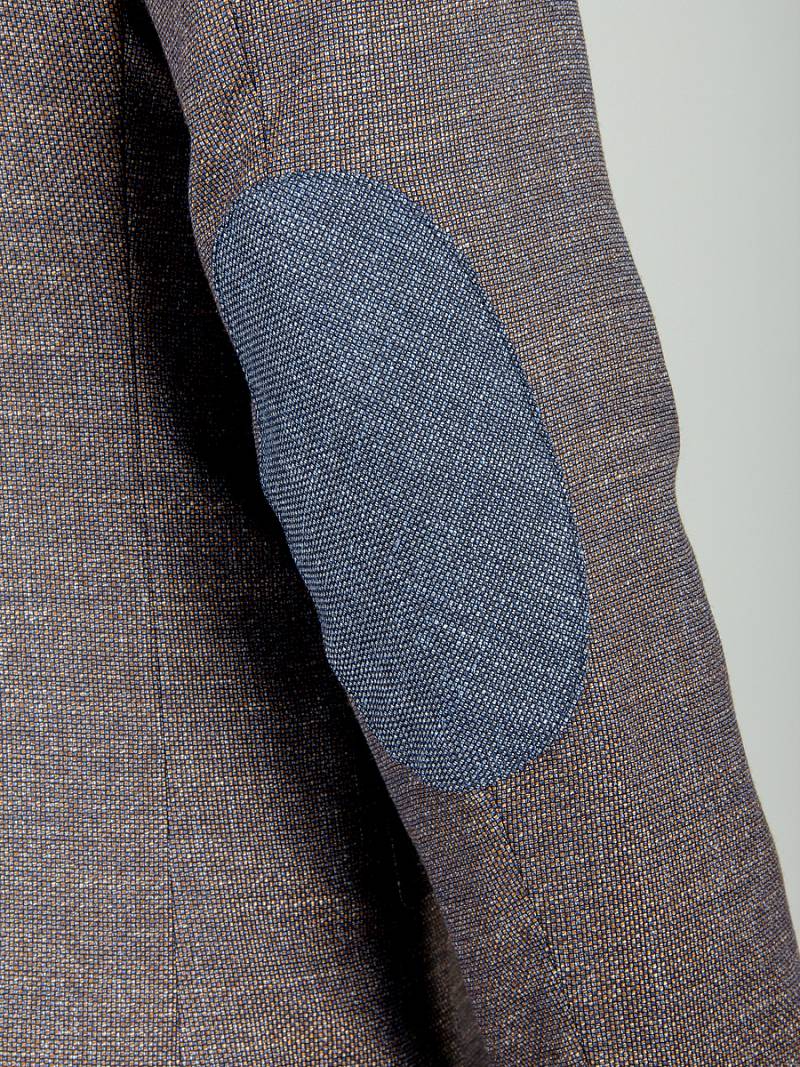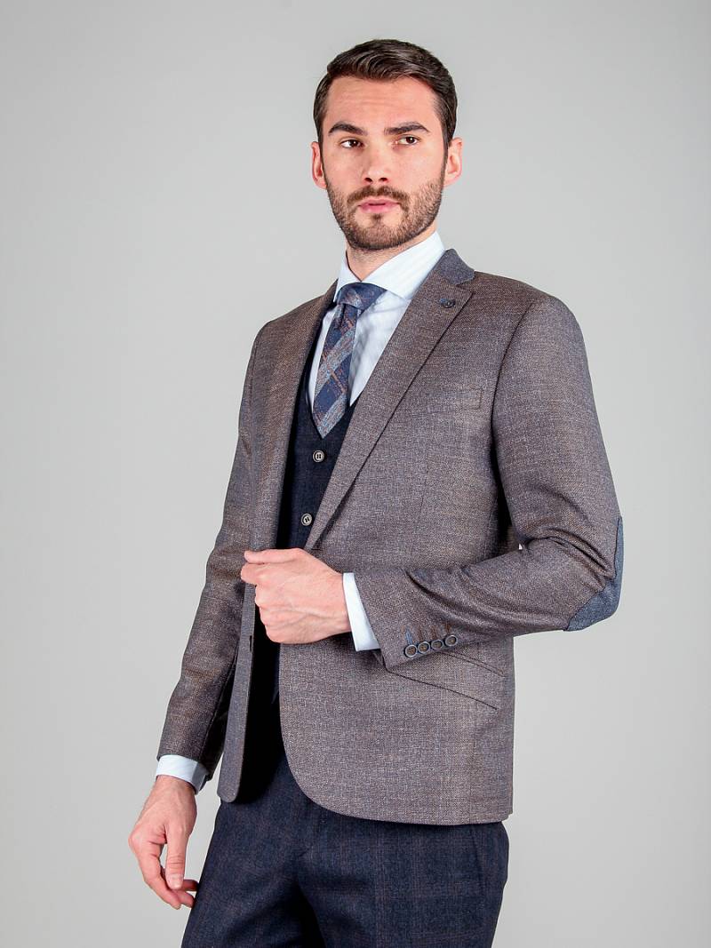 Slim fit, Классический мужской пиджак на две пуговицы, с боковыми и нагрудным карманами, на рукавах налокотники из отделочной ткани.