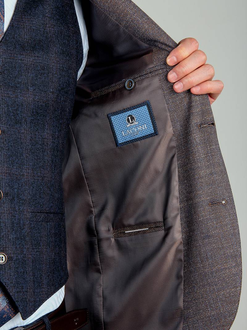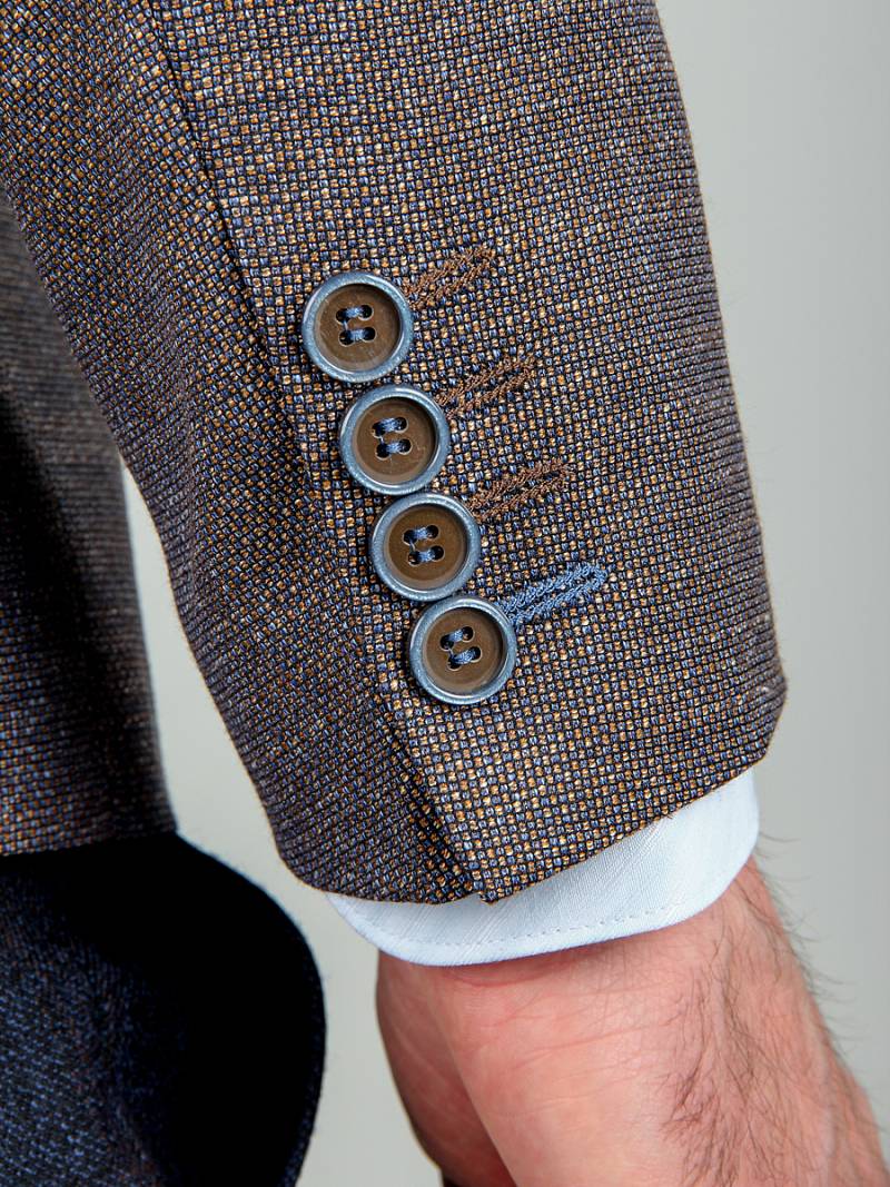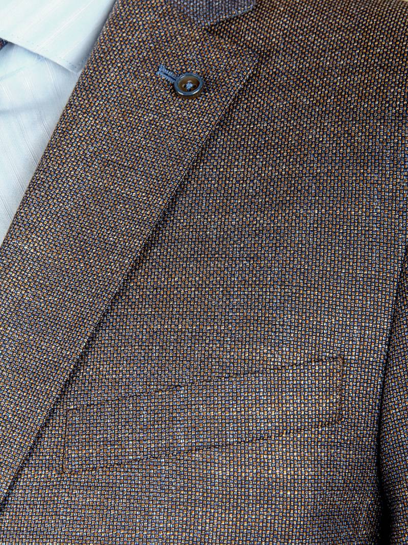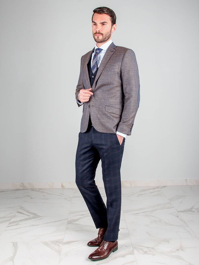 Slim fit, Классический мужской пиджак на две пуговицы, с боковыми и нагрудным карманами, на рукавах налокотники из отделочной ткани.