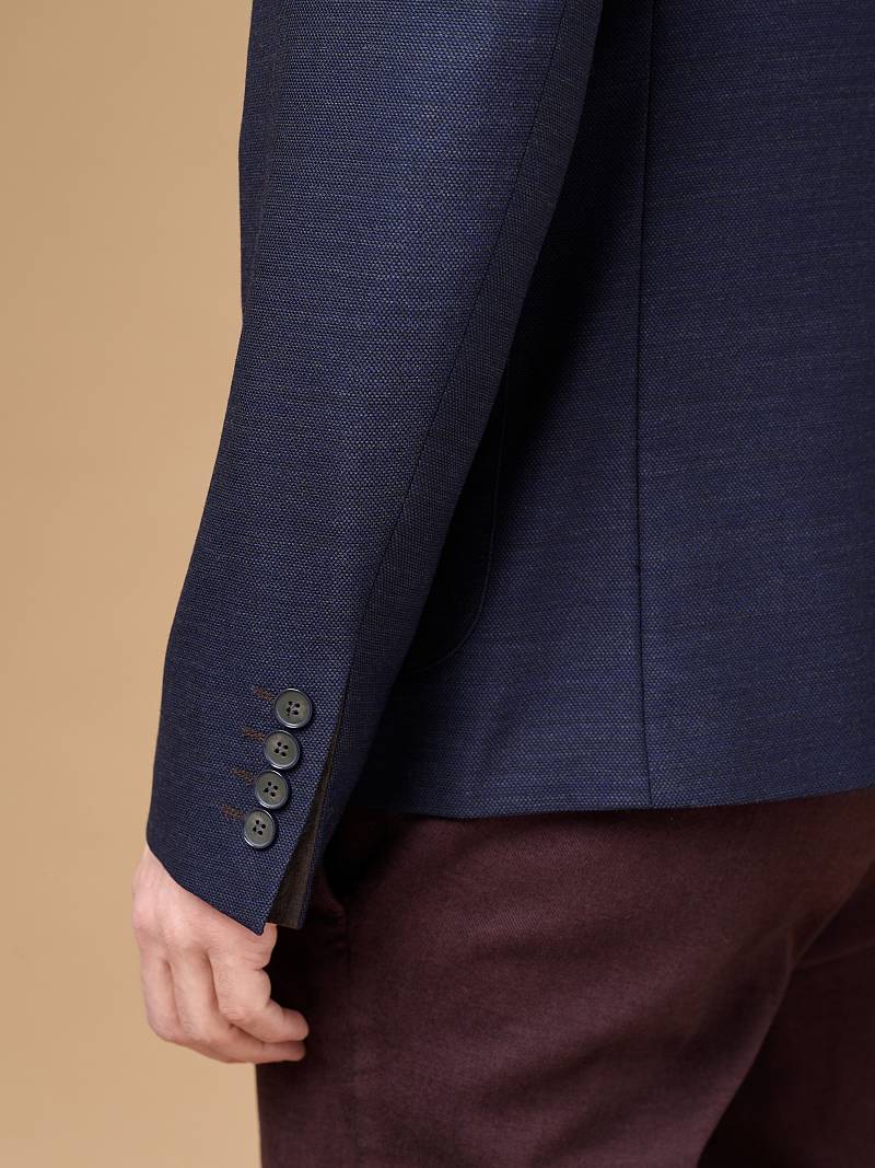 Slim fit, две пуговицы, одна шлица.Накладные боковые карманы, контрастрые петли.