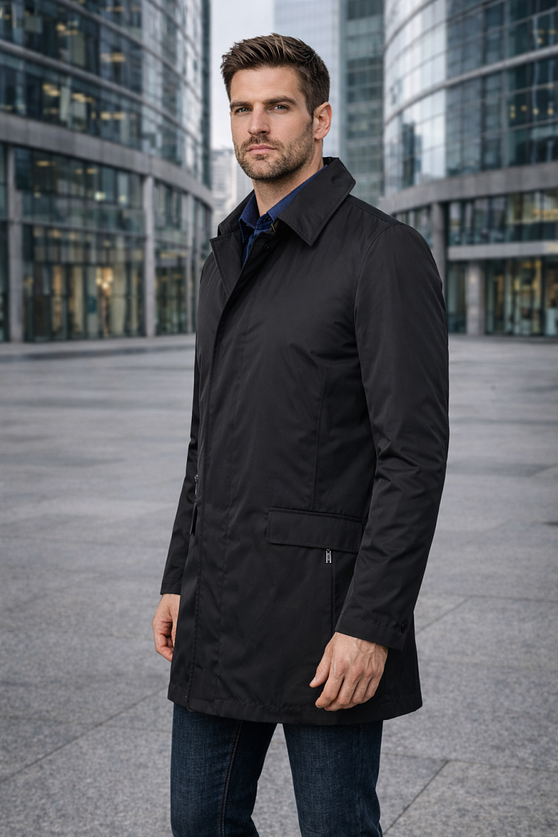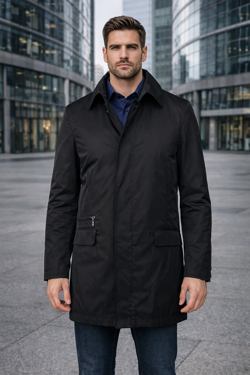 Плащ приталенный на супатной застежке, 2 боковых кармана с клапанами, 1 на молнии. Длина по спинке для роста 176 - 82см. Ткань верха: 100% полиэстер. Подкладка: 100% полиэстер. Без утеплителя.