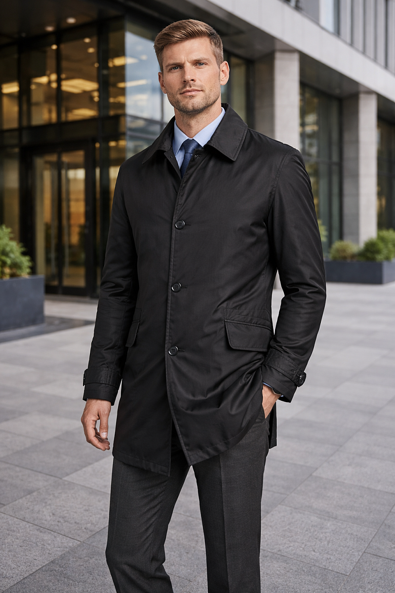 Плащ приталенный на супатной застежке, 2 боковых кармана с клапанами, 1 на молнии. Длина по спинке для роста 176 - 82см. Ткань верха: 100% полиэстер. Подкладка: 100% полиэстер. Без утеплителя.