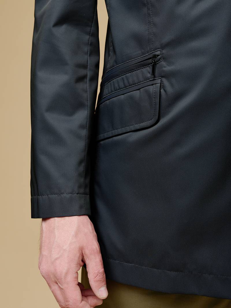 Плащ мужской не утепленный на подкладке. Classic fit. Центральная супатная застежка на 3 пуговицы+1 верхняя пуговица насквозь. Воротник отложной с стойкой, на стойке крючок. Боковые карманы прорезные с клапаном+ на правой полочке карман на молнии. Спинка со средним швом и шлицей. Рукав втачной двухшовный. В нижней части рукава,по локтевому шву, по три декоративные пуговицы. Два внутренних кармана на молнии. Ткань верха: 100% полиэстер. Подкладка: 100% полиэстер. Длина по спинке для роста 176 - 82см.