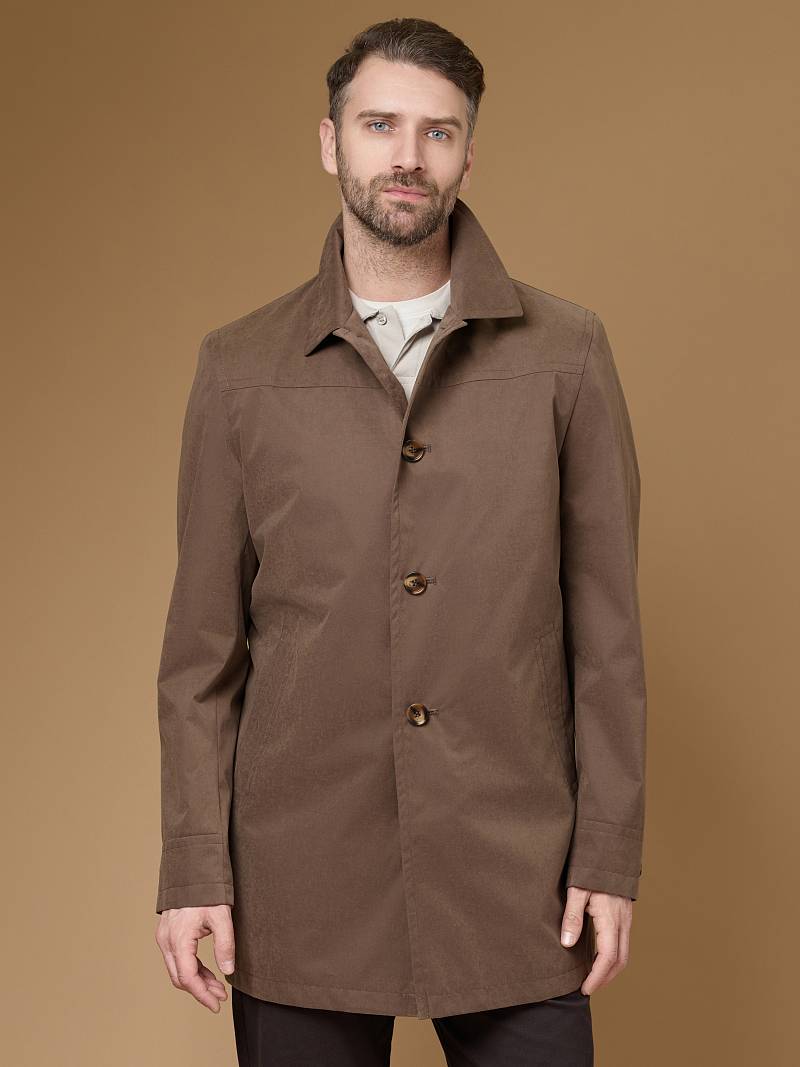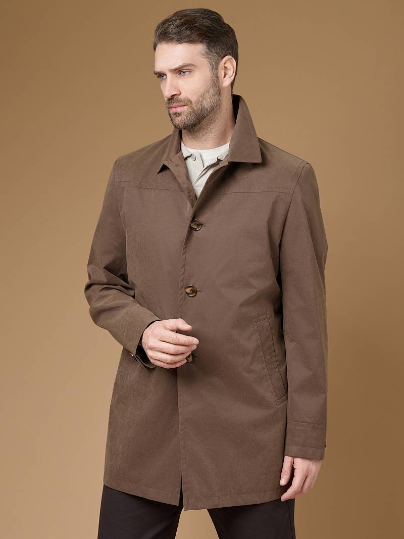 Плащ мужской классический полуприлегающего силуэта, 4 пуговицы и 1 шлица. Длина изделия по спинке для роста 176 - 85см. Ткань верха: 55% нейлон, 45% хлопок. Подкладка: 100% полиэстер. Без утеплителя
