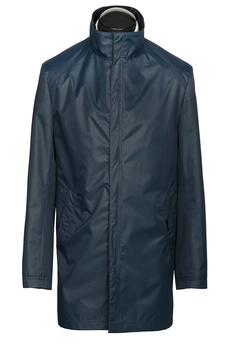 Плащ мужской, центральная застёжка на молнию, воротник -стойка, боковые карманы -прорезные с втачными листочками, полочка и спинка с отрезными кокетками, спинка со средним швом и шлицей на двух потайных кнопках, на левом кармане-нашивка с логотипом, на подкладке два внутренних кармана на молниях. Без утеплителя.