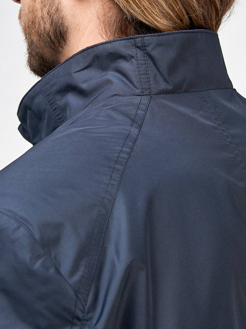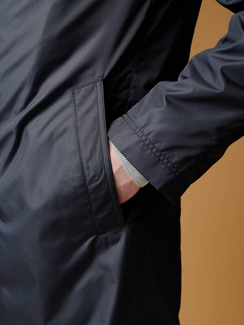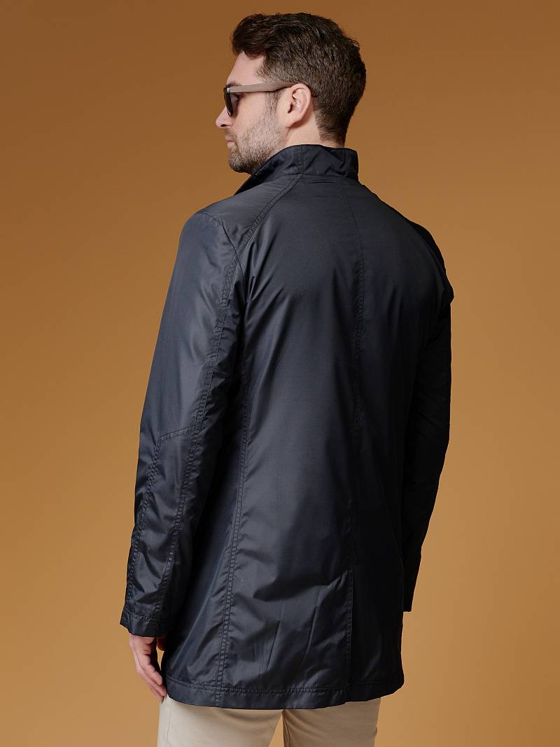 Плащ мужской, центральная застёжка на молнию, воротник -стойка, боковые карманы -прорезные с втачными листочками, полочка и спинка с отрезными кокетками, спинка со средним швом и шлицей на двух потайных кнопках, на левом кармане-нашивка с логотипом, на подкладке два внутренних кармана на молниях. Длина изделия по спинке для размера роста 50/176-85см. Ткань верха: 100% полиэстер. Подкладка: 100% полиэстер. Без утеплителя.
