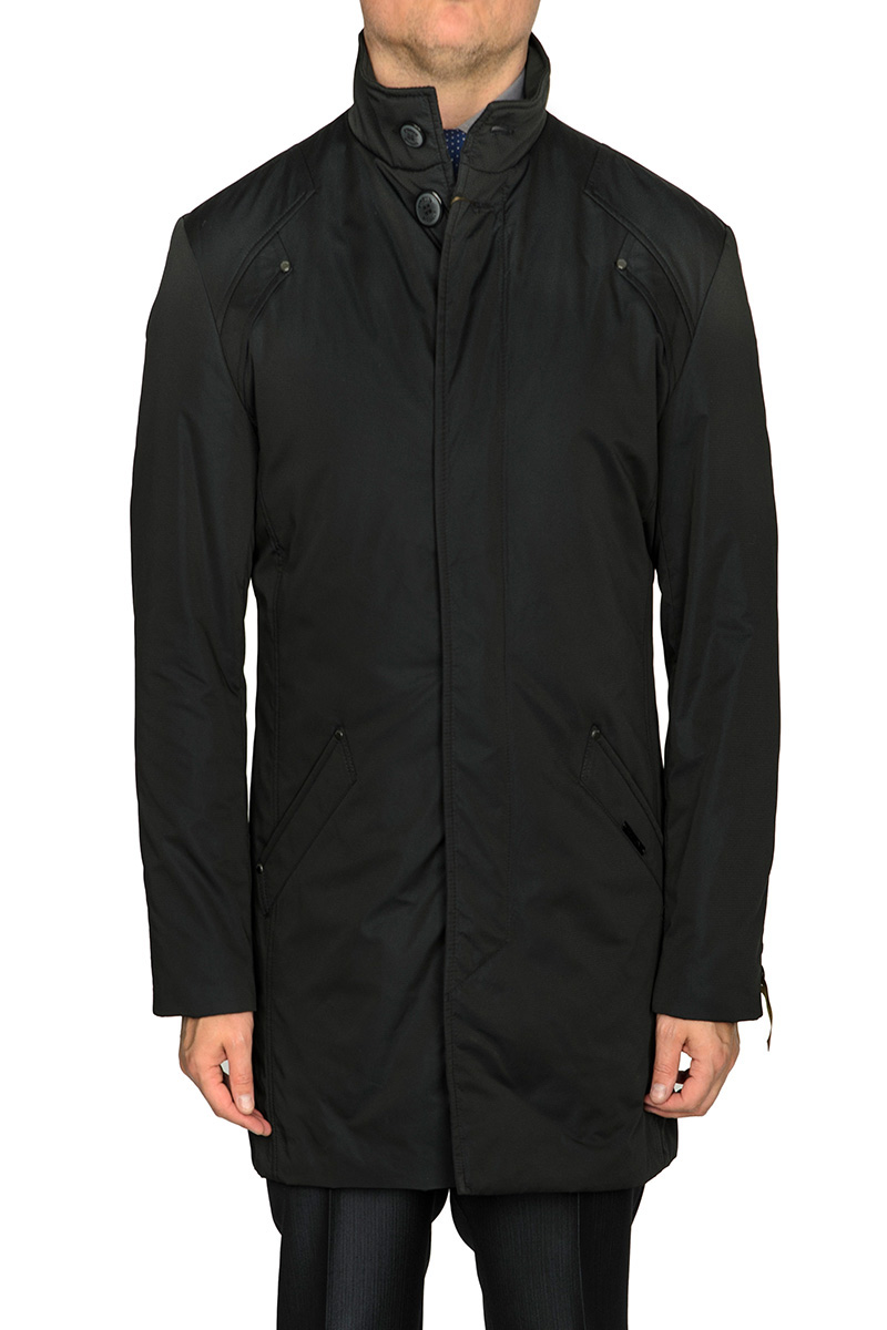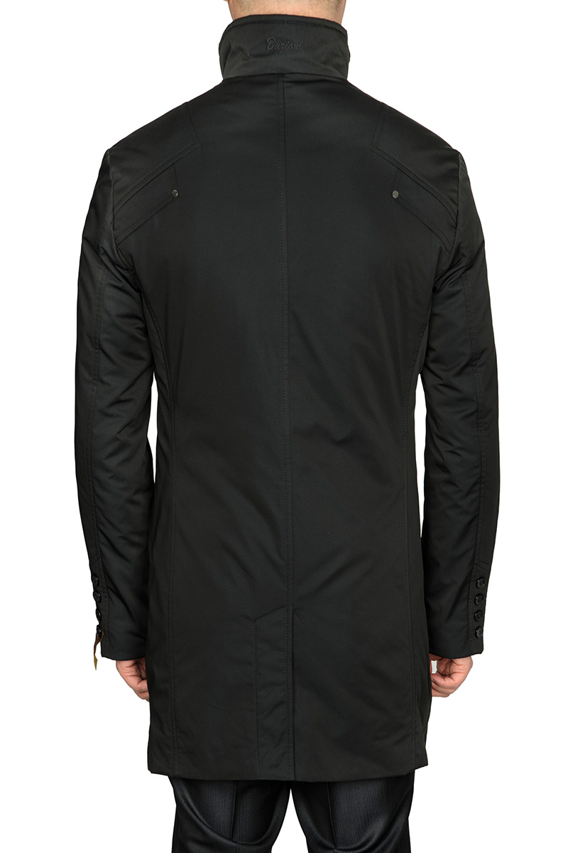 Плащ мужской полуприлегающего силуэта с супатной (потайной) застежкой на пуговицы, 1 шлица, фигурные кокетки, воротник - стойка