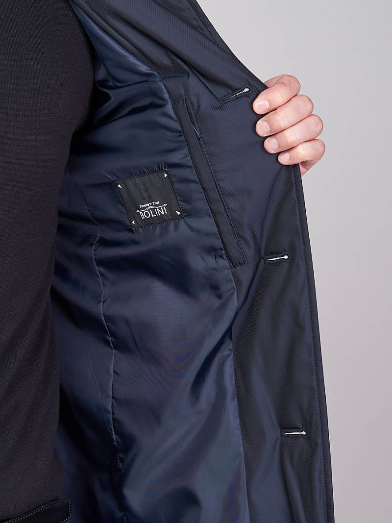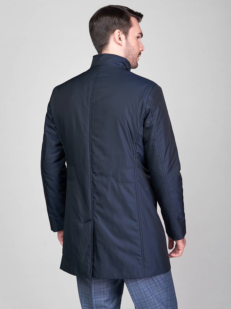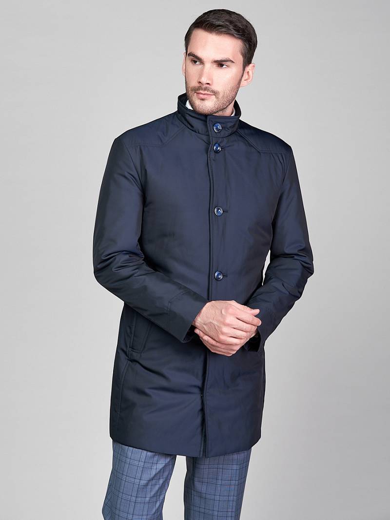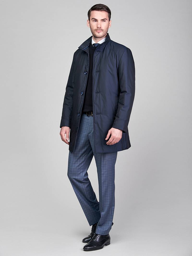 Плащ мужской утепленный, однобортный, с центральной застежкой на пуговицы. Воротник стойка, Рукав втачной двухшовный, Спинка с центральным швом и шлицей. На подкладке два внутренних кармана на молнии. Длина спинки для роста 176 - 90см. Ткань верха: 100%полиэстер. Подкладка: 100%полиэстер. Утеплитель: термоплюс 80гр