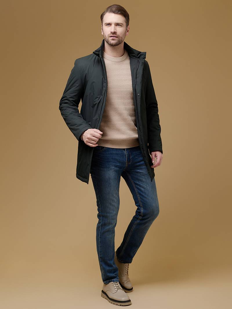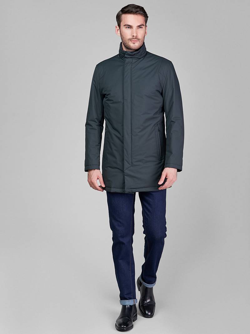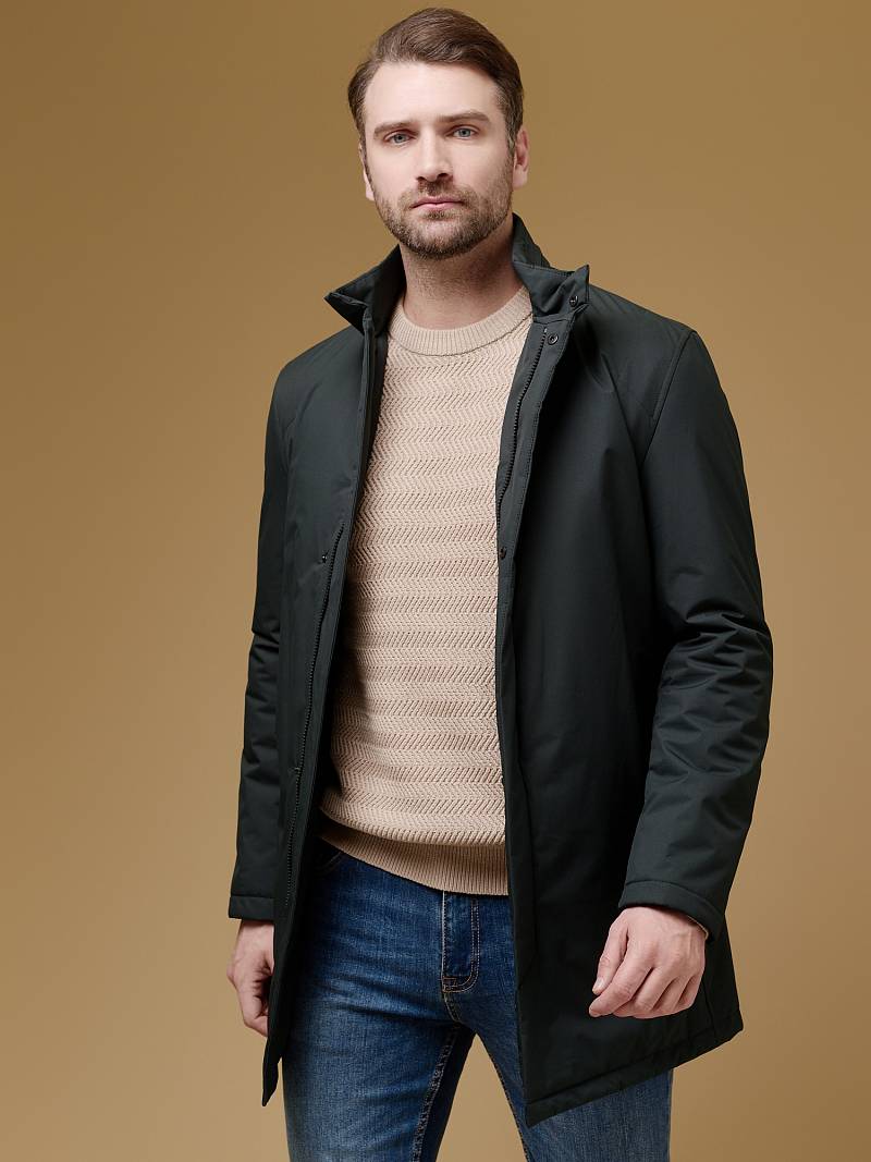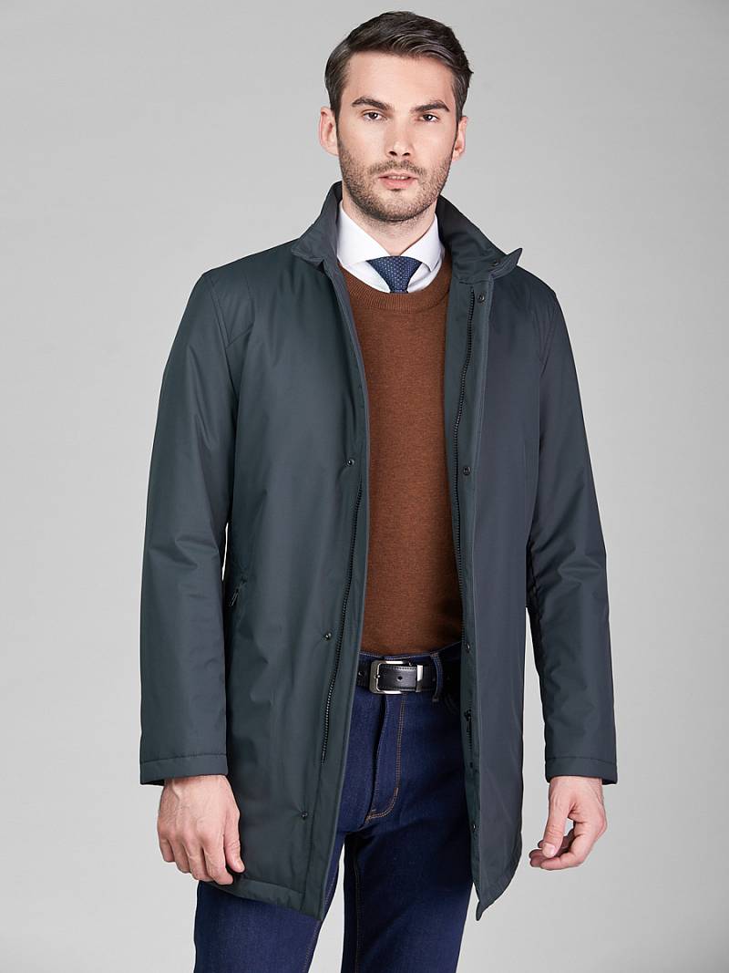 Плащ мужской классический полуприлегающего силуэта на легком утеплителе. Застёжка центральная на молнию и потайные кнопки. Воротник стойка. Полочка и спинка с отрезными боковыми частями. Боковые карманы прорезные "в рамку" на молнии. Спинка со средним швом и одной шлицей. Рукав втачной двухшовный. На подкладке два внутренних кармана на молнии. Длина изделия по спинке для роста 176 - 86см. Ткань верха: 100%полиэстер. Подкладка: 100%полиэстер. Утеплитель: термоплюс 60гр
