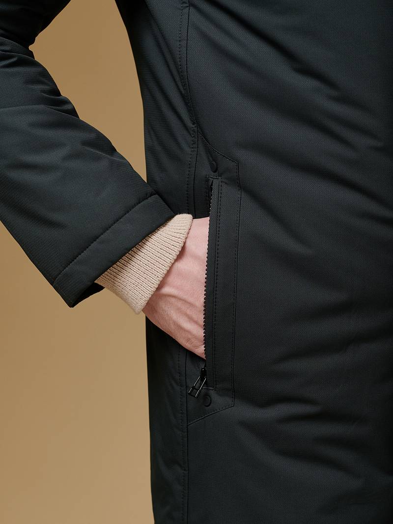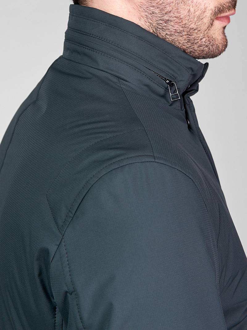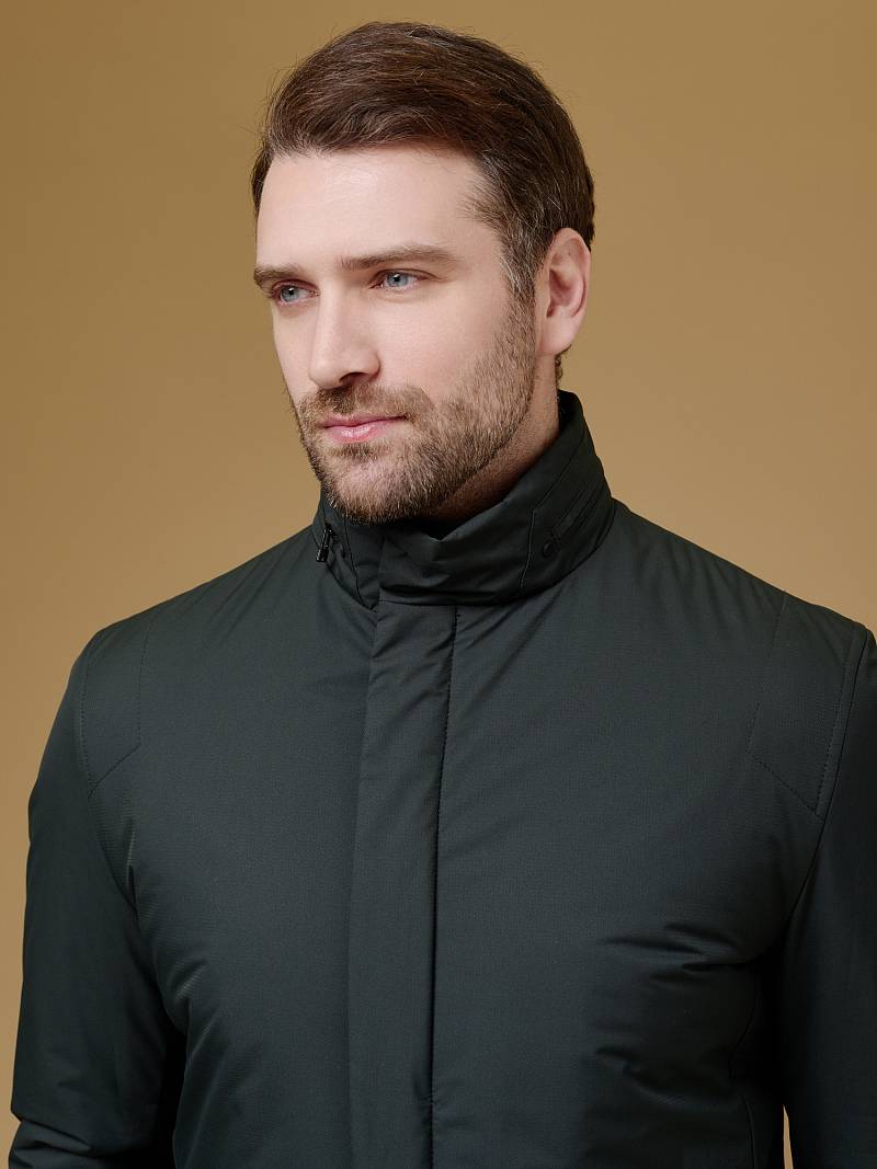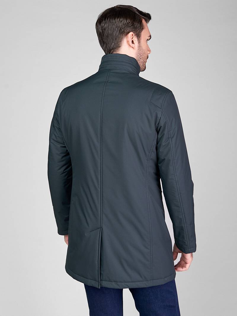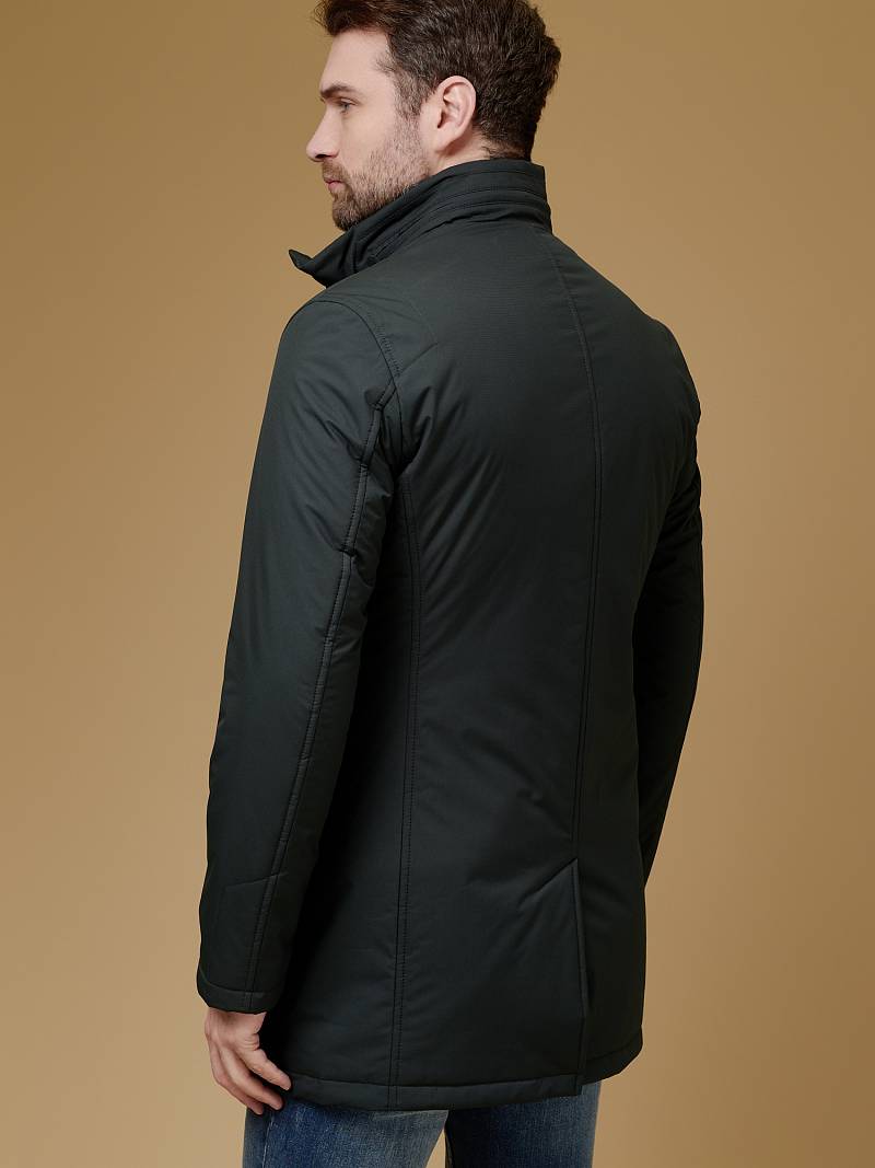 Плащ мужской классический полуприлегающего силуэта на легком утеплителе. Застёжка центральная на молнию и потайные кнопки. Воротник стойка. Полочка и спинка с отрезными боковыми частями. Боковые карманы прорезные "в рамку" на молнии. Спинка со средним швом и одной шлицей. Рукав втачной двухшовный. На подкладке два внутренних кармана на молнии. Длина изделия по спинке для роста 176 - 86см. Ткань верха: 100%полиэстер. Подкладка: 100%полиэстер. Утеплитель: термоплюс 60гр