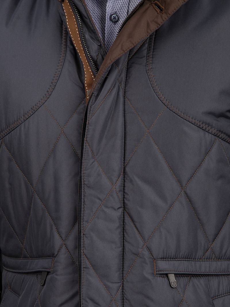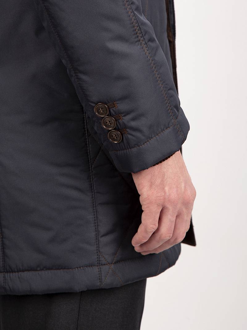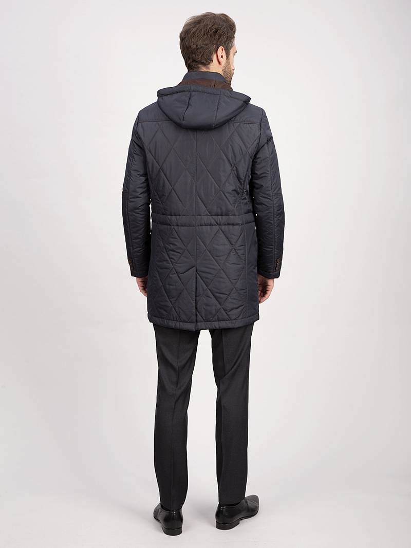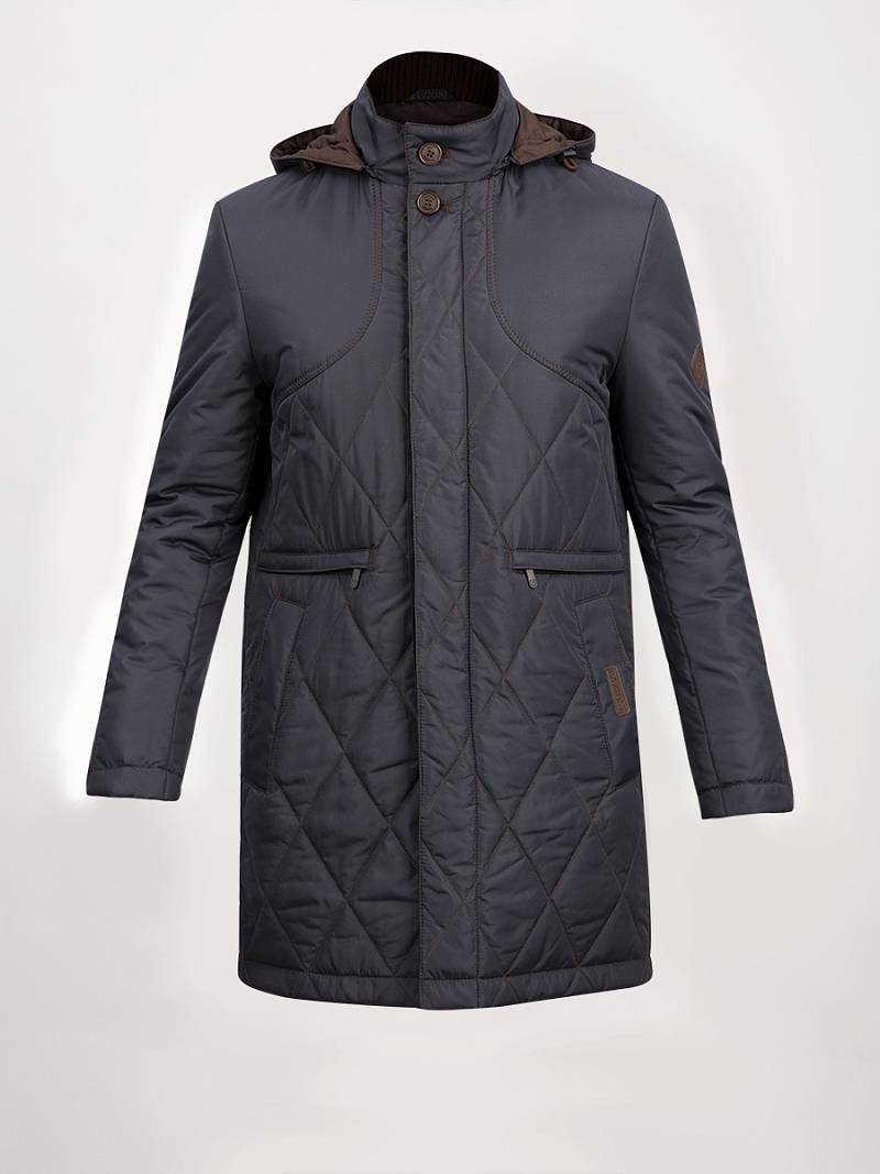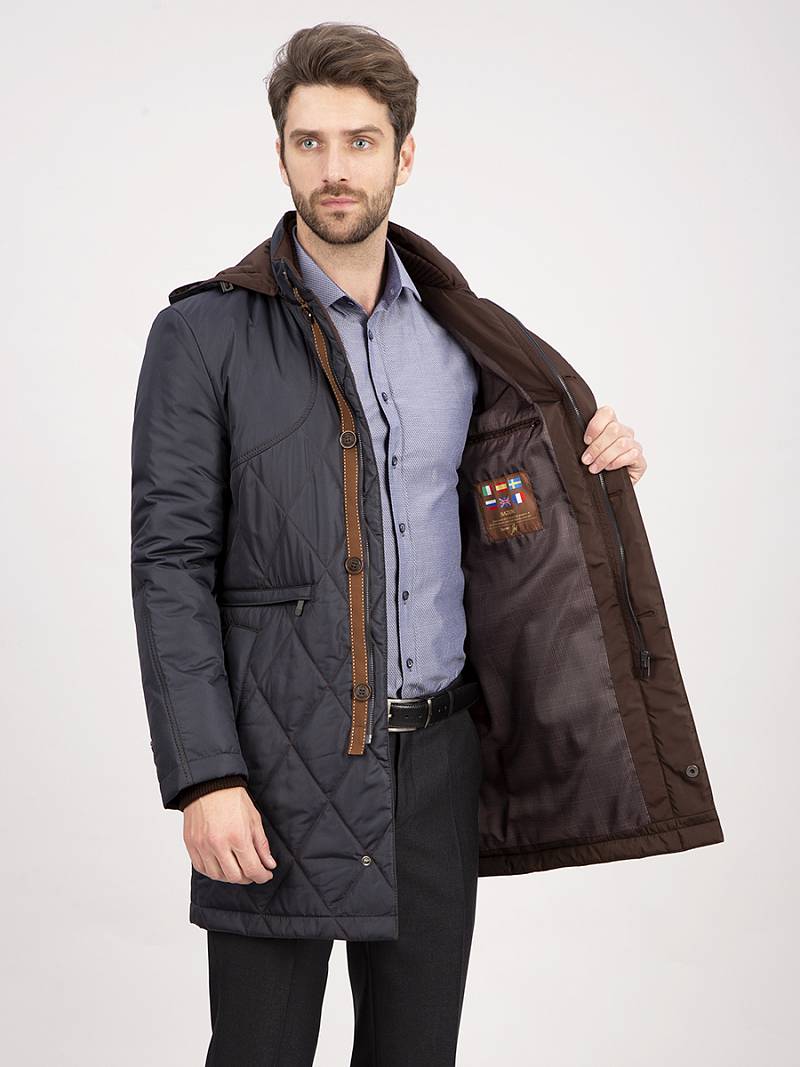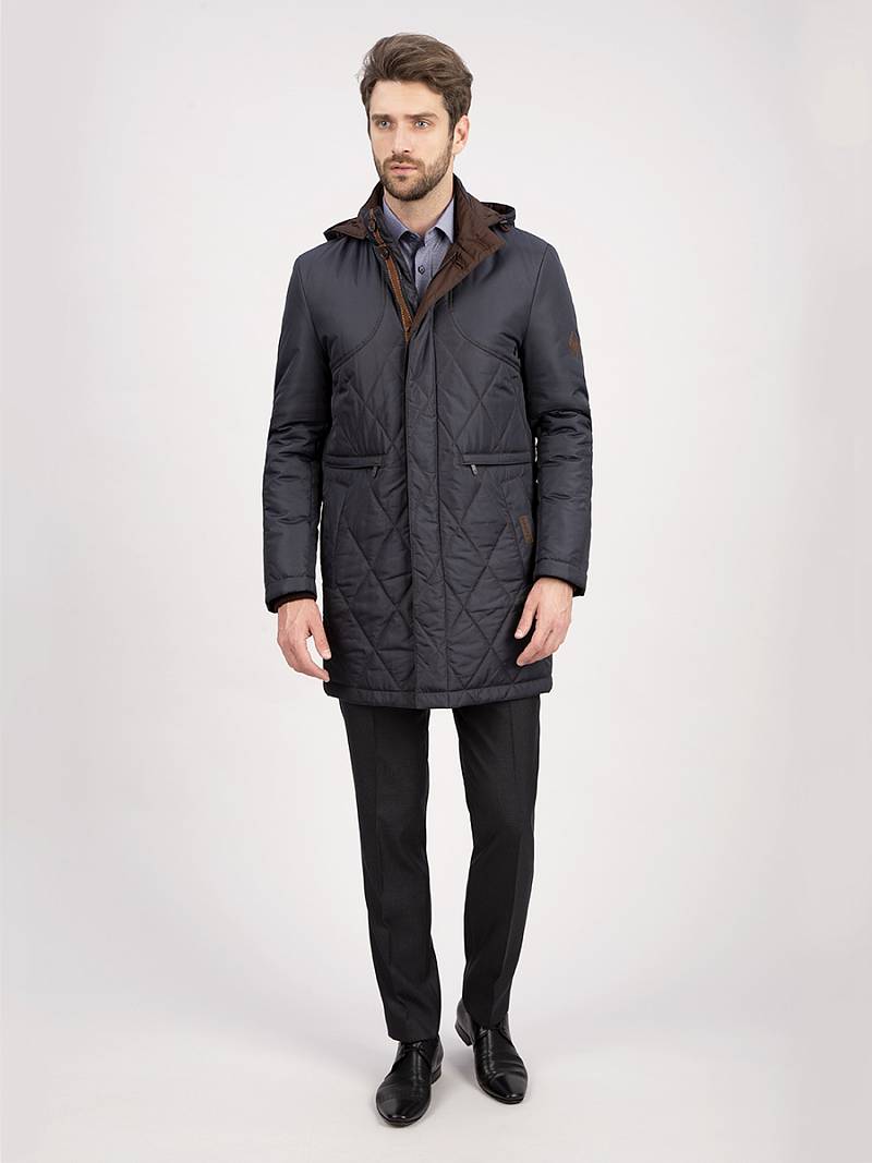Плащ мужской утепленный прямого силуэта с отстегивающимся капюшоном. Застёжка - потайная на 5 пуговиц и по низу 1 потайную кнопку. Воротник - стойка, нижний воротник из трикотажа. Полочки и спинка - простеганы стежкой "ромб". На полочках и на спинке - кокетки, по которым проложена декоративная строчка "Зигзаг" в цвет отделки. По спинке - 1 шлица в среднем шве. Карманы на полочках - два горизонтальных и два наклонных с листочками, застегивающиеся на магниты. На рукавах - также проложена декоративная строчка "Зигзаг" в цвет отделки. На подкладке полочек - два внутренних прорезных кармана в рамку.
