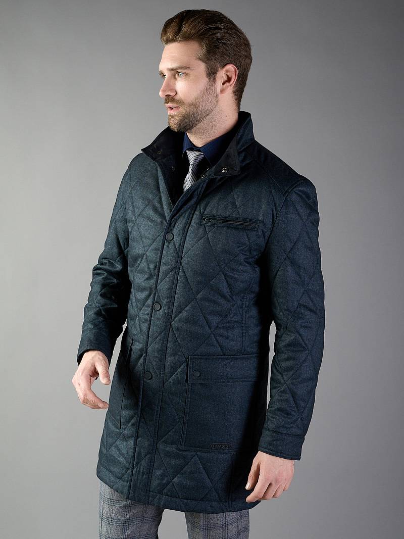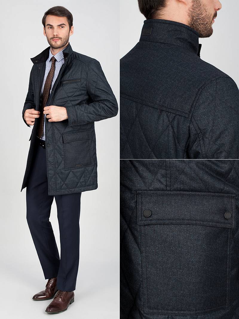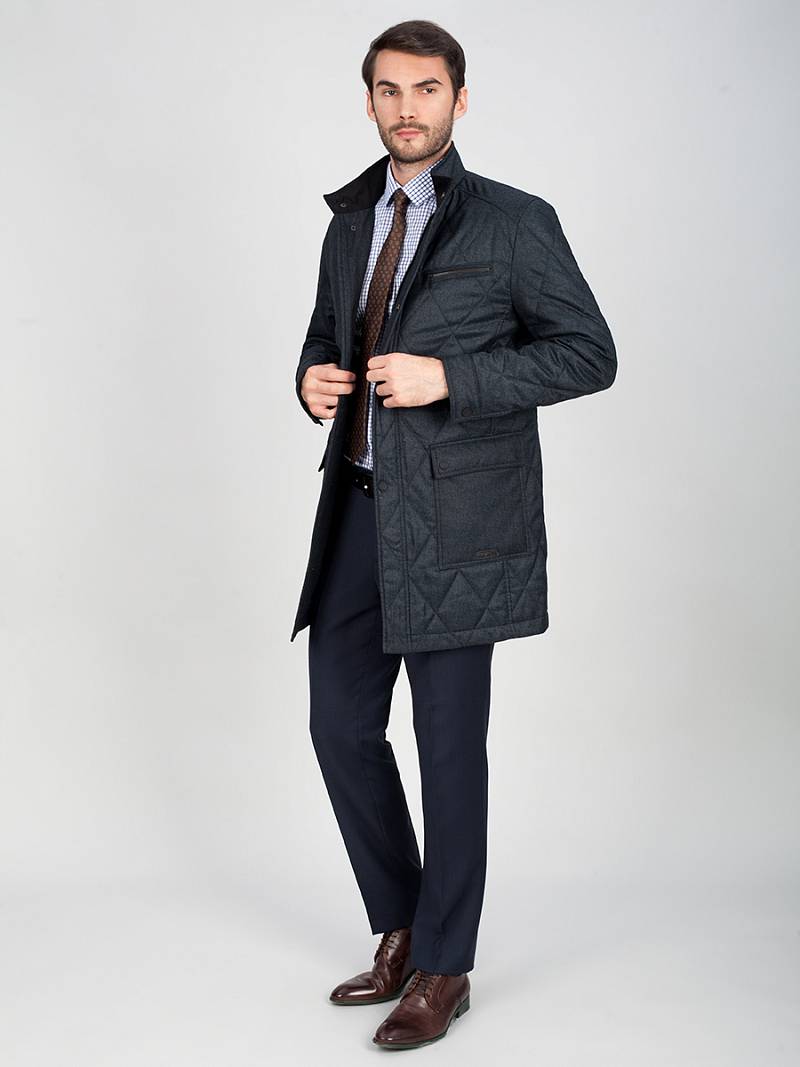 Плащ мужской утепленный из стеганной ткани, однобортный. Застежка центральная на молнию и кнопки. Воротник стойка, Полочка и спинка с отрезными кокетками. На полочке боковые накладные карманы с клапаном+ на левой полочке нагрудный прорезной карман "с листочкой". Рукав втачной двухшовный. Спинка со средним швом и 2 шлицами. На подкладке два внутренних кармана на молнии. Длина изделия по спинке для роста 176- 90см. Ткань верха: 100%полиэстер. Подкладка: 100%полиэстер. Утеплитель: термоплюс 100гр.