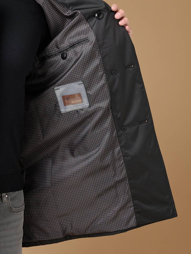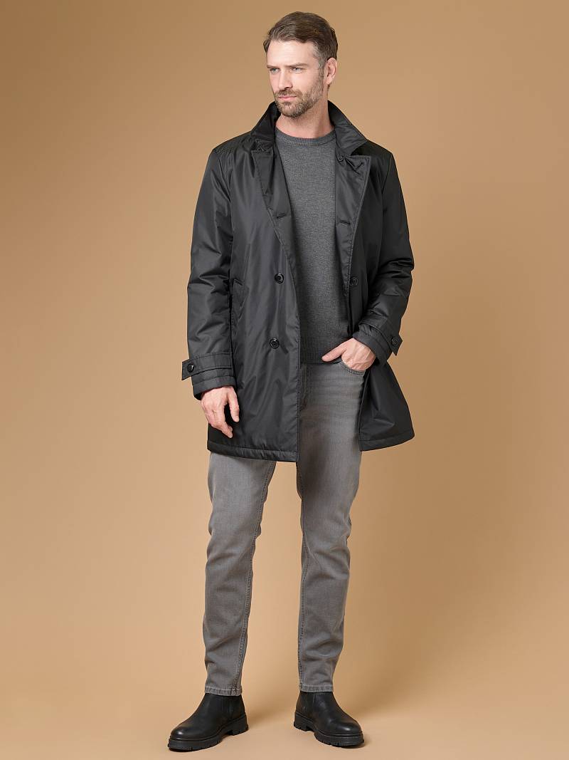 Плащ мужской утепленный, двубортный, с застежкой на пуговицы. Воротник стойка. Полочка и спинка с отрезными кокетками. Боковые наклонные карманы - прорезные с листочкой. Рукав втачной двухшовный, в нижней части хлястик на пуговице. Спинка с центральным швом и шлицей. На подкладке два внутренних кармана на пуговицах. Длина спинки для роста 176 - 90см. Ткань верха: 100%полиэстер. Подкладка: 100%полиэстер. Утеплитель: термоплюс 40гр